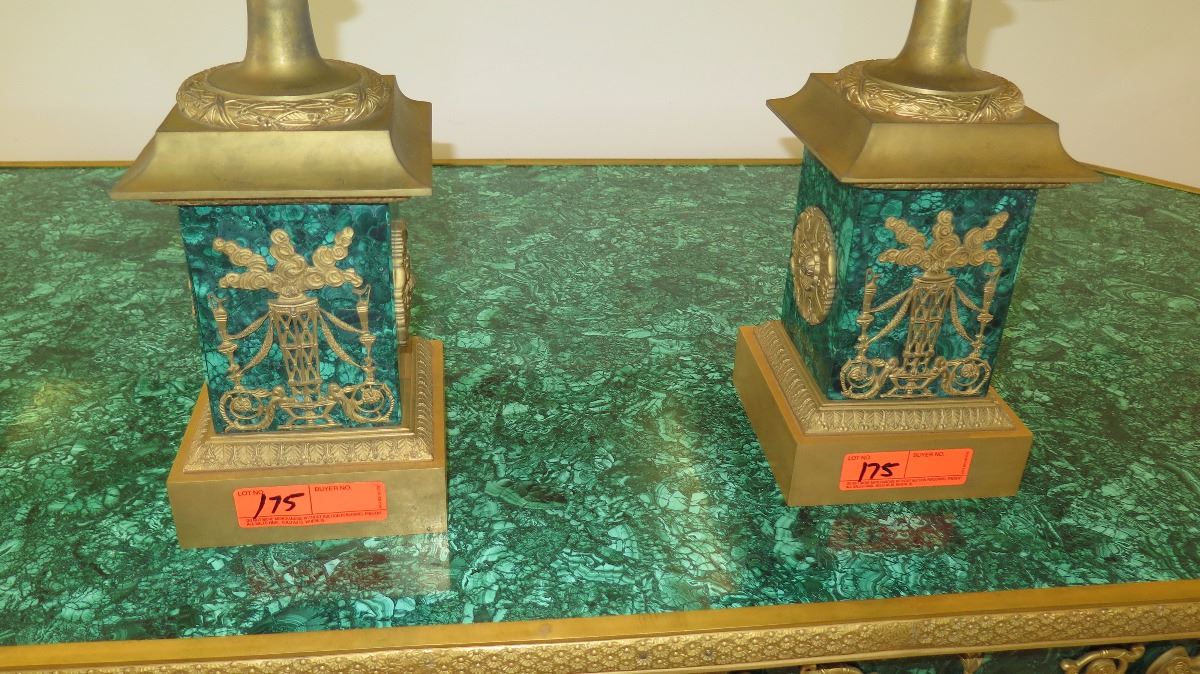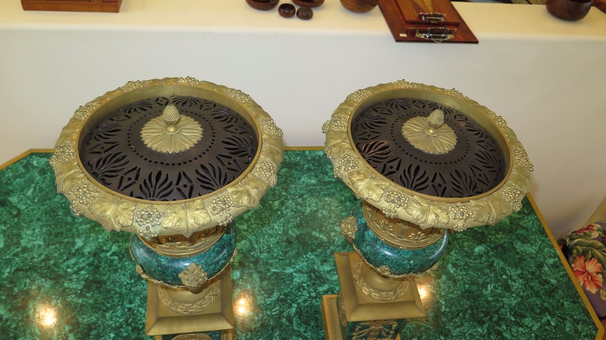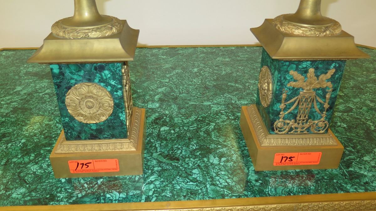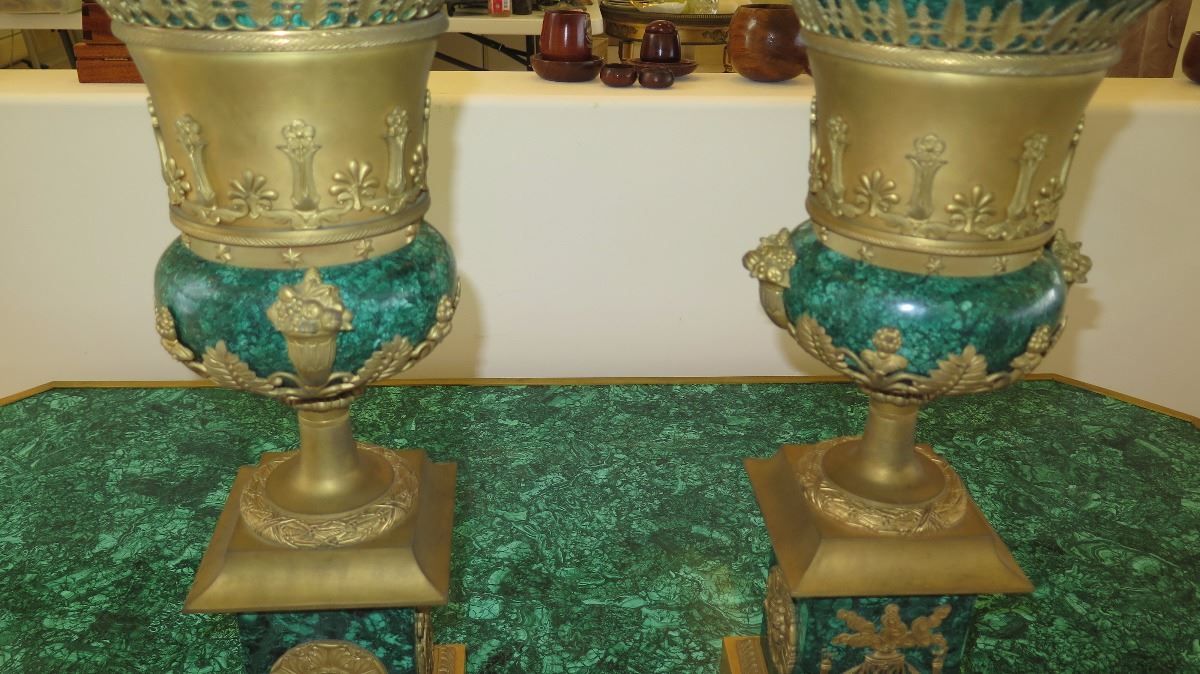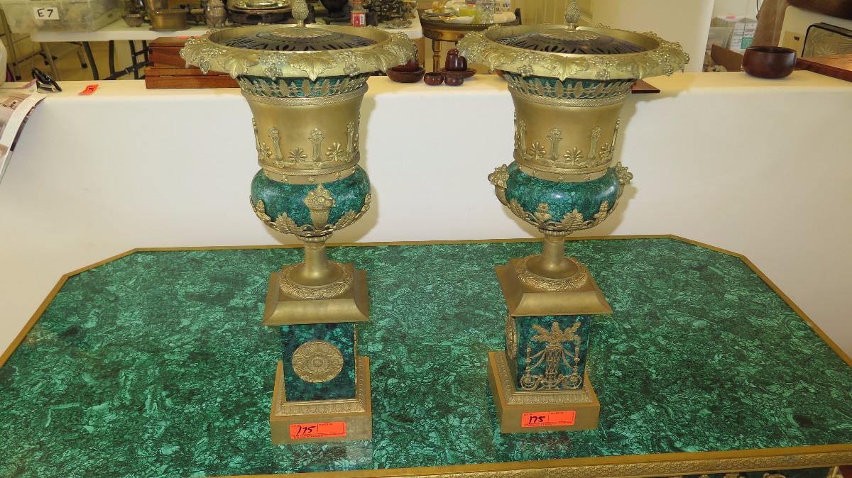 Pair: Large Brass Cast Chalice w/Ornate Gilt Relief and Faux Malachite Overlay 24" H