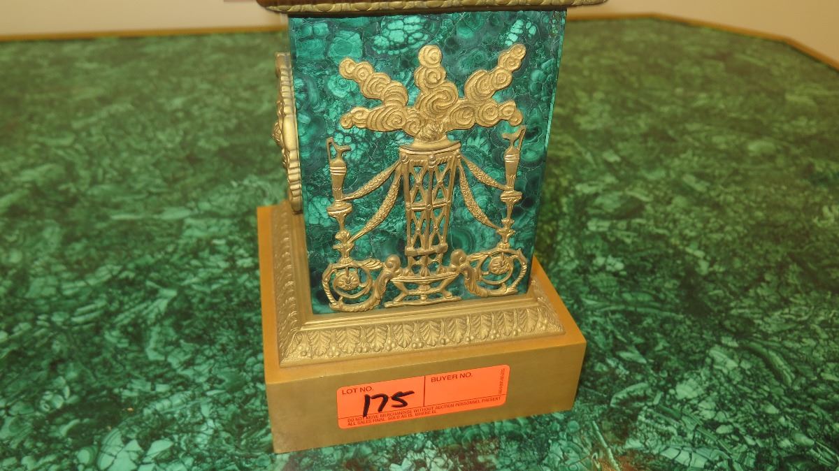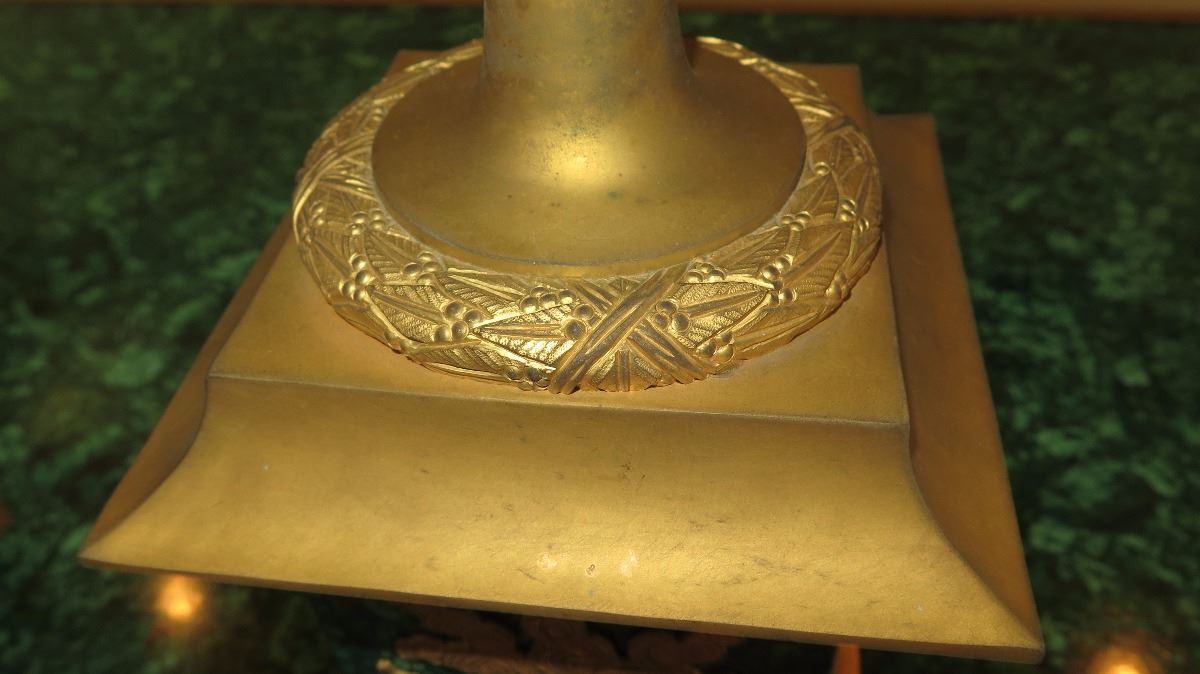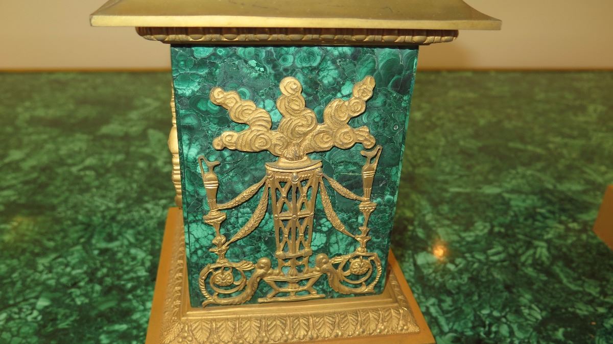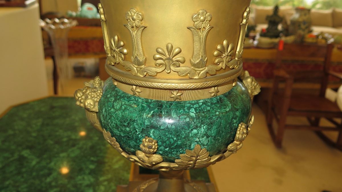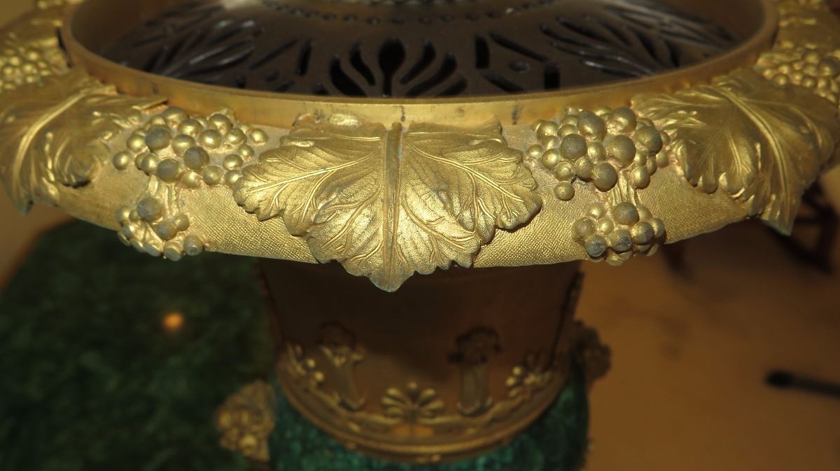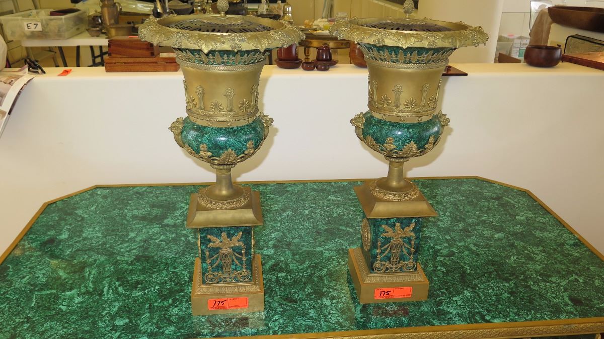 Pair: Large Brass Cast Chalice w/Ornate Gilt Relief and Faux Malachite Overlay 24" H