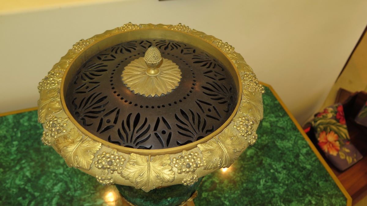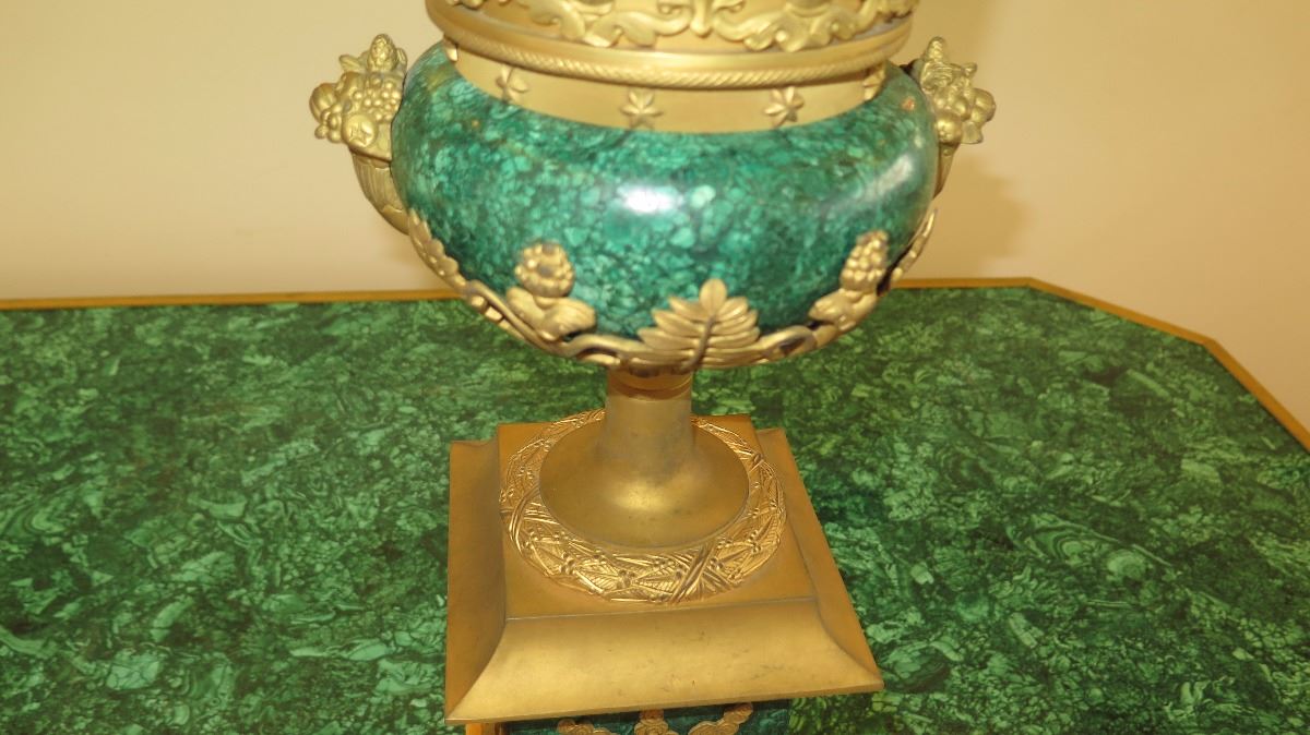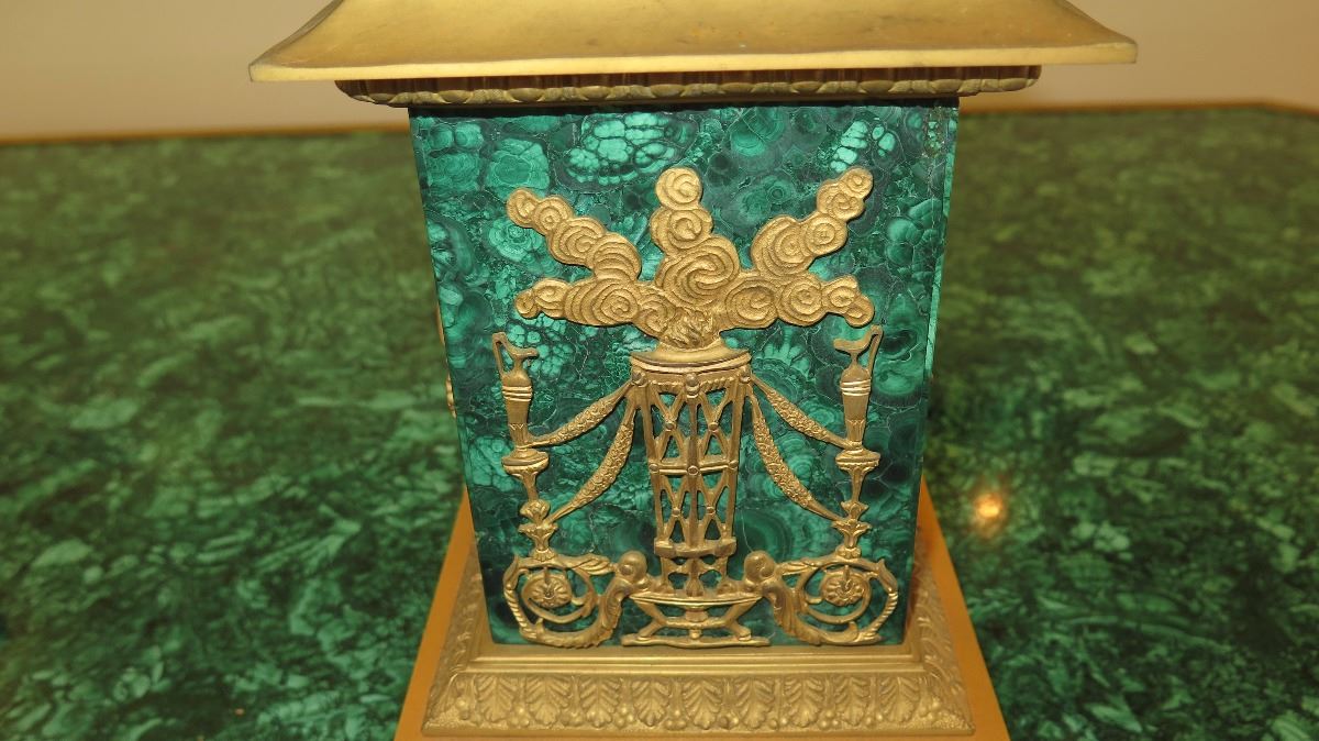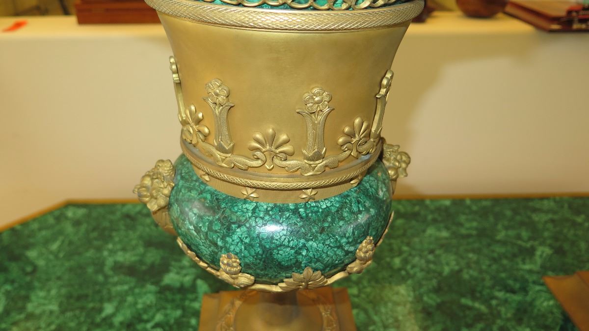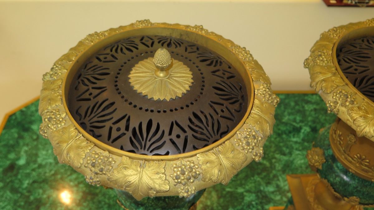 Pair: Large Brass Cast Chalice w/Ornate Gilt Relief and Faux Malachite Overlay 24" H