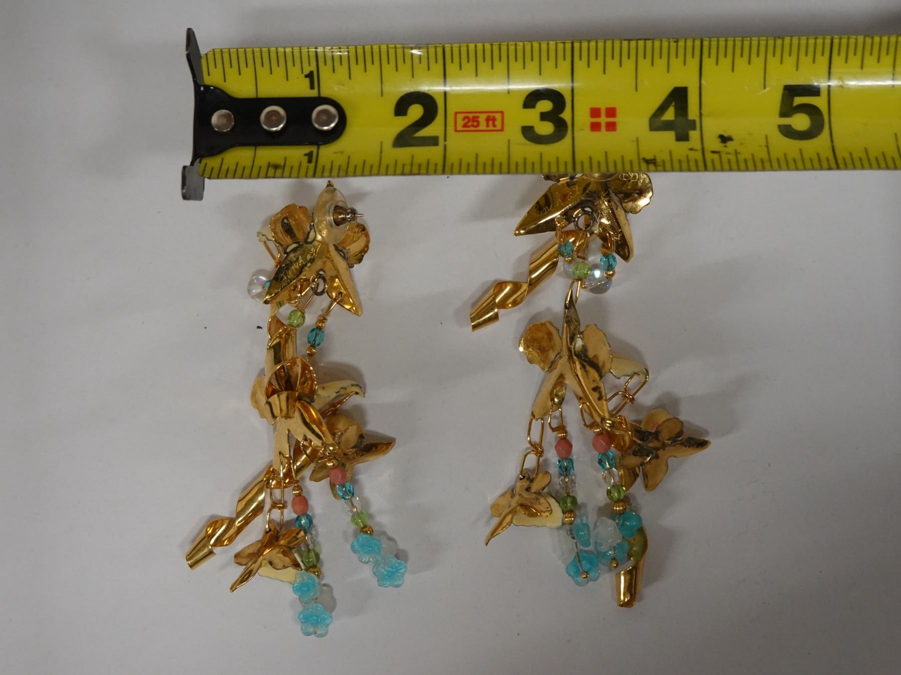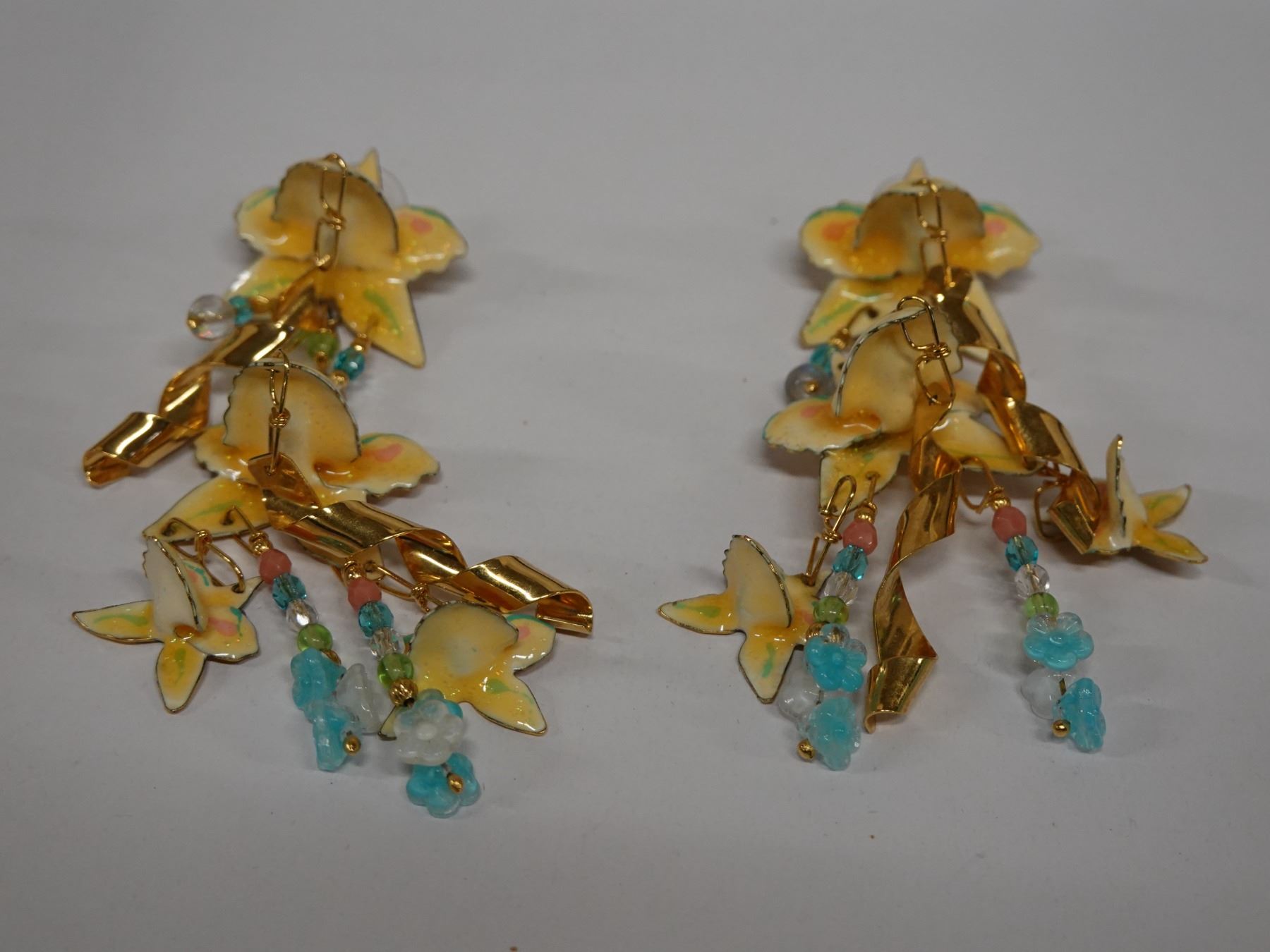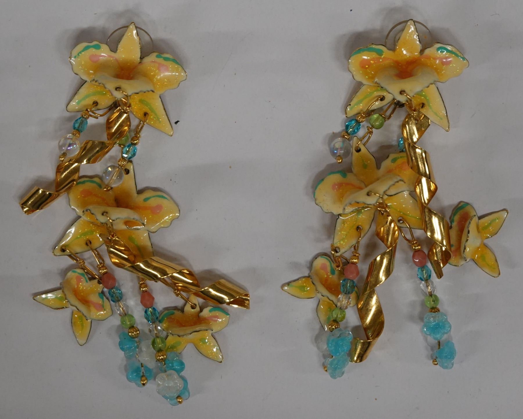 Pair Large Vintage Lunch at the Ritz Earrings w/ Hawaiian Orchids Design, Signed & Dated 1985?, 3.5"L