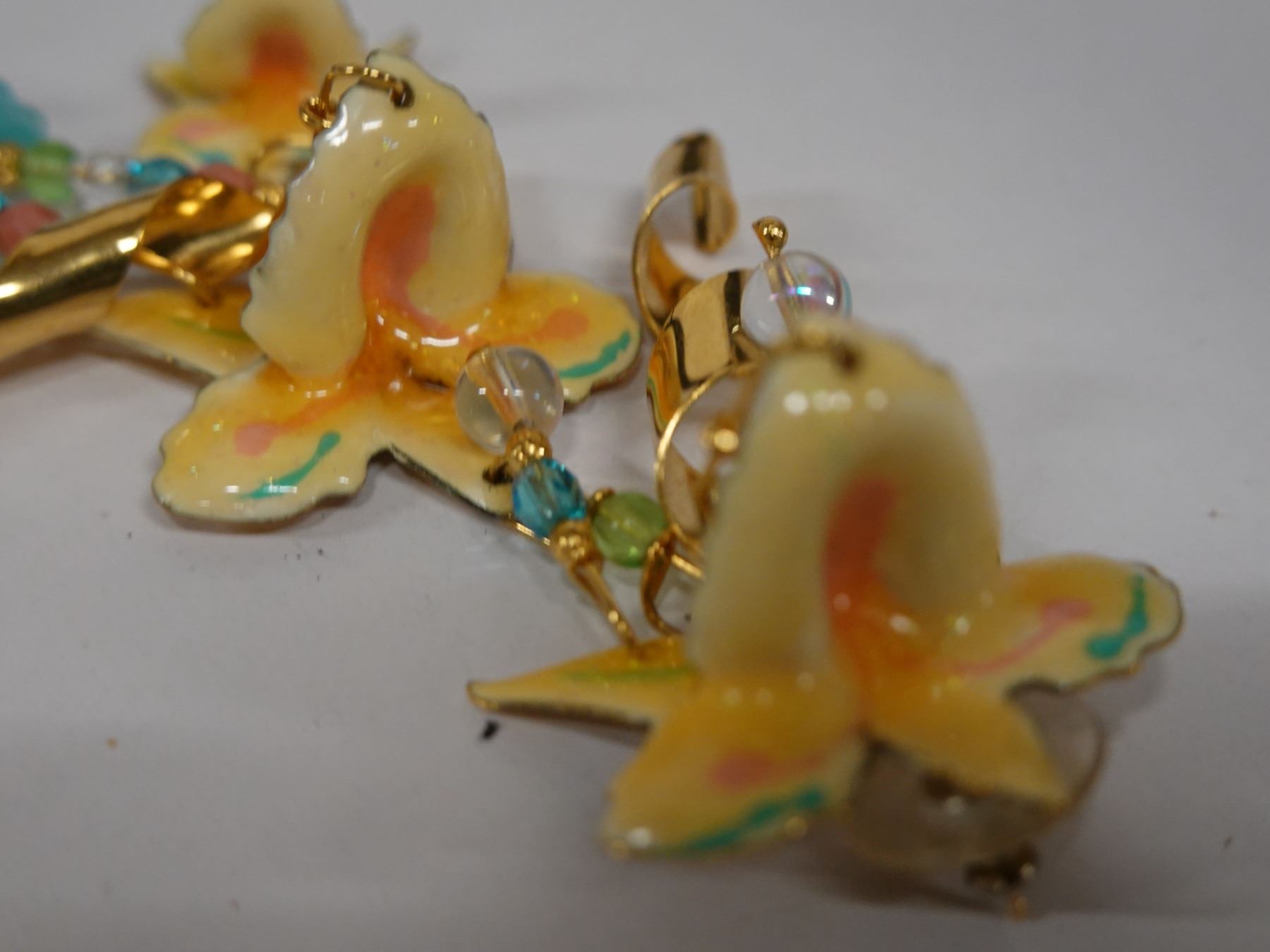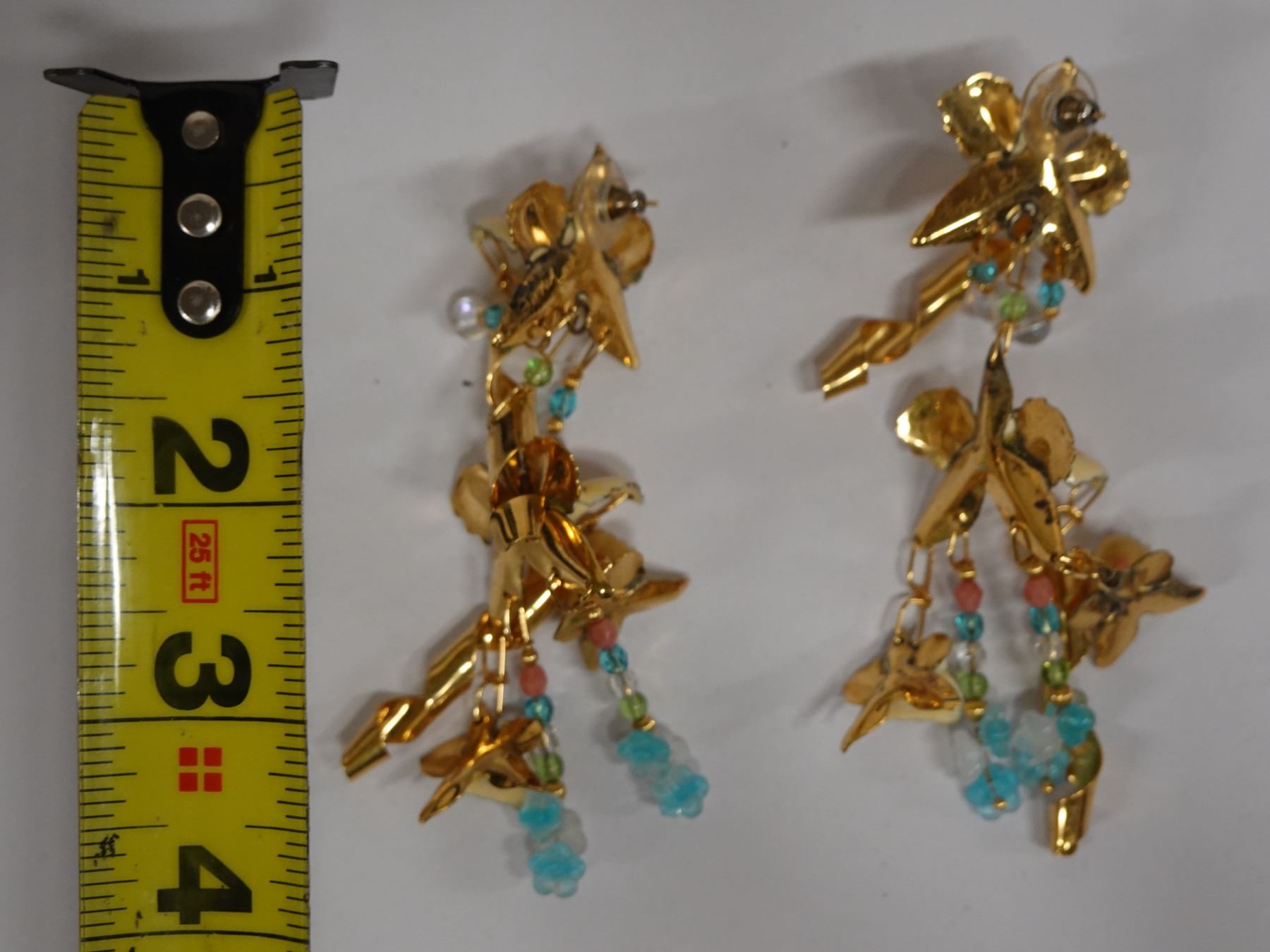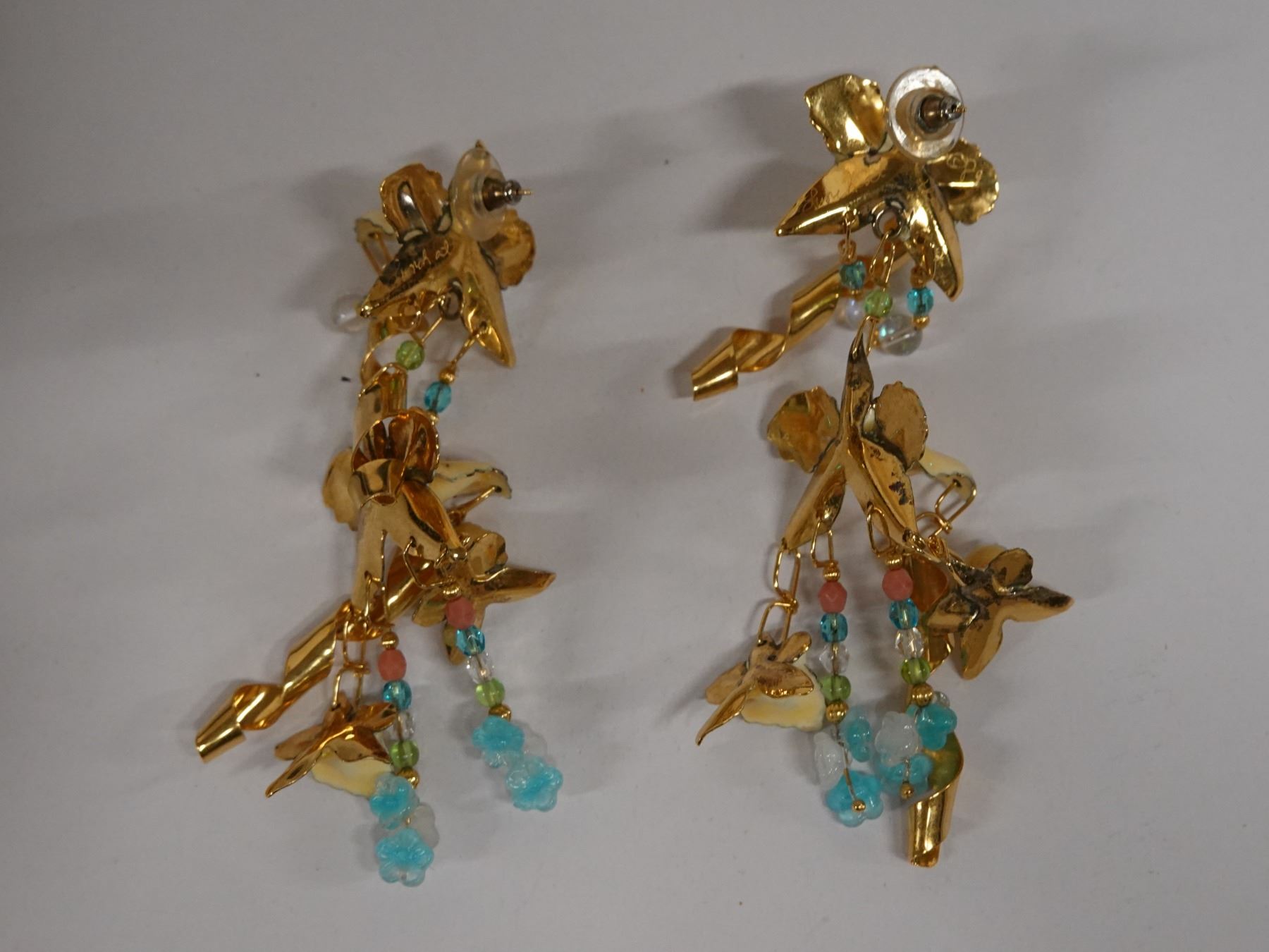 Pair Large Vintage Lunch at the Ritz Earrings w/ Hawaiian Orchids Design, Signed & Dated 1985?, 3.5"L