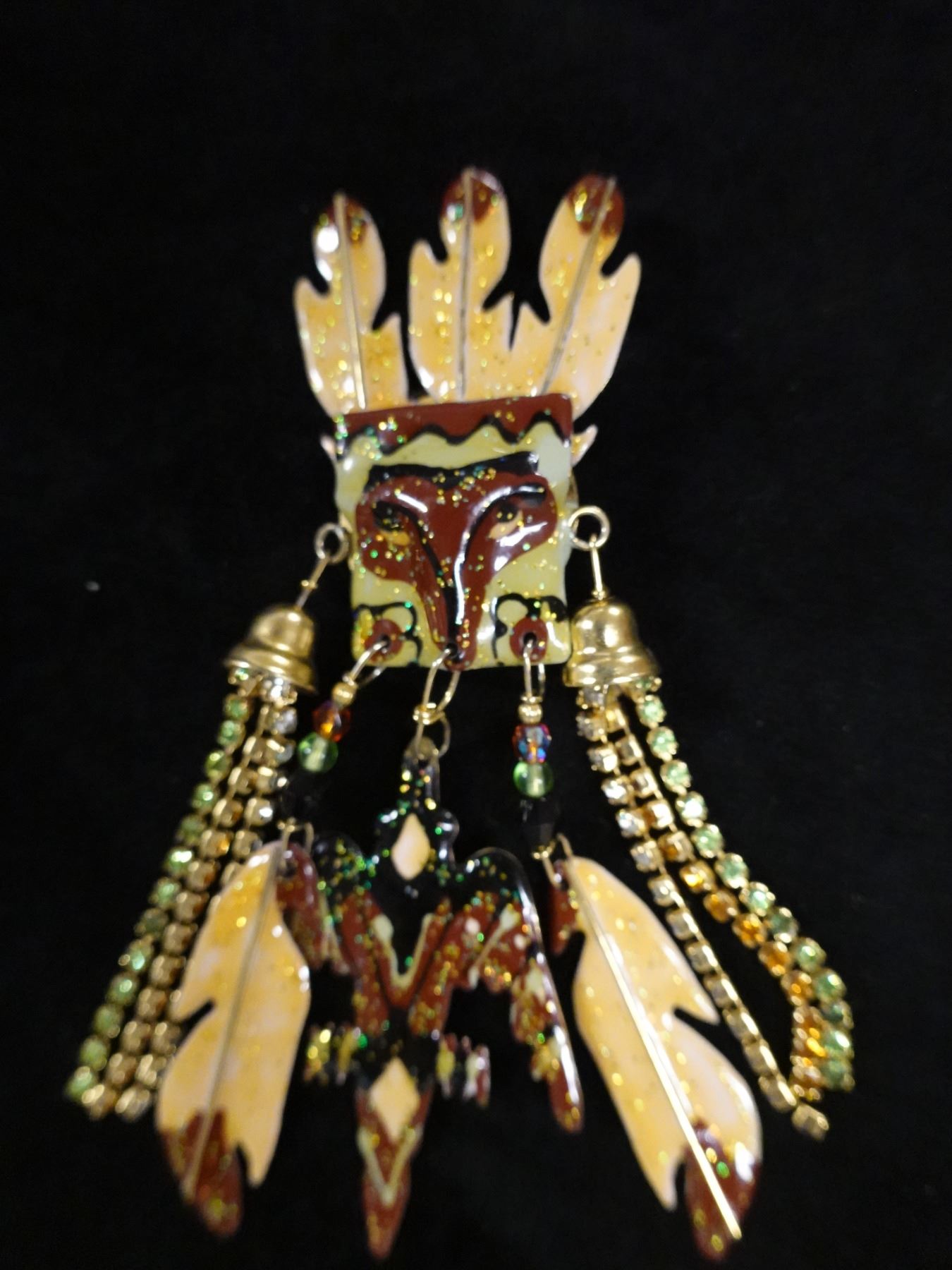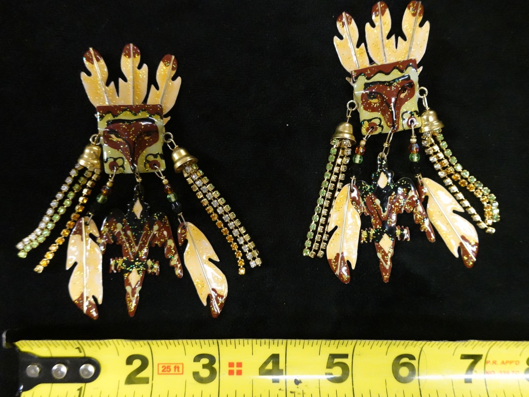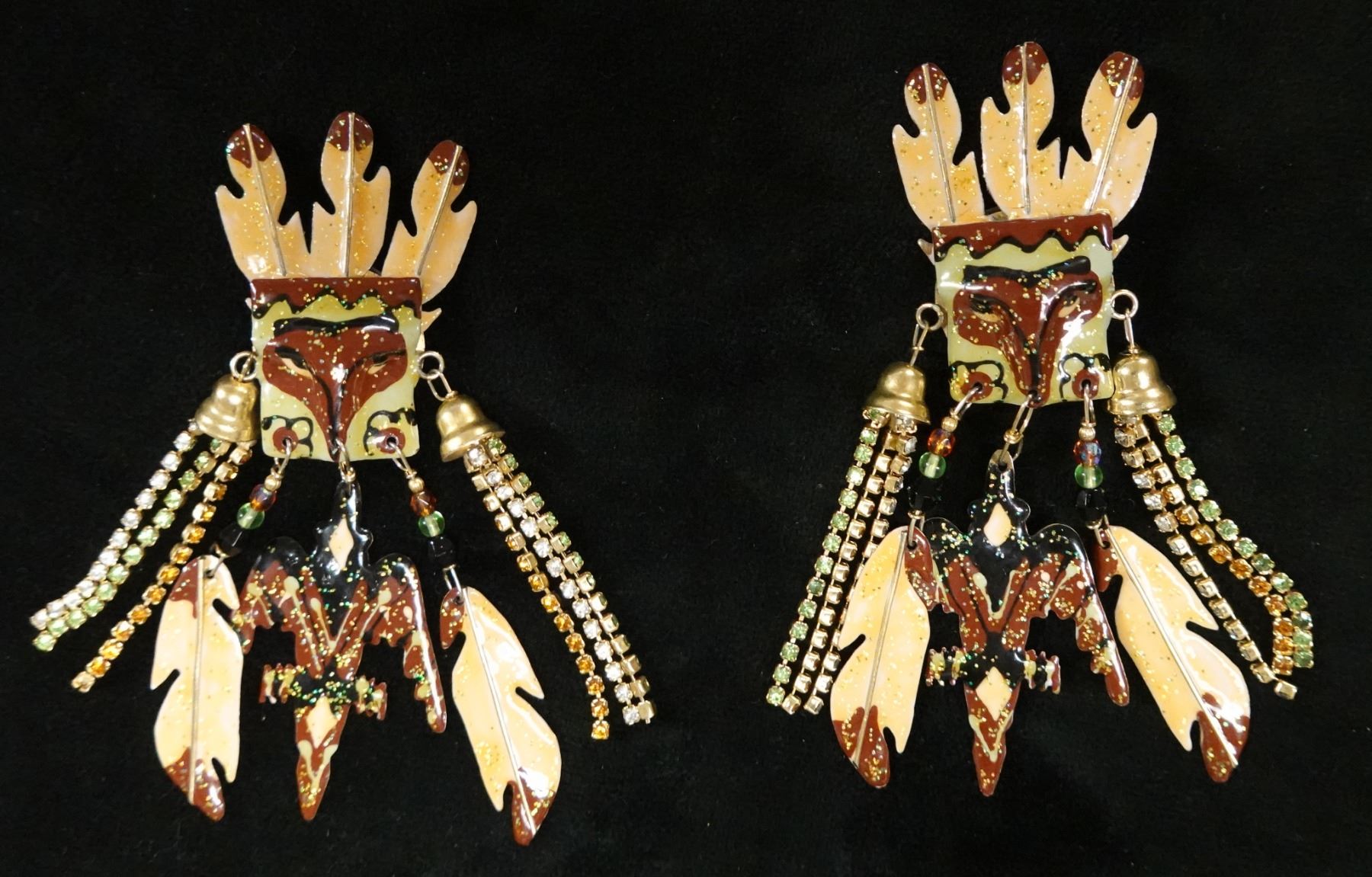 Pair Large Vintage Lunch at the Ritz Earrings w/ Tribal Mask Design, Signed & Dated 1985?, 3.5" x 4"