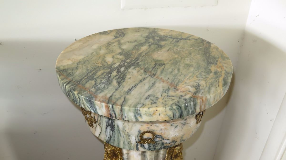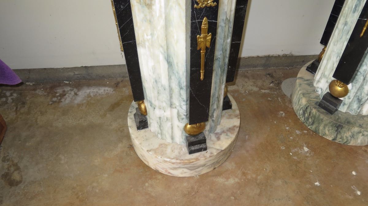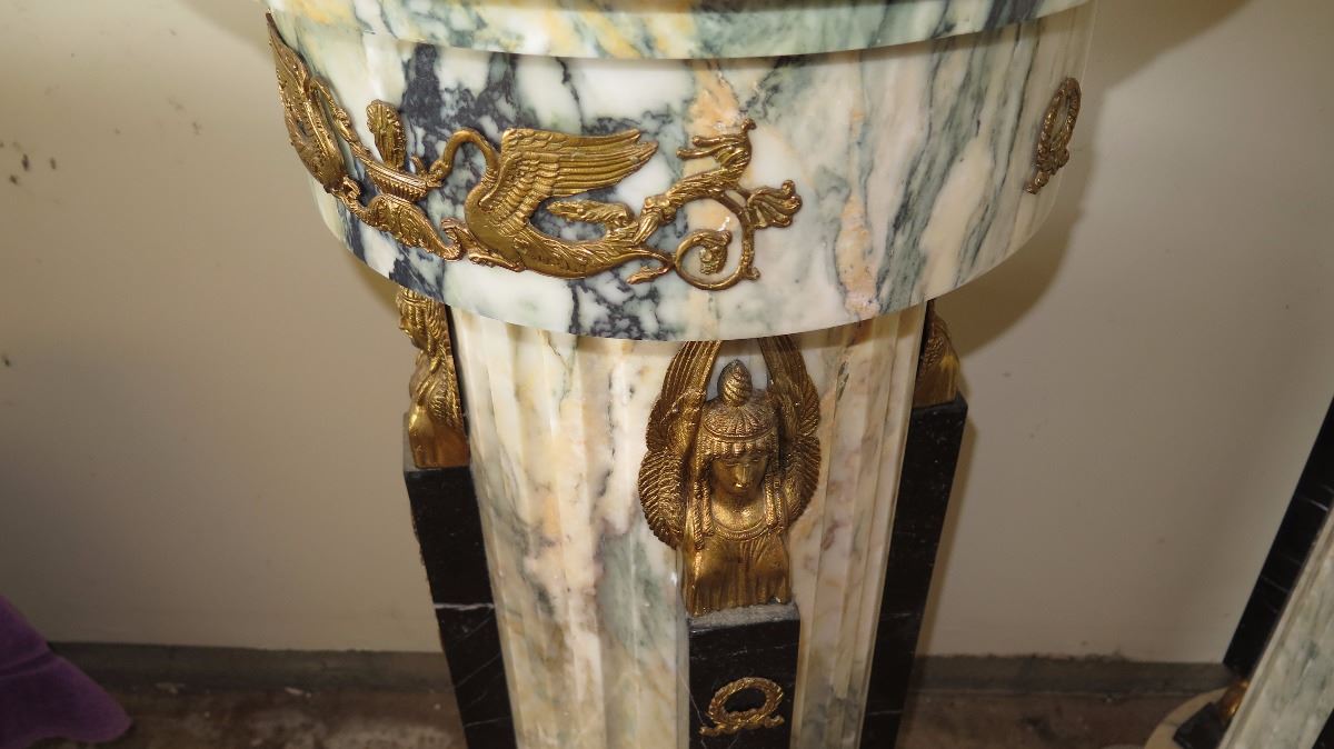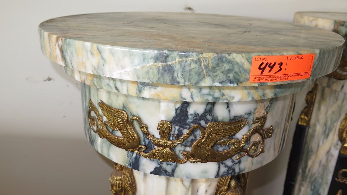 Pair: Solid Veined Marble Pedestals - Carved, Ormolu Details - 43" H, 19" dia.