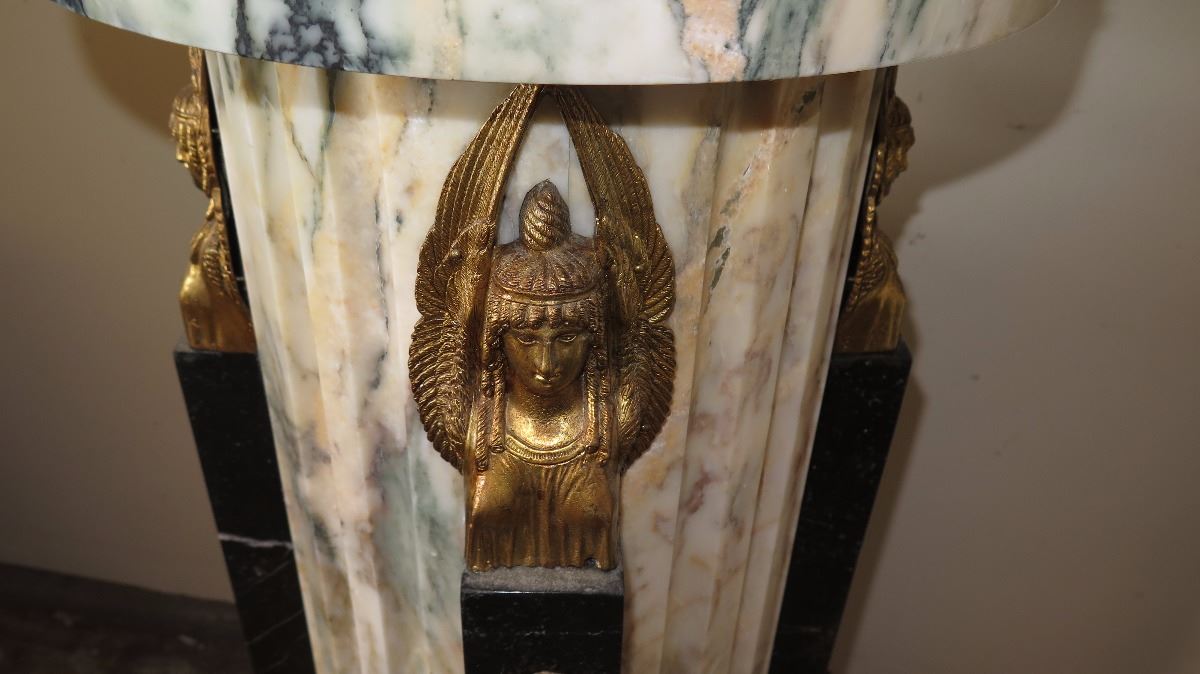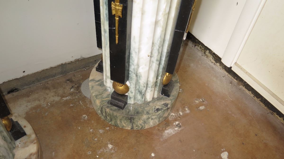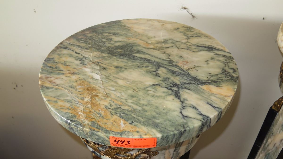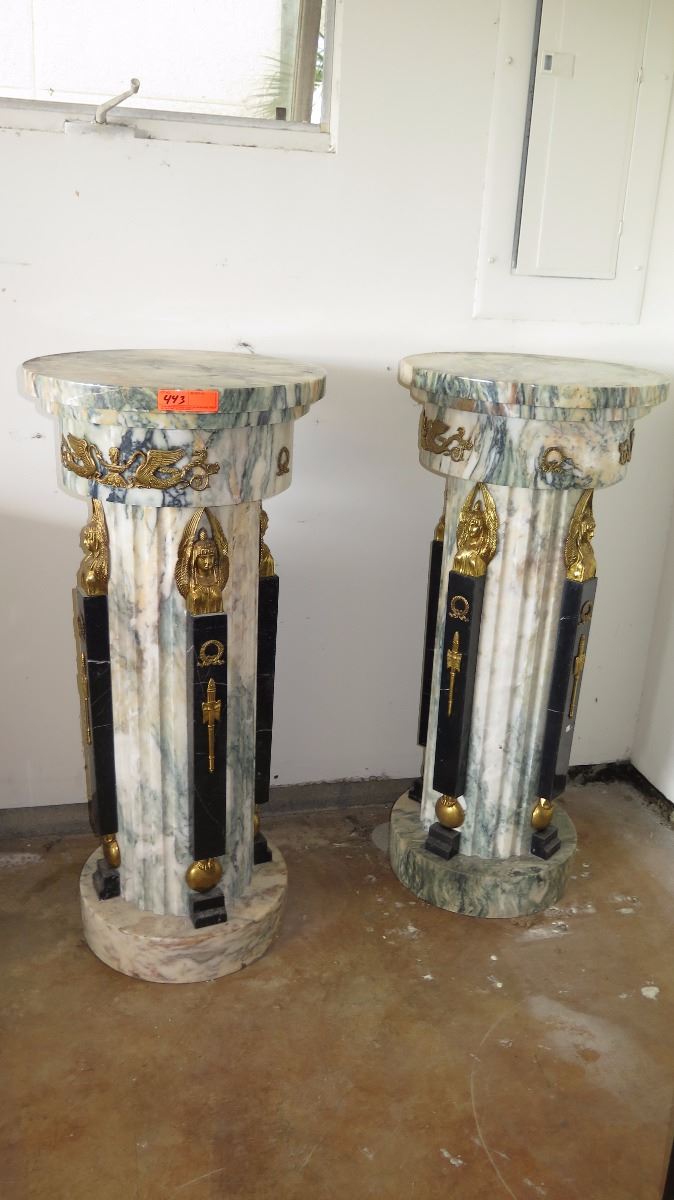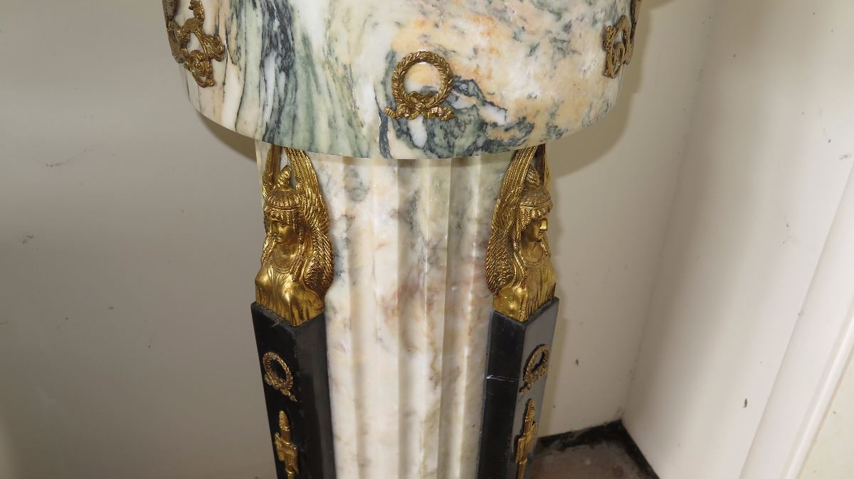 Pair: Solid Veined Marble Pedestals - Carved, Ormolu Details - 43" H, 19" dia.