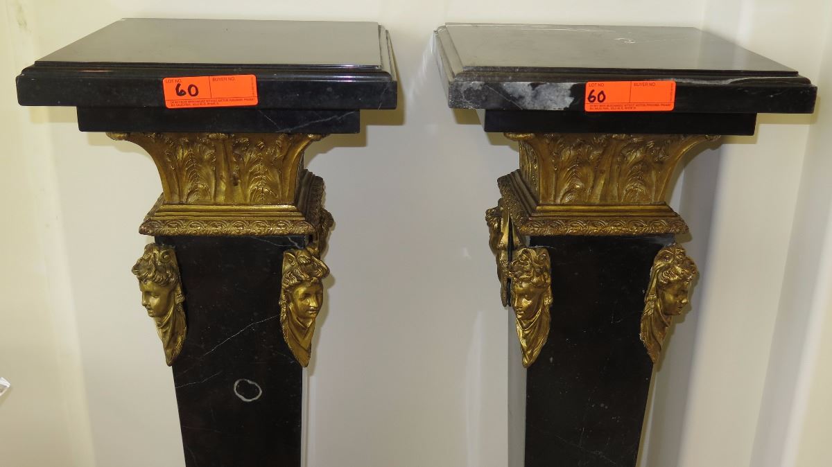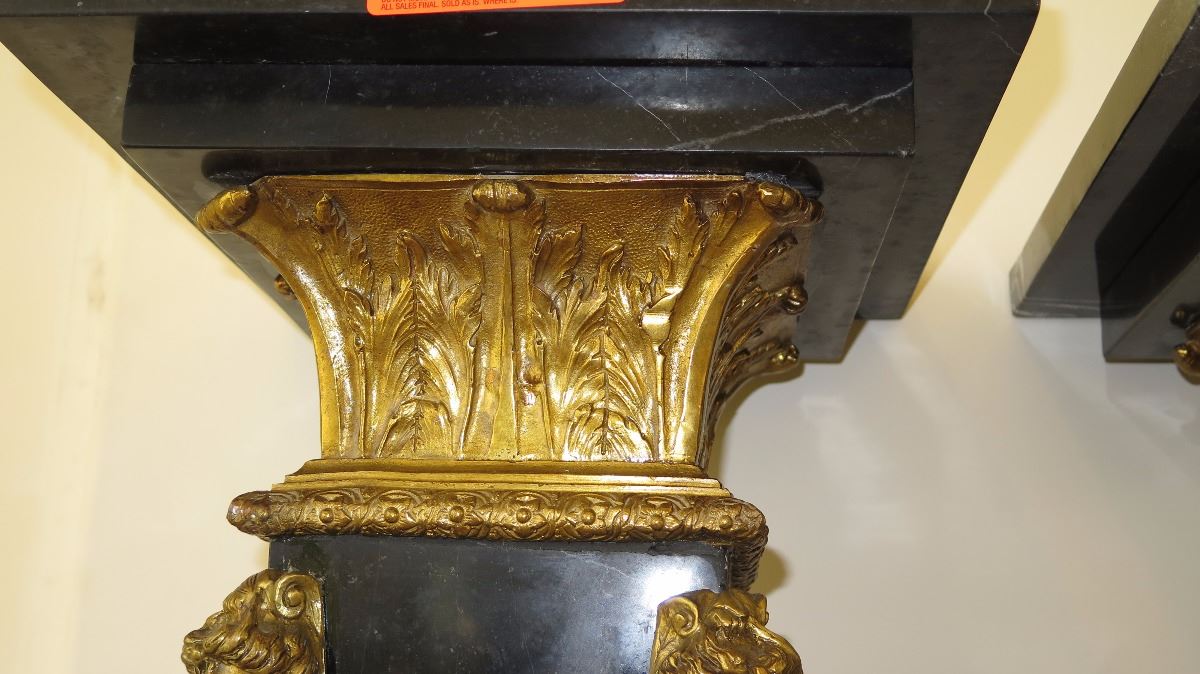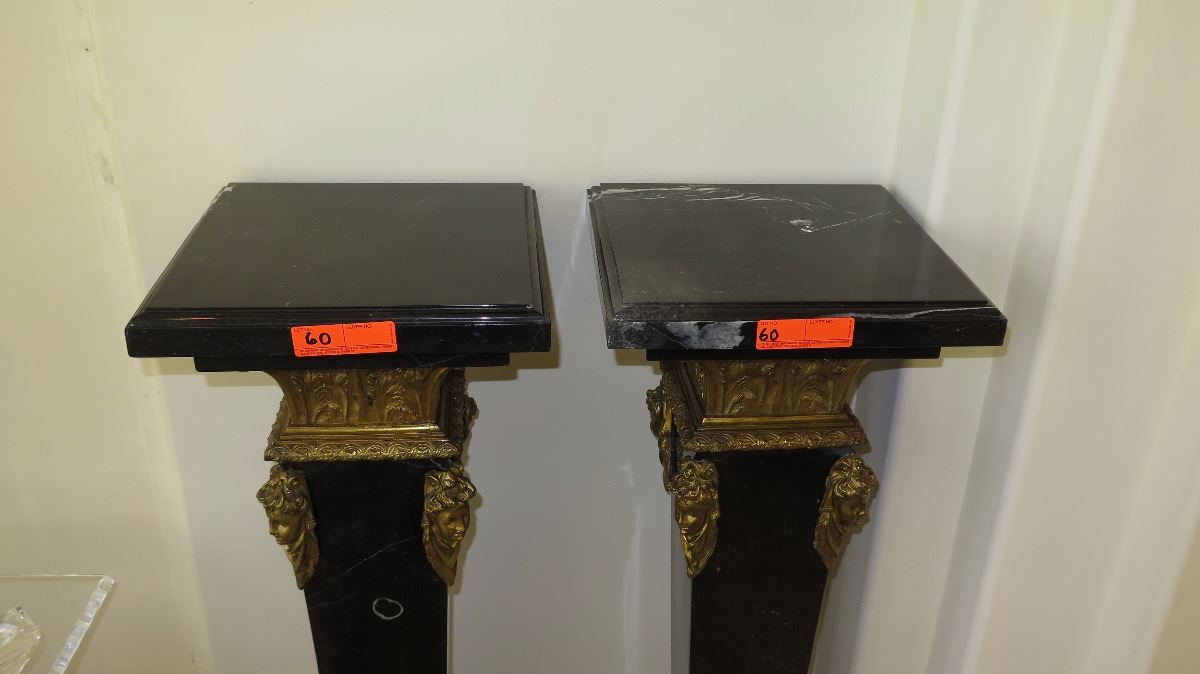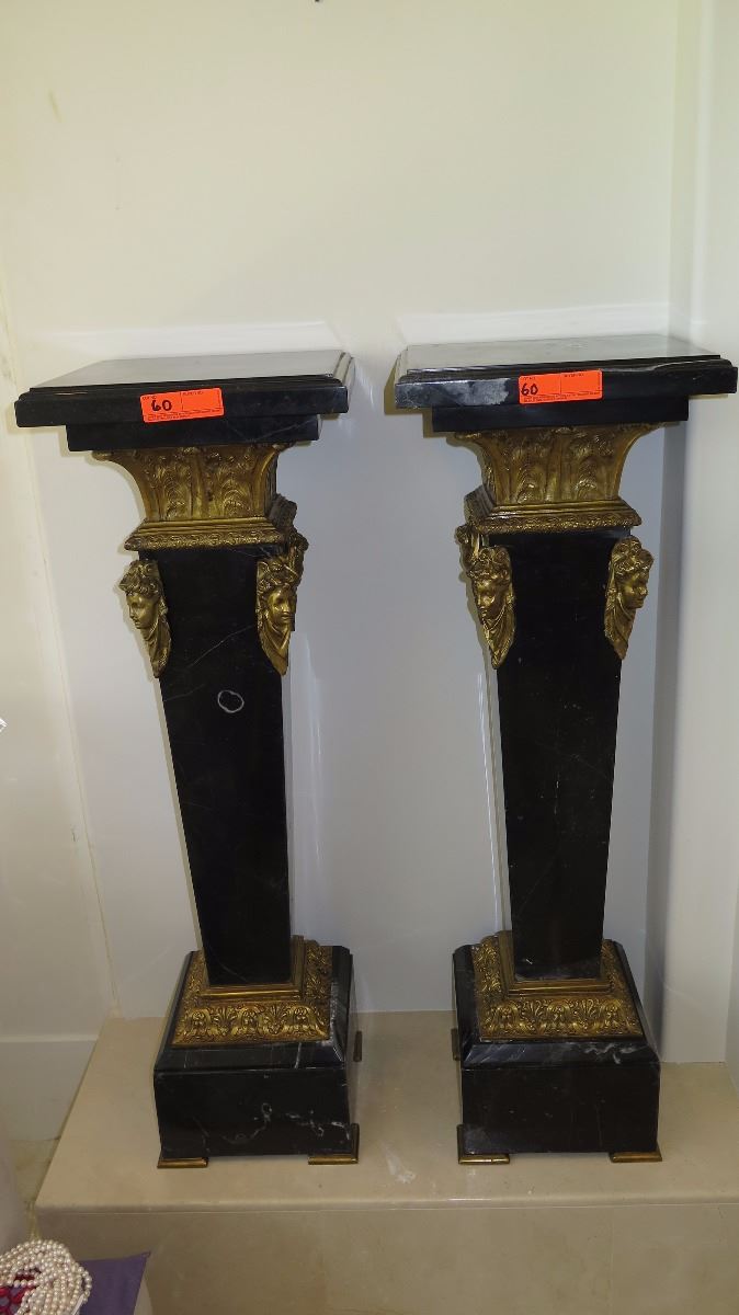 Pair: Tall Black Marble Column Pedestals w/Gilt Relief - Approx. 43" Tall. Top surface approx. 14X14.