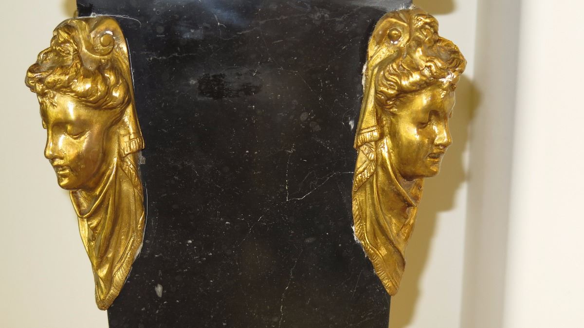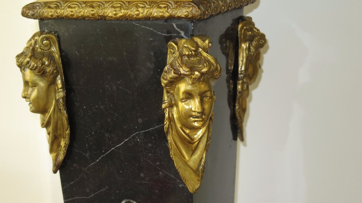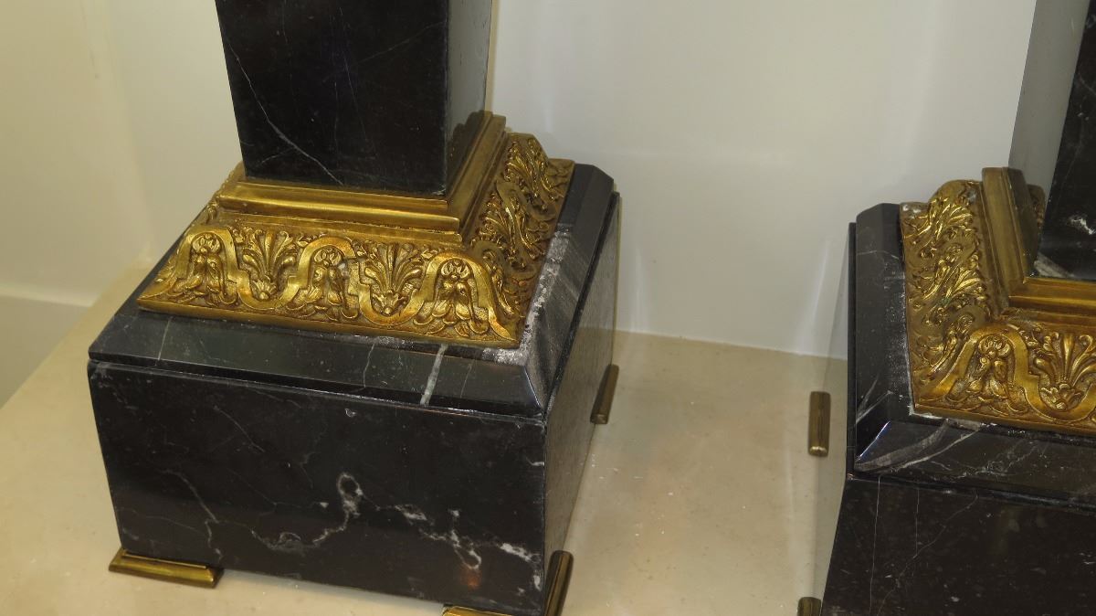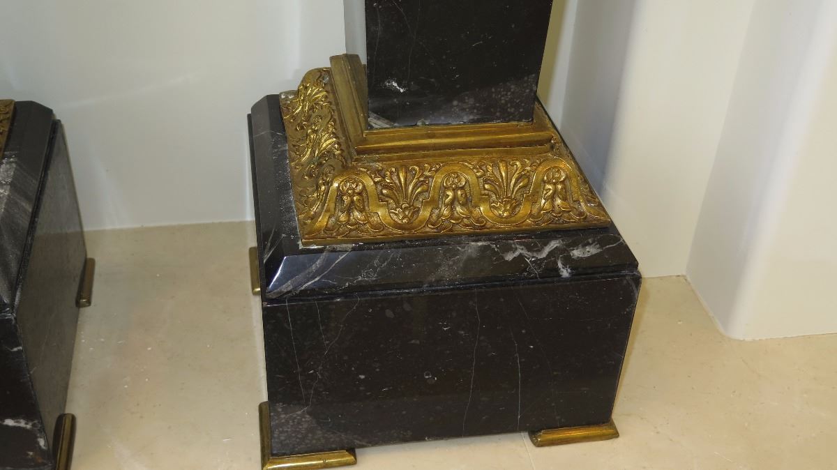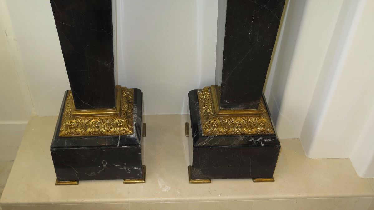 Pair: Tall Black Marble Column Pedestals w/Gilt Relief - Approx. 43" Tall