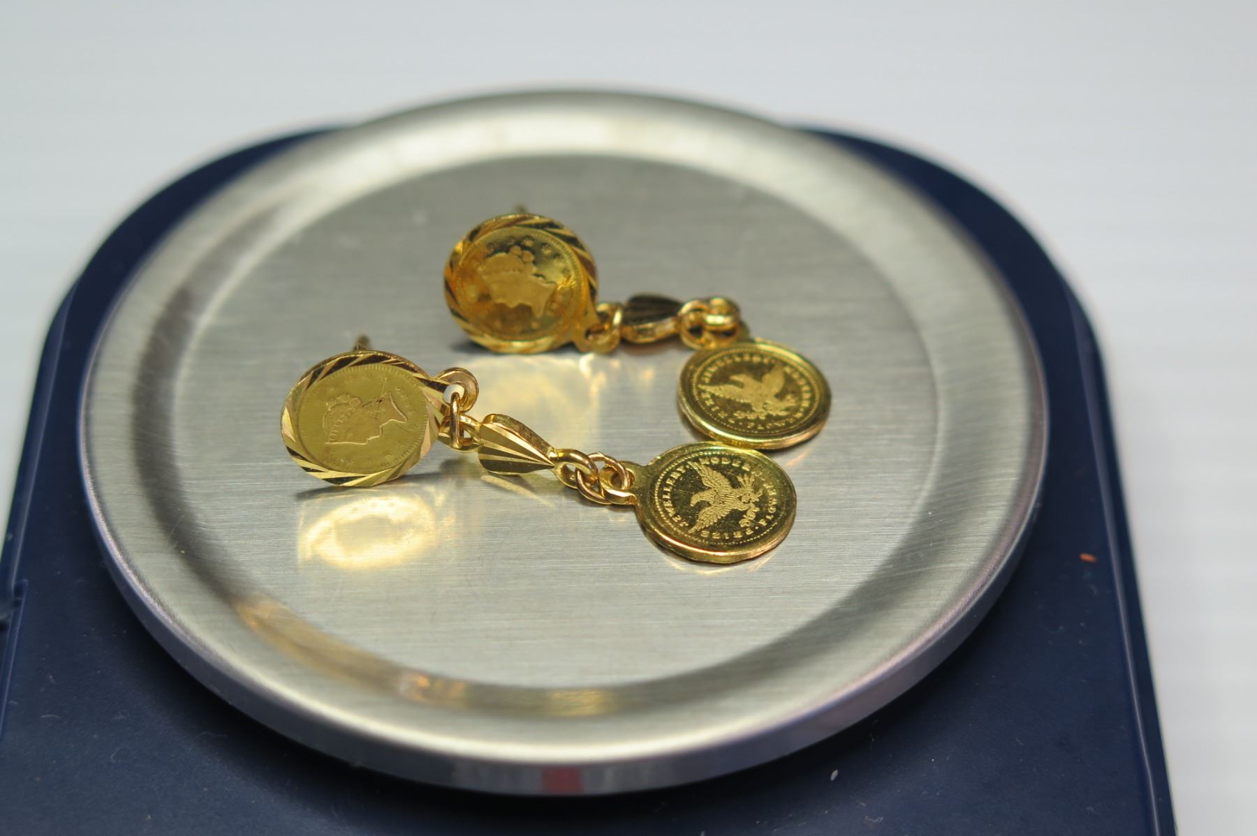 Pair of 18K Gold Coin Dangle Earrings, Approx. 4.41 Grams
