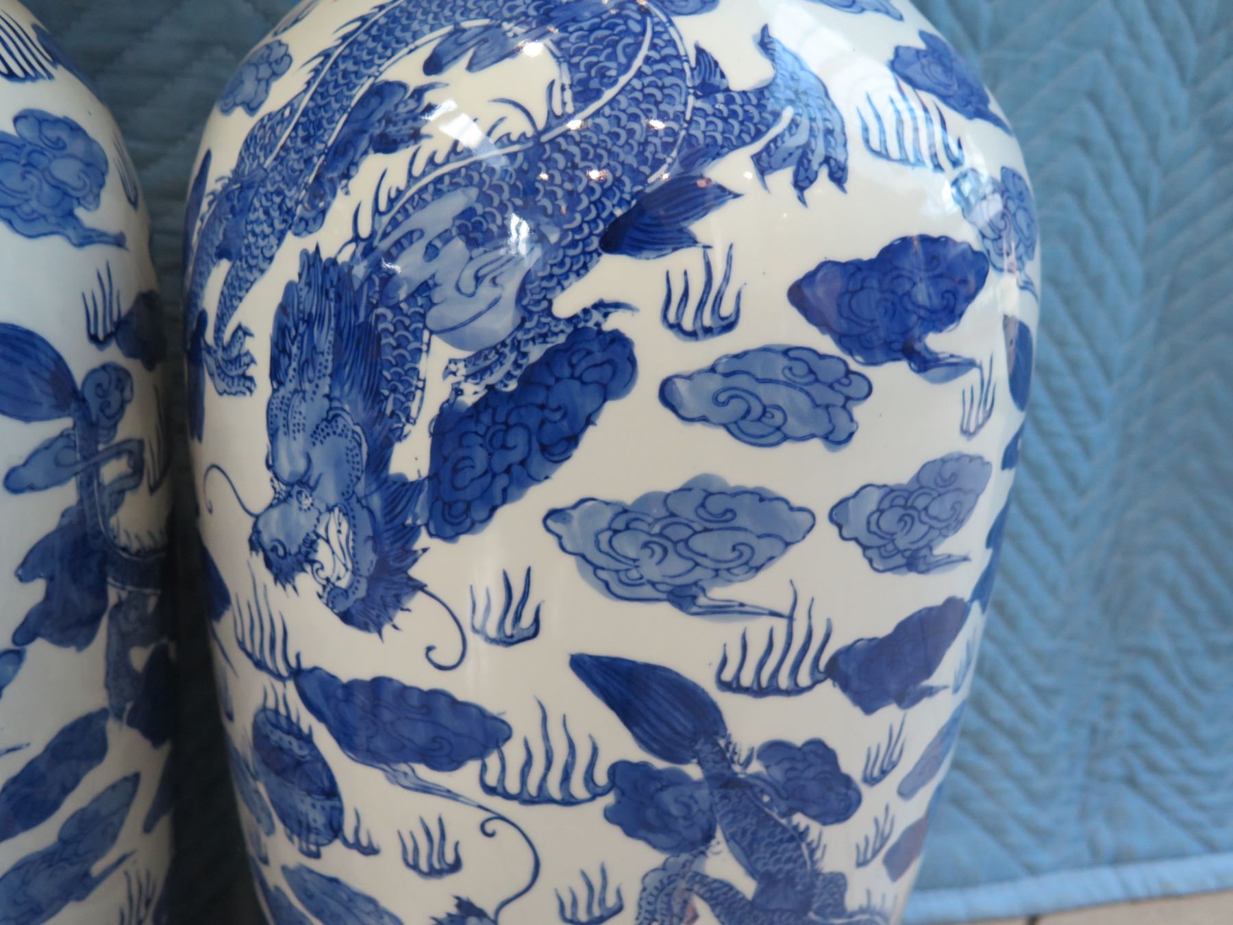 Pair of 2 Tall Blue & White Porcelain Vases 29" H, 8" Dia. From Hawaii Kai estate