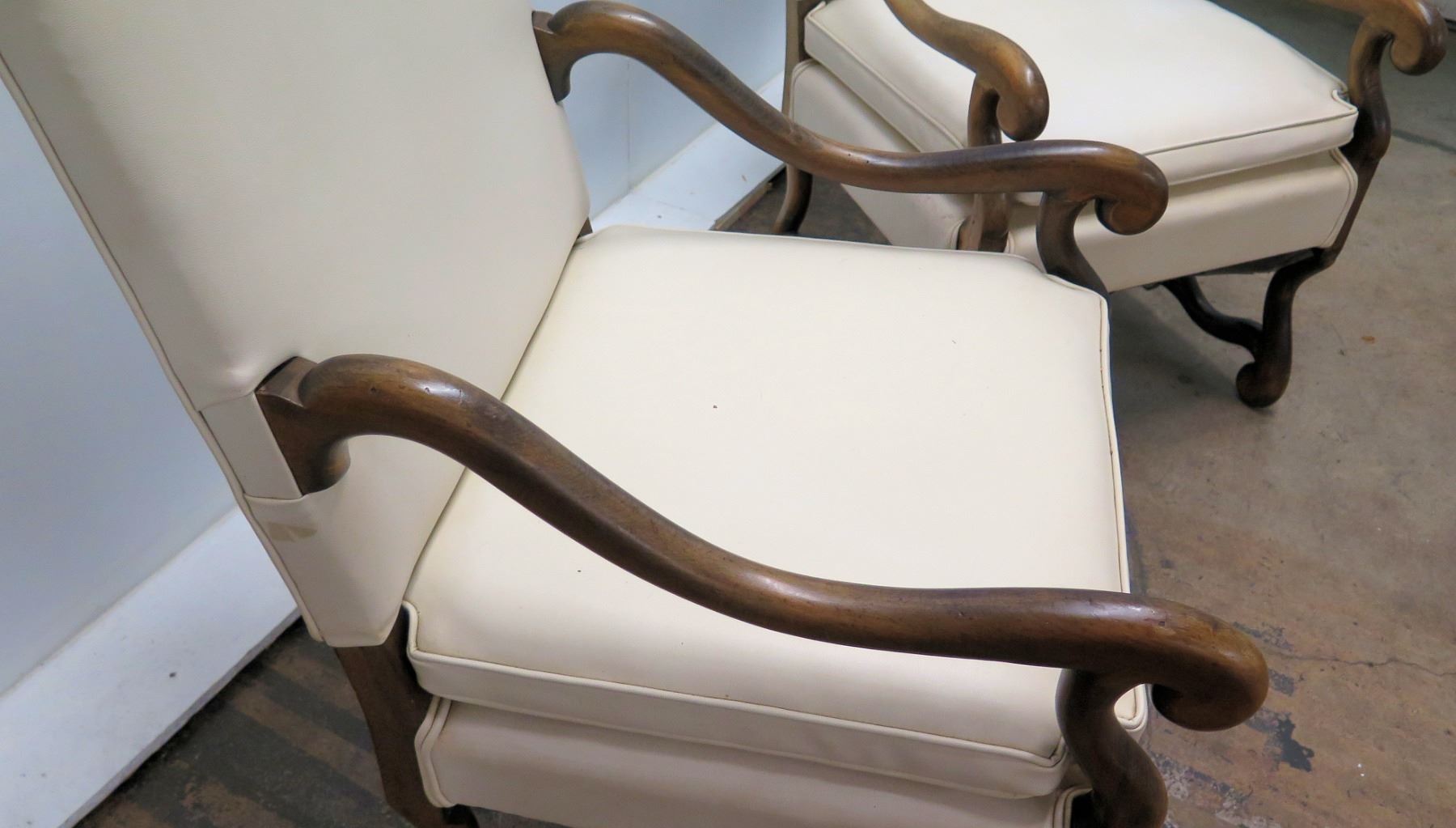 Pair of Antique Walnut Chairs, Upholstered White Vinyl, Serpentine Details 45" Back Ht. These can be seen in the real estate listing for Jim Nabor's home that was sold earlier this year. See last photo (chair shown at end of table).
