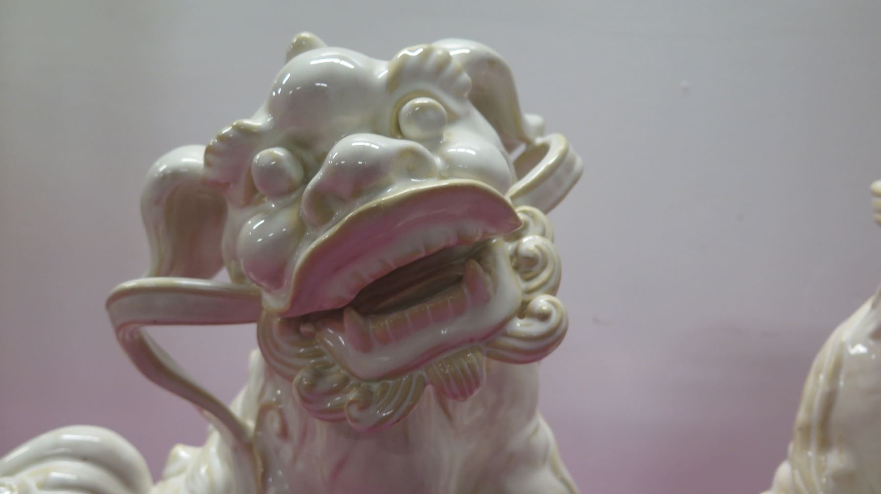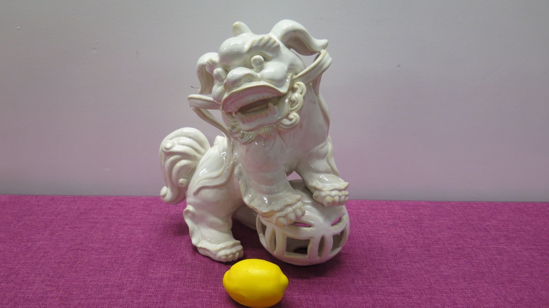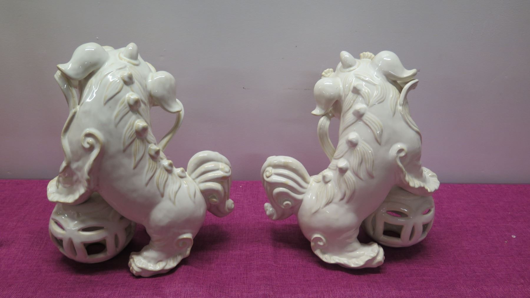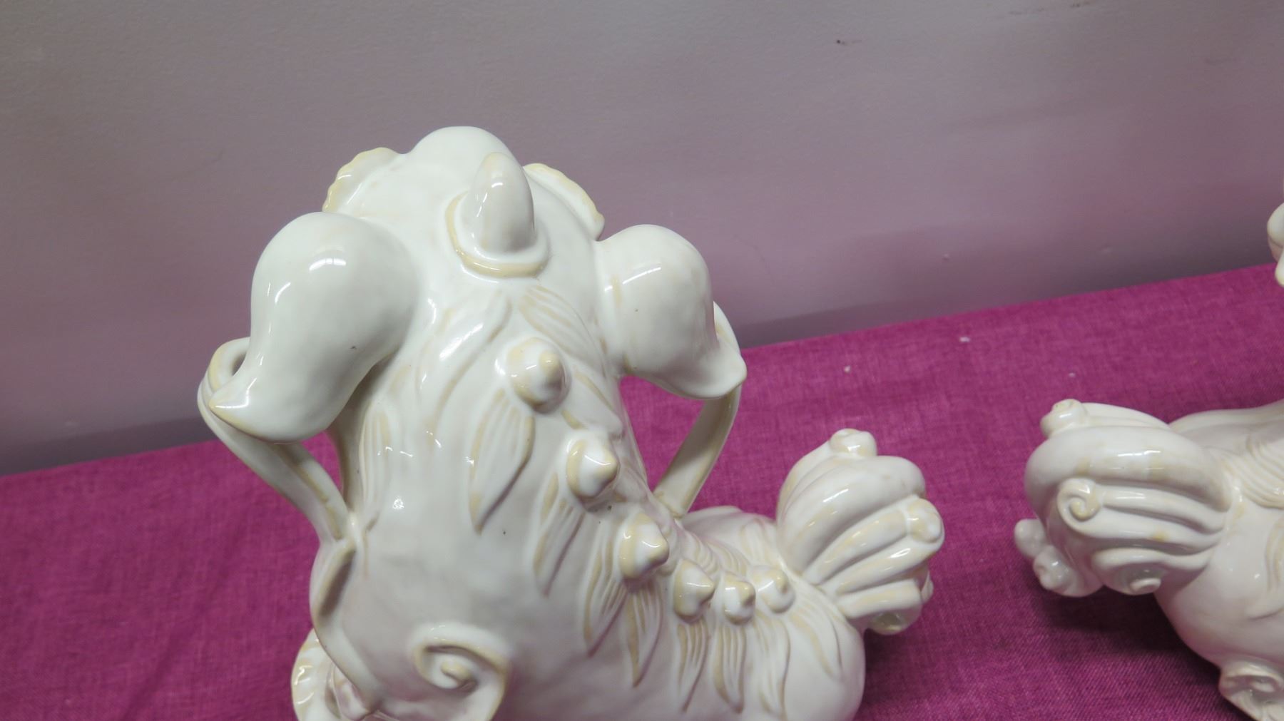 Pair of Glazed White Porcelain Foo Dog Chinese Guardian Lions 15" Tall