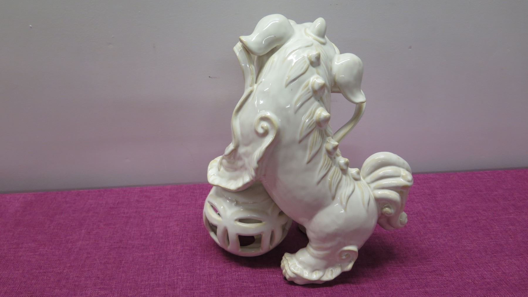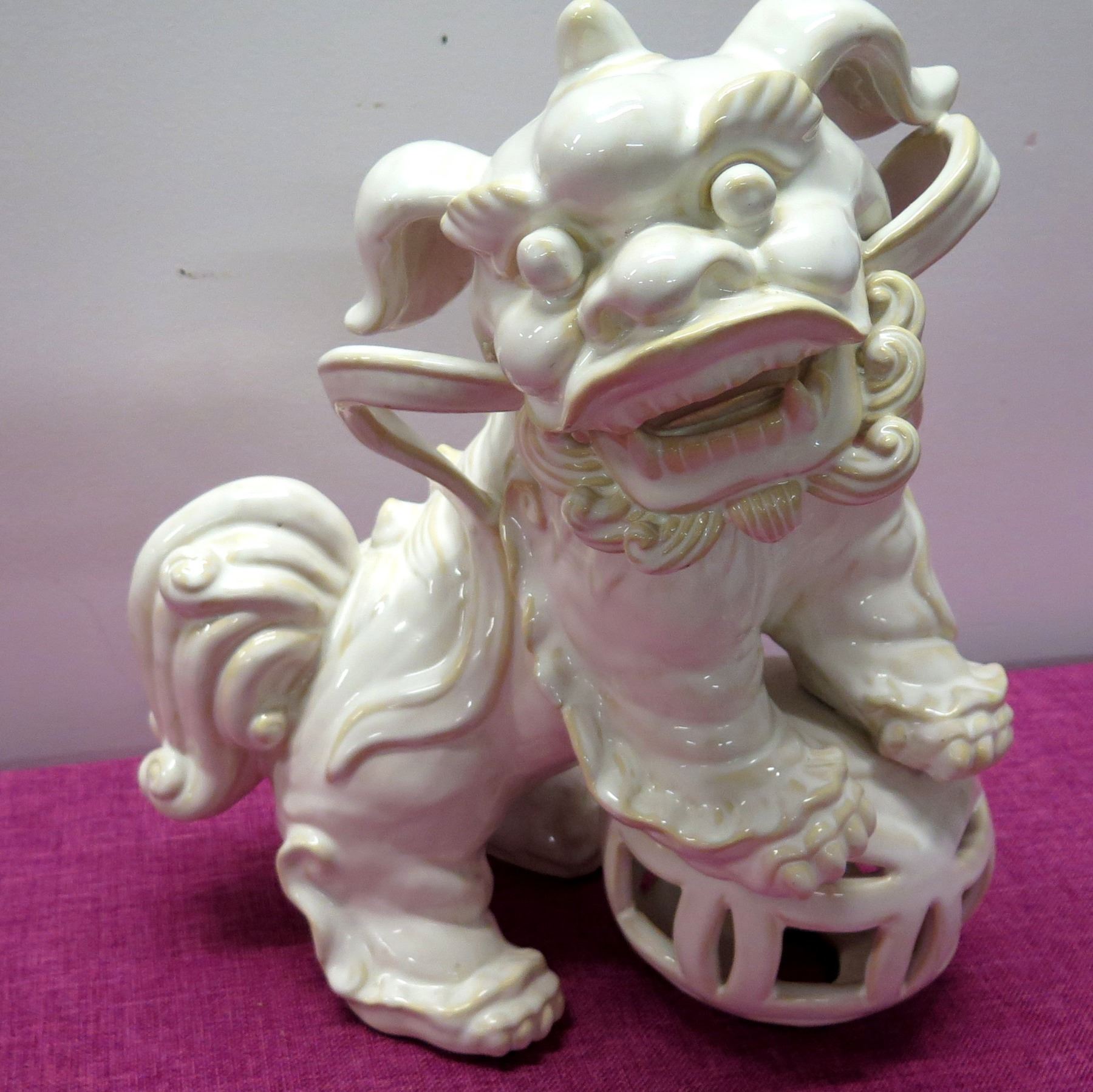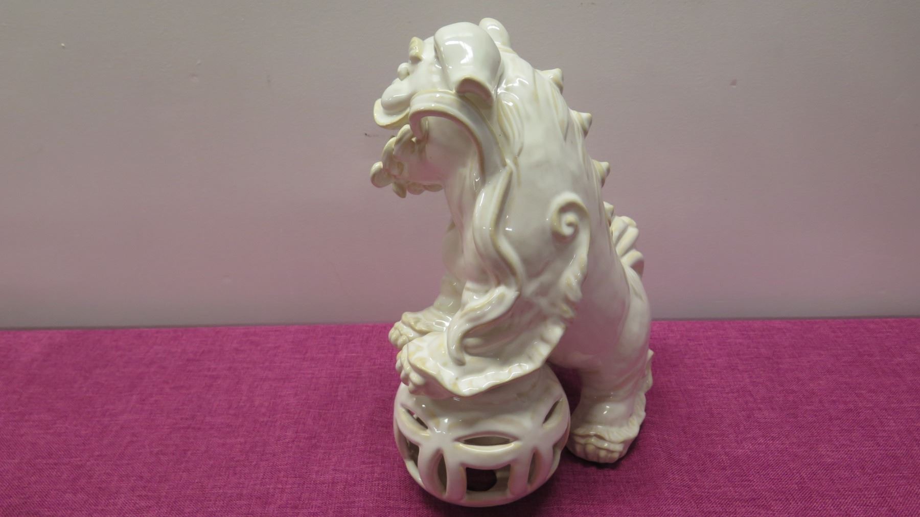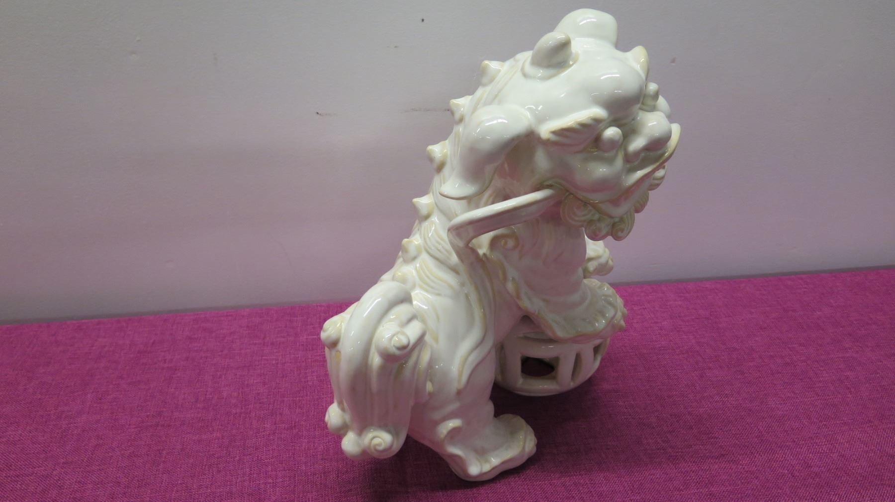 Pair of Glazed White Porcelain Foo Dog Chinese Guardian Lions 15" Tall