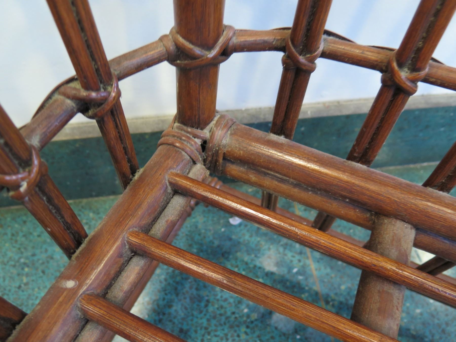 Pair of Rattan Chairs with Red & Black Damask Cushions 32"W x 21"D x 31"H