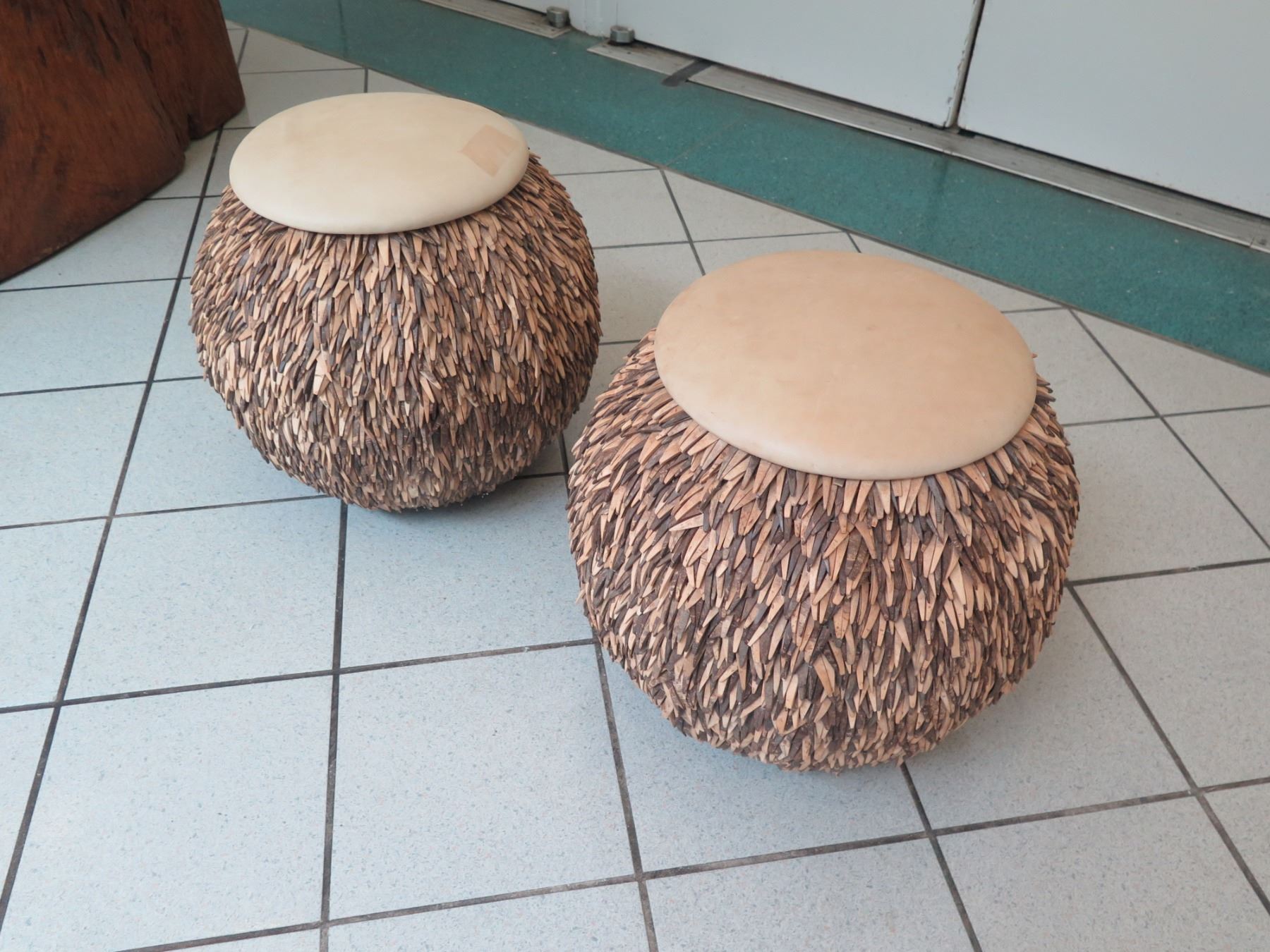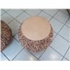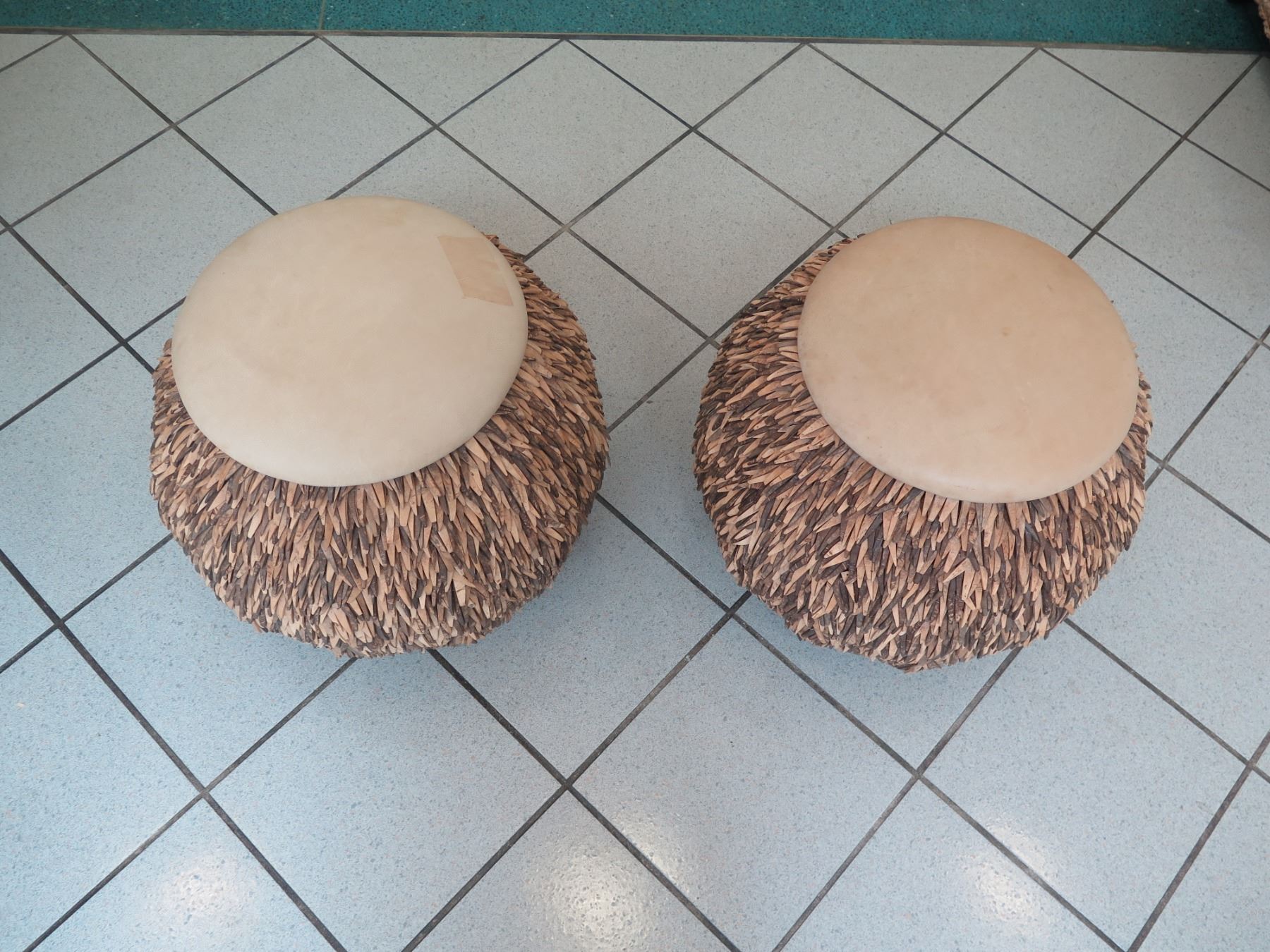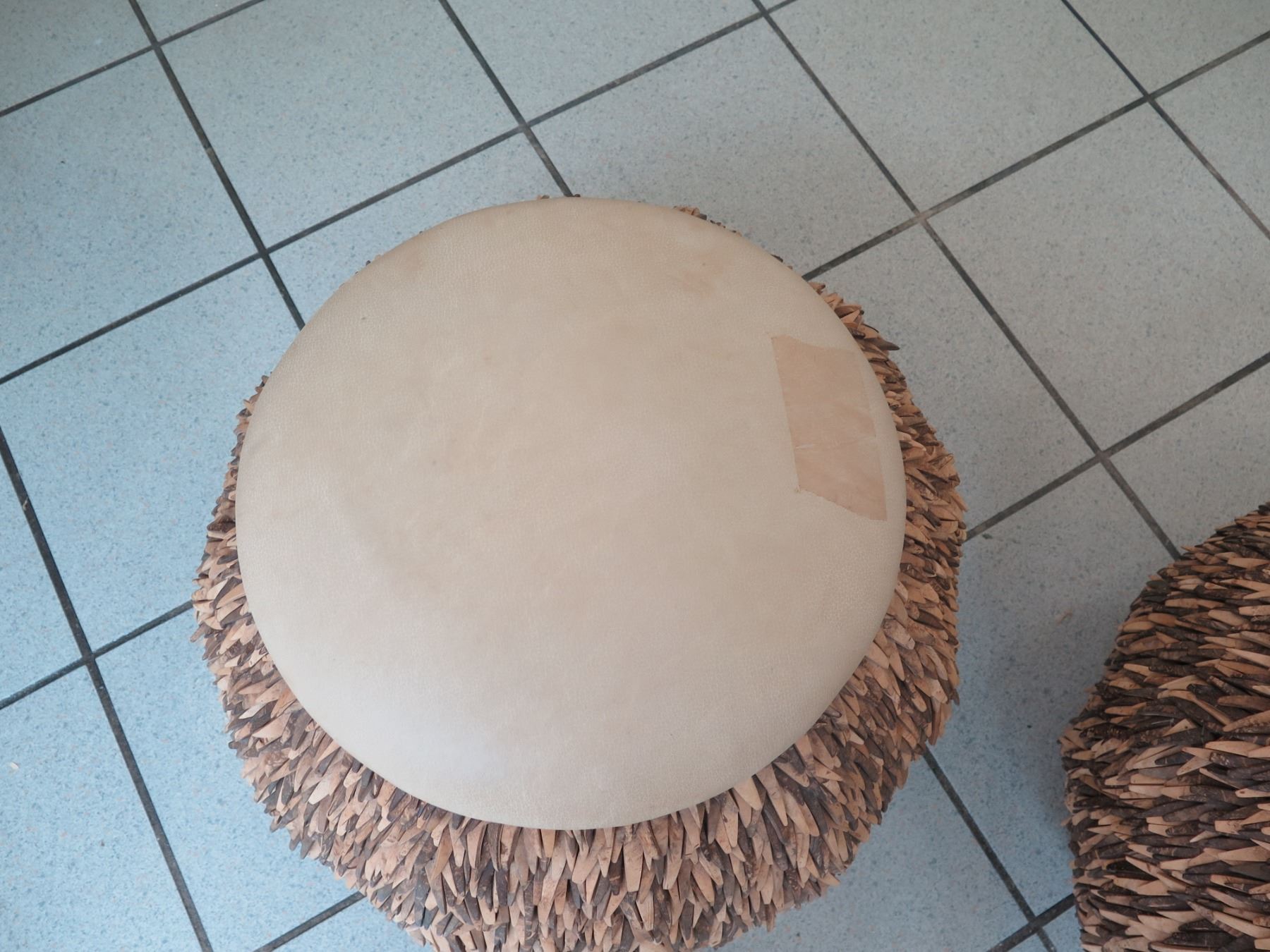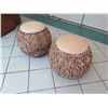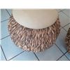 Pair of Stools with Coconut Shell Fringe, Leather-Like Top, 20" Tall (some discoloration on top)