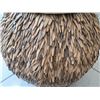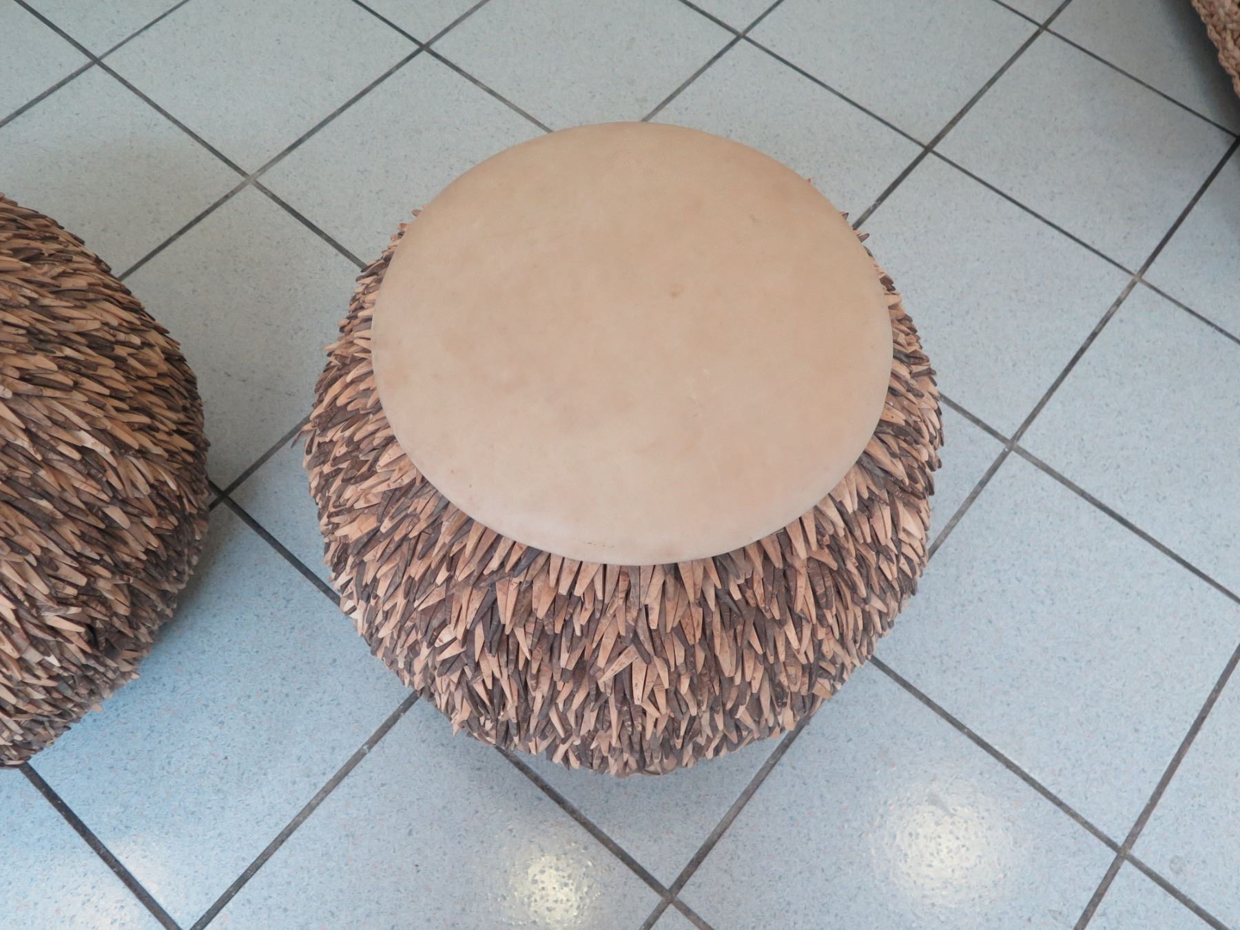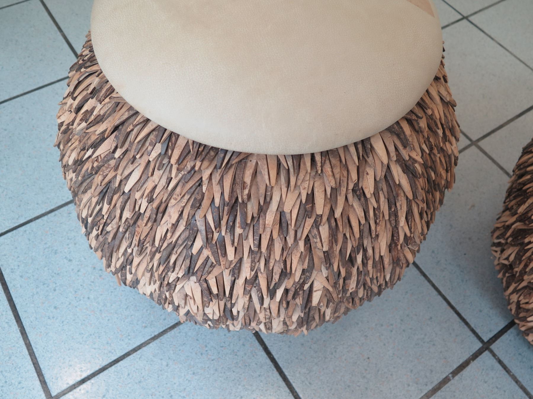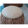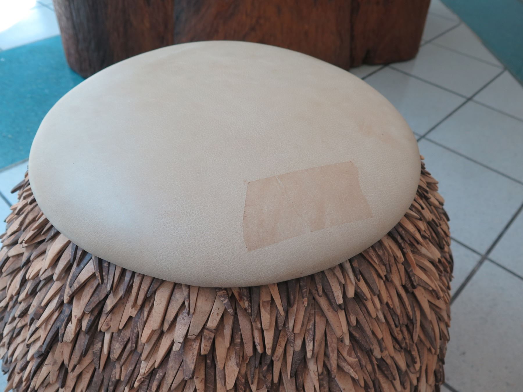Pair of Stools with Coconut Shell Fringe, Leather-Like Top, 20" Tall (some discoloration on top)