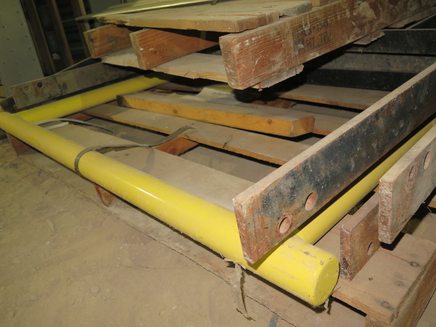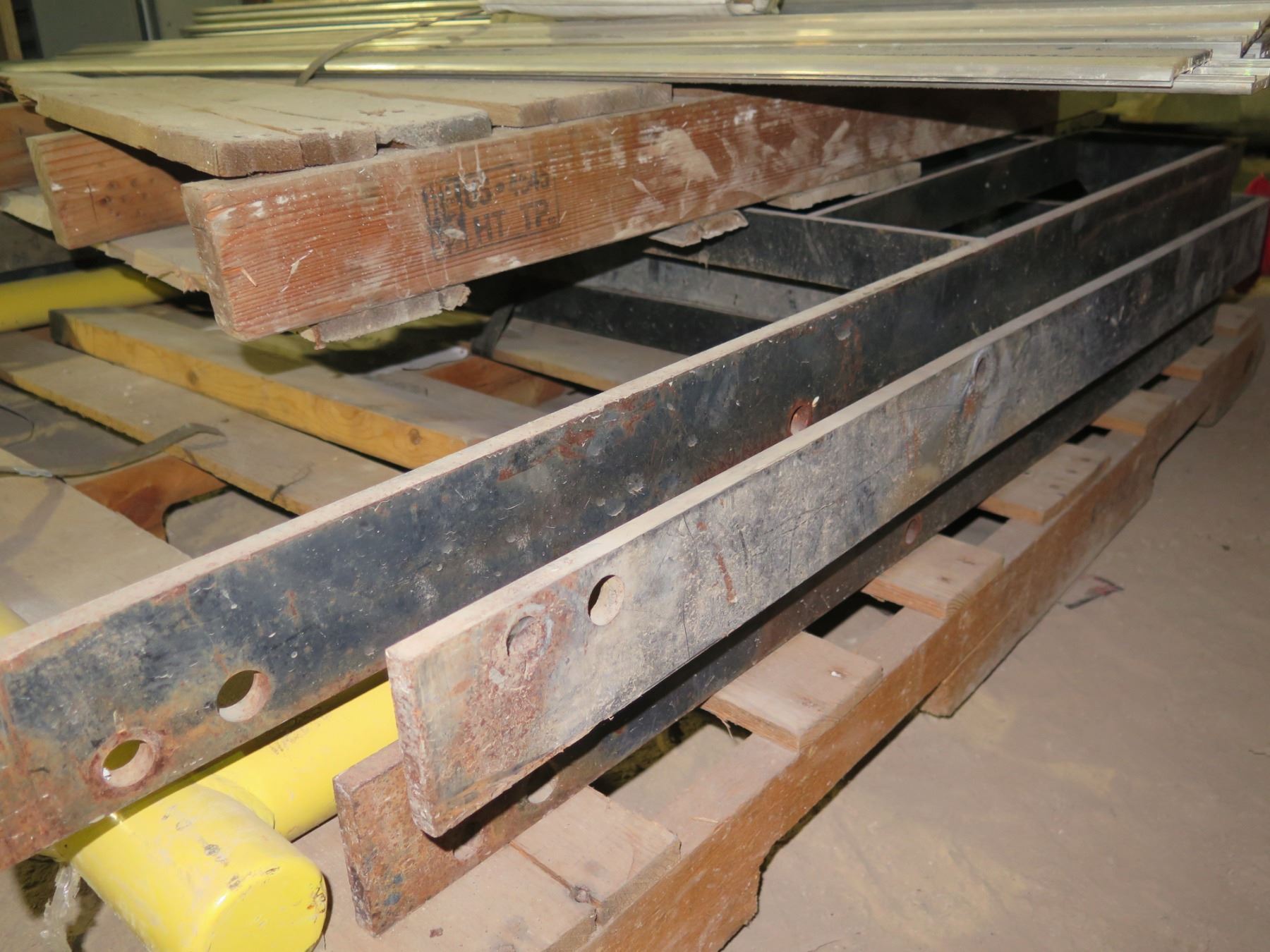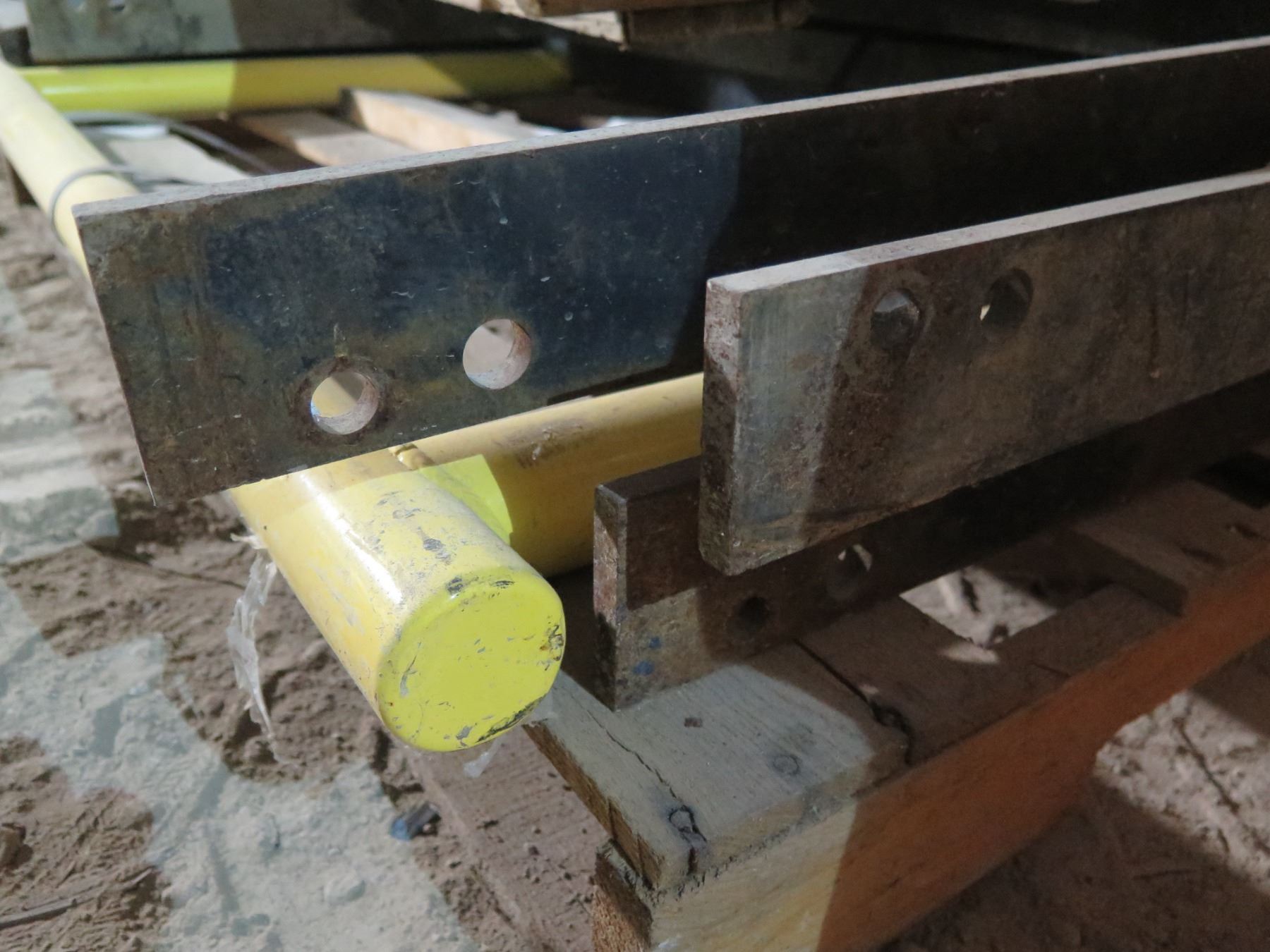 Pallet 3 Metal Forklift Carriages, Yellow Metal Stands, Metal Lengths, etc