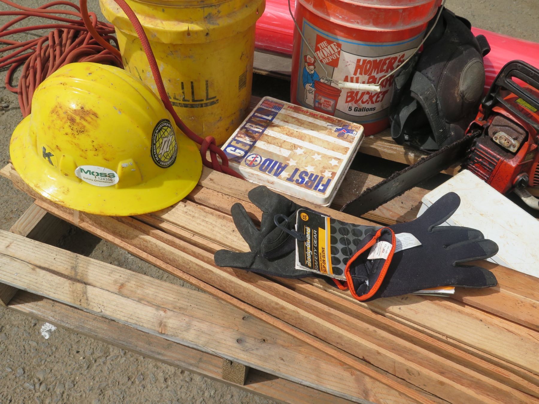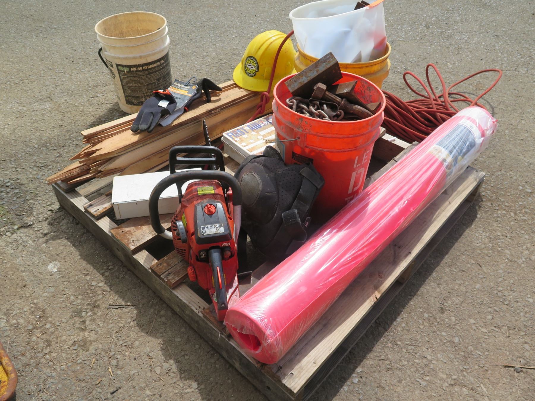 Pallet Echo CS-400 Chain Saw, Floor Muffler, Stakes, Safety Equipment. Hose, Hardware, etc