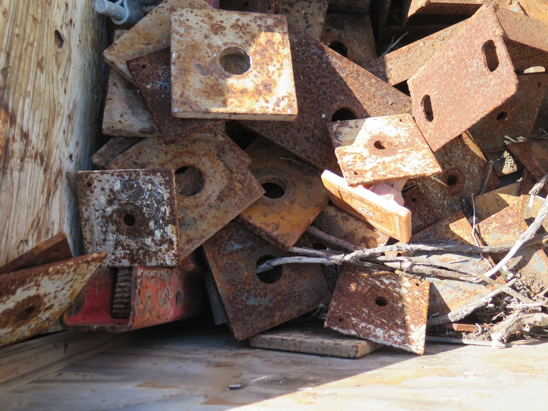 Pallet w/ Bin Metal & Orange Bases, Nuts & Bolts, Angle Iron, Rope, etc