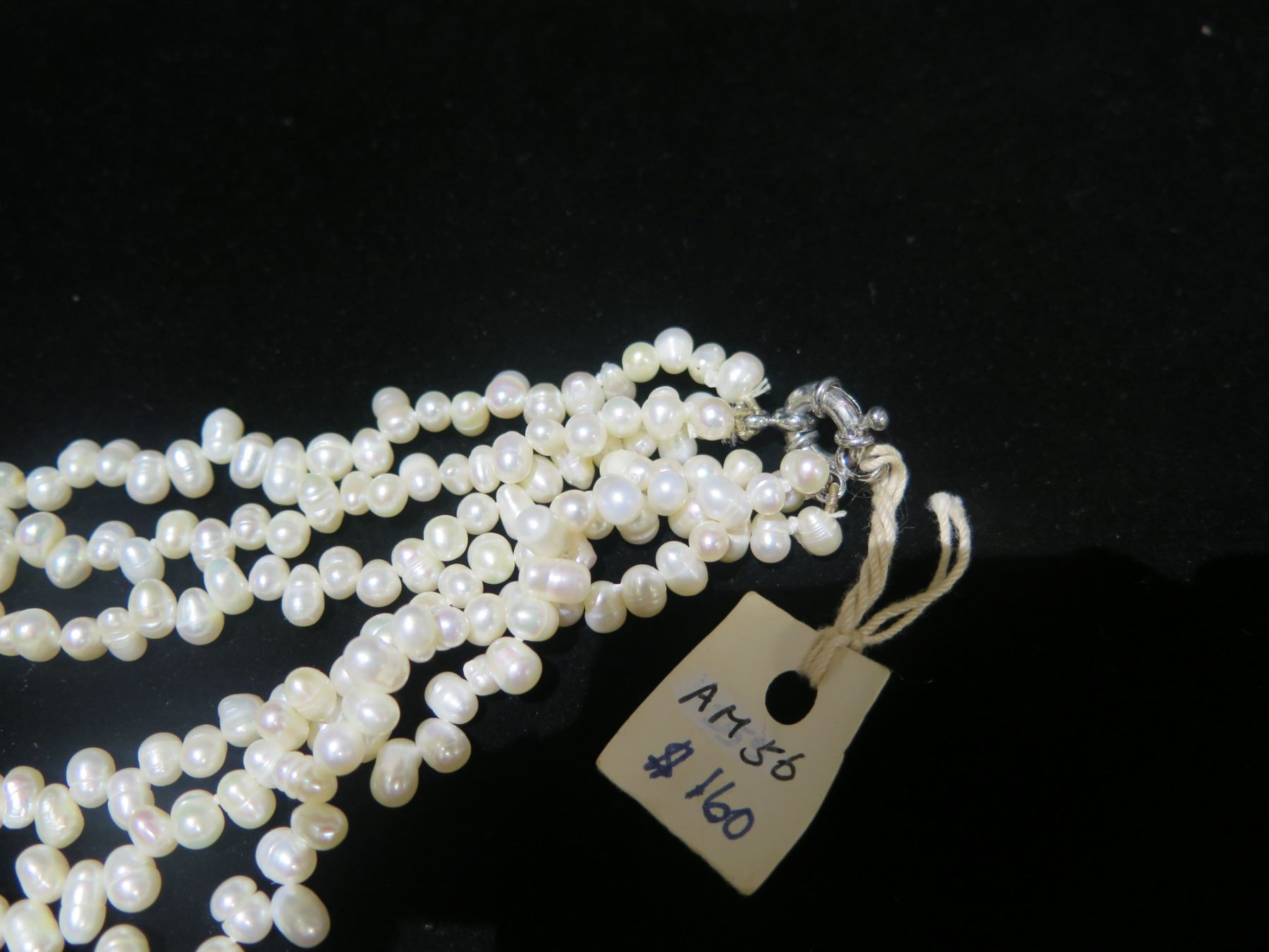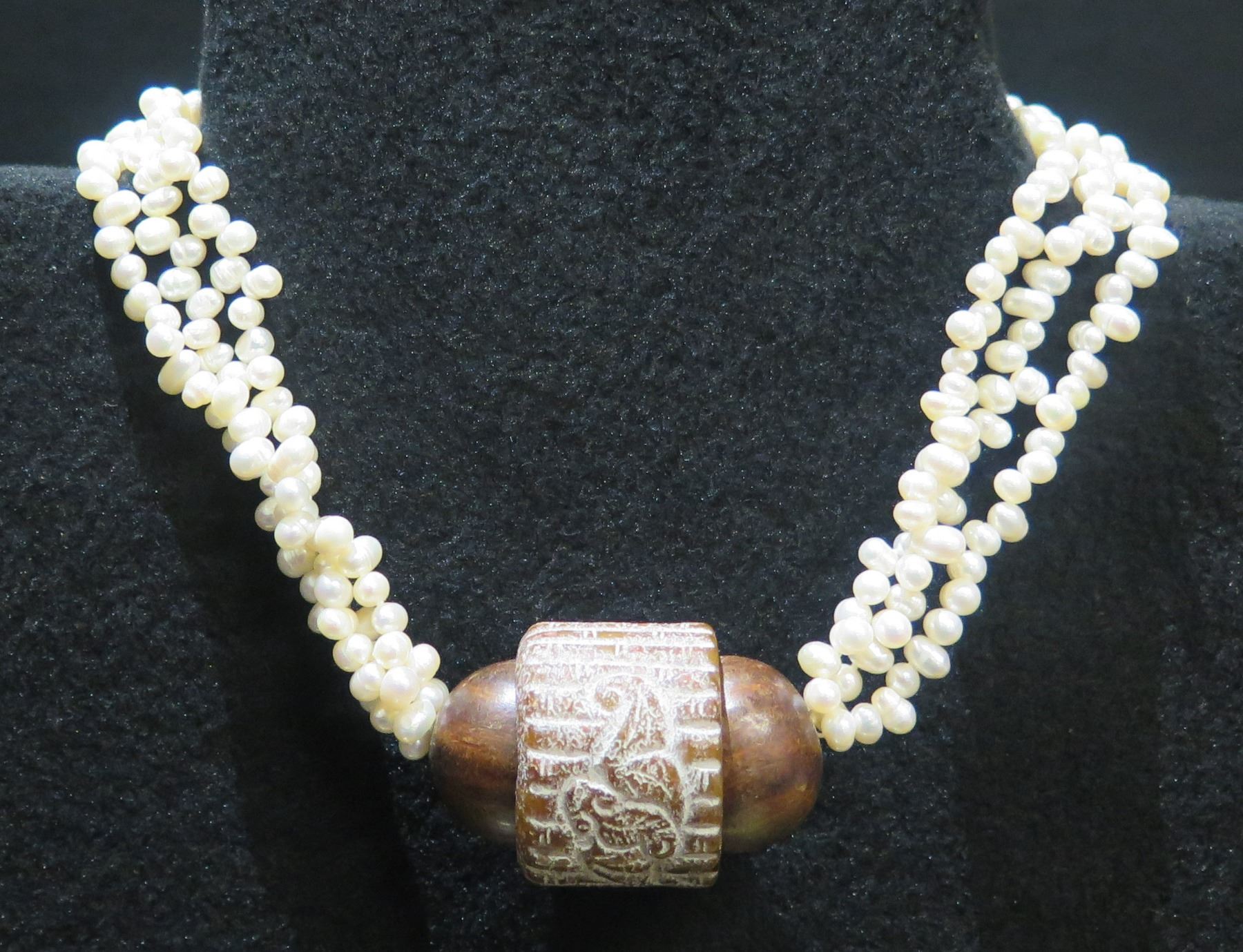 Pearl Bead 3 Strand Necklace w/ Wood & Design Pendant AM56 16"L