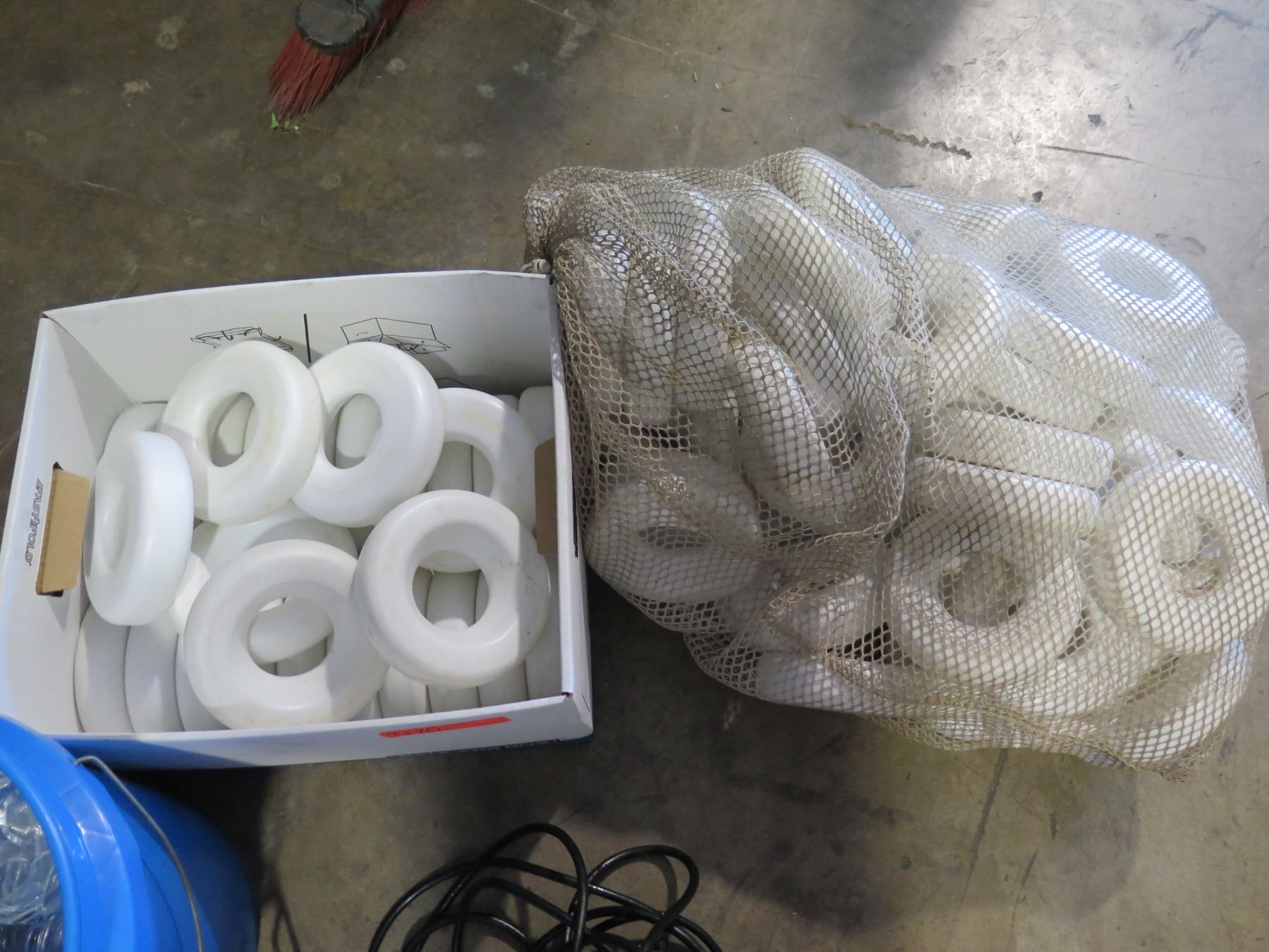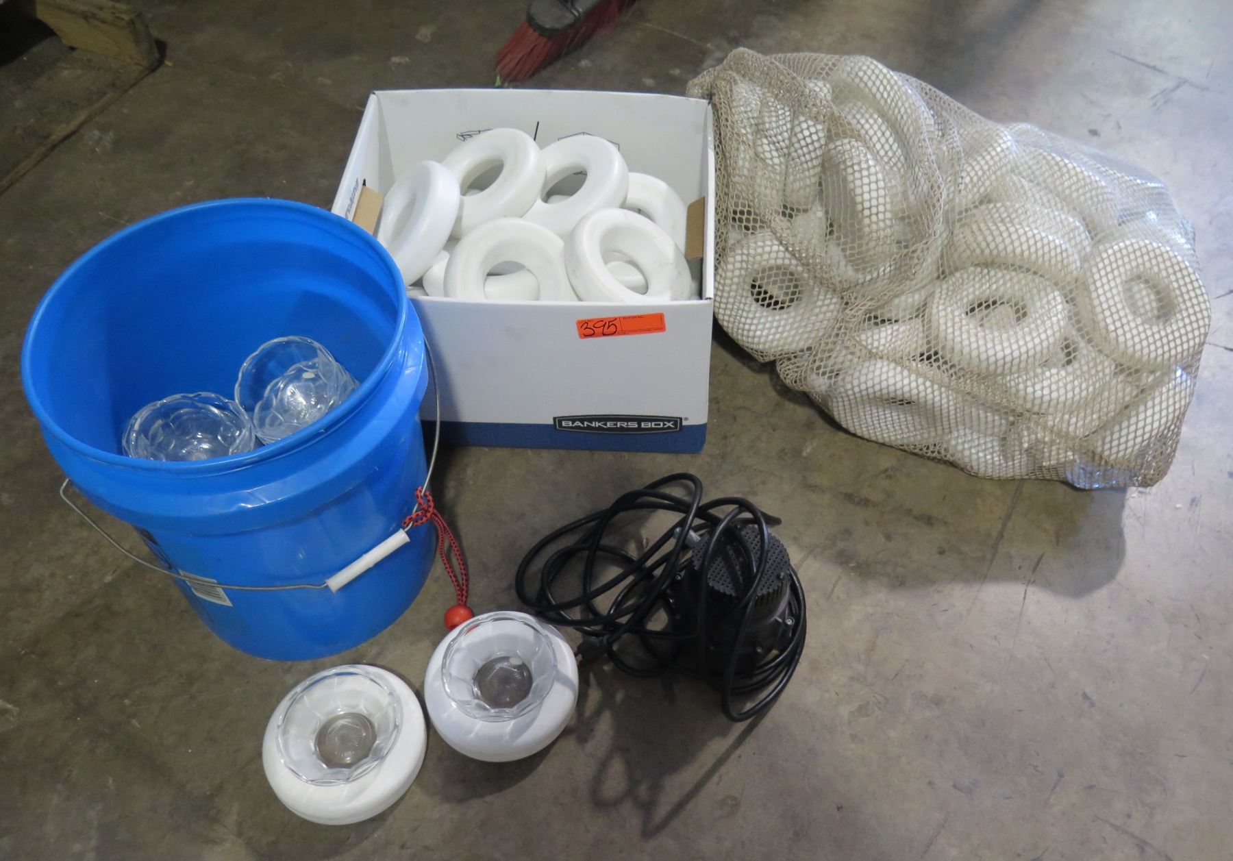 Ping Pong game set. Enough floats and glass cups for ping pong game. Ping pong balls not included. Pump is included. For use in a small swimming pool. Super fun carnival game. The pump moves the floats around the pool. Throw the ping pong balls and try to get them to stay in the glass cup.