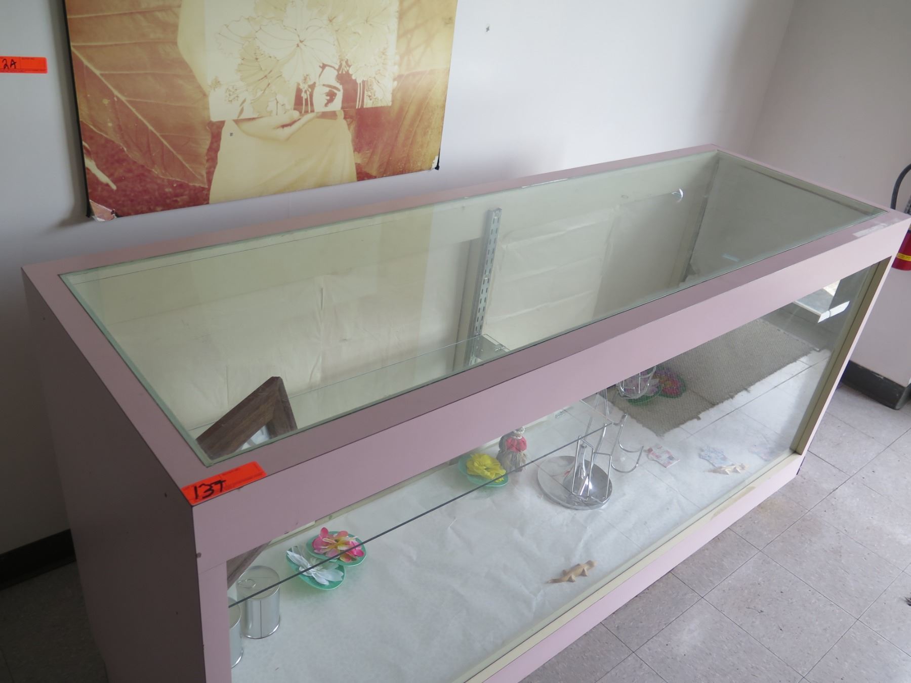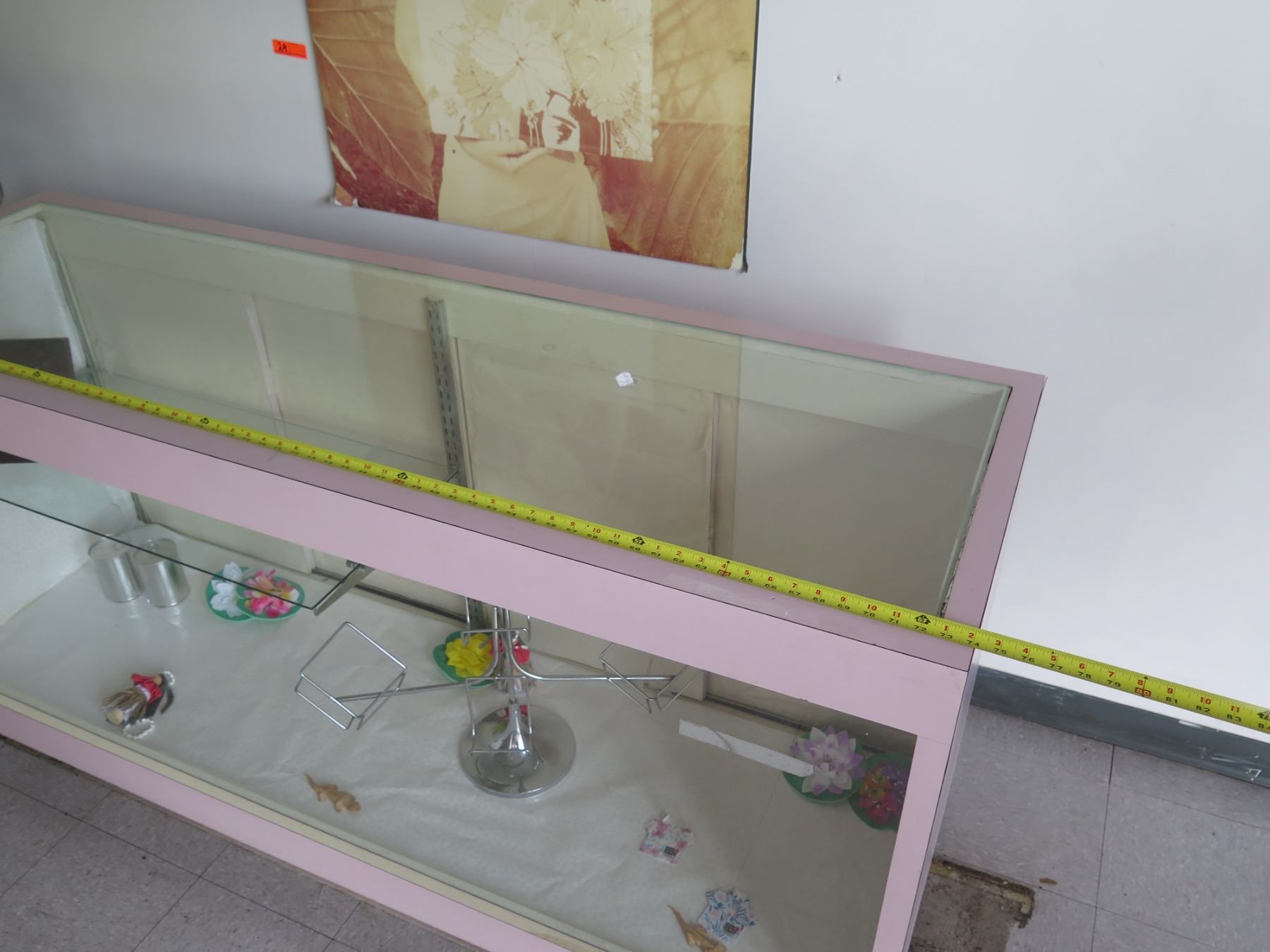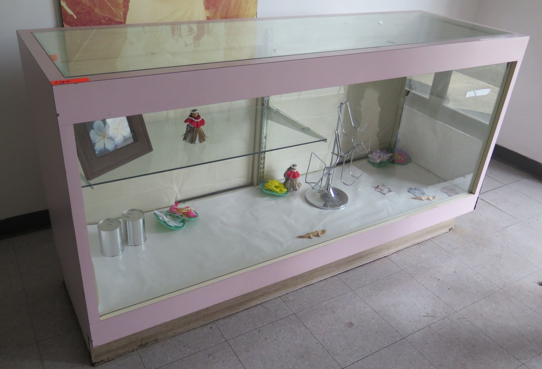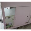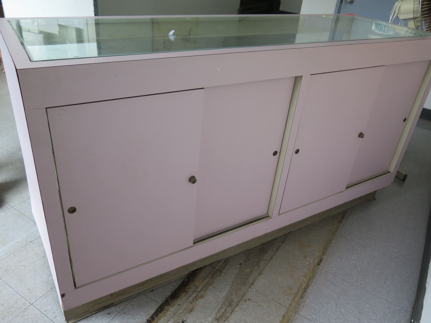 Pink Display Cabinet w/ Glass Shelves, Top & Front, Sliding Back Doors 74"x24"x40"H