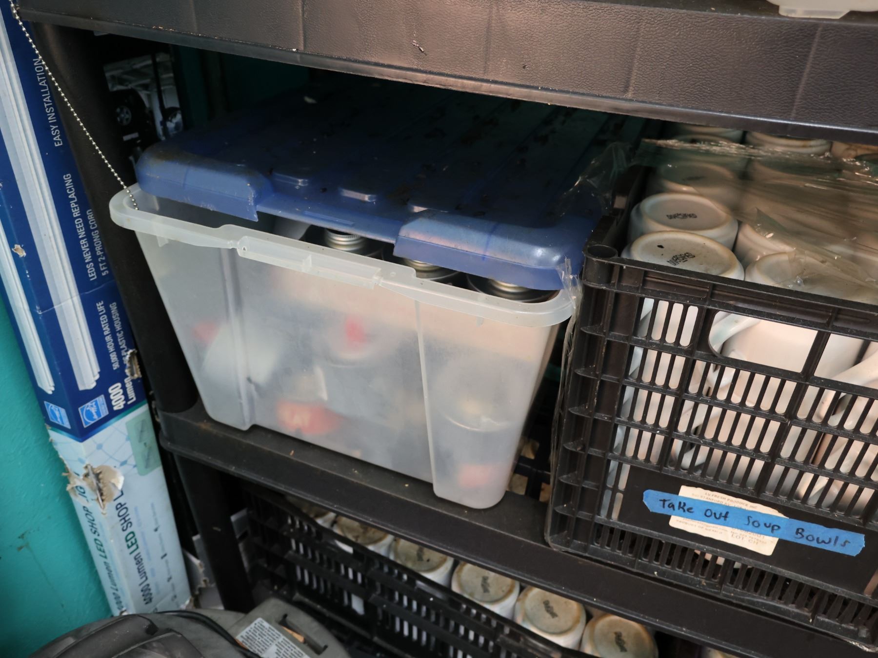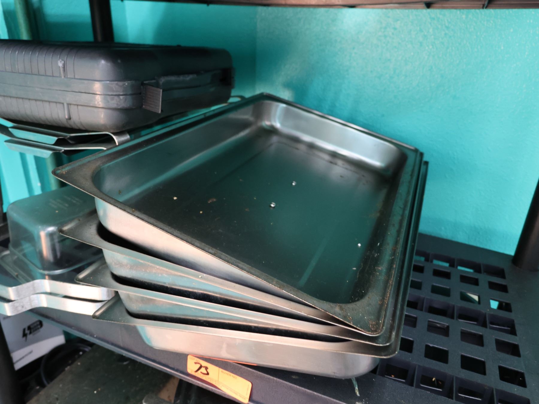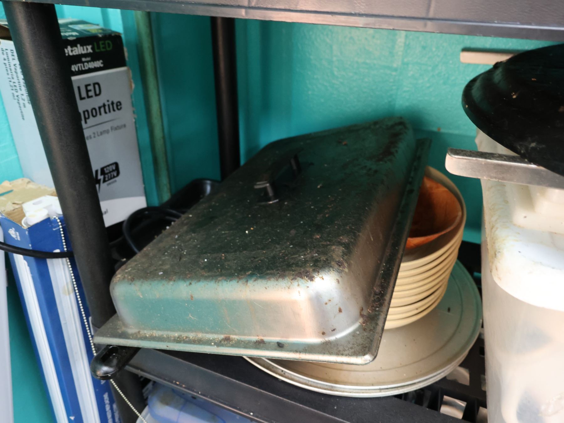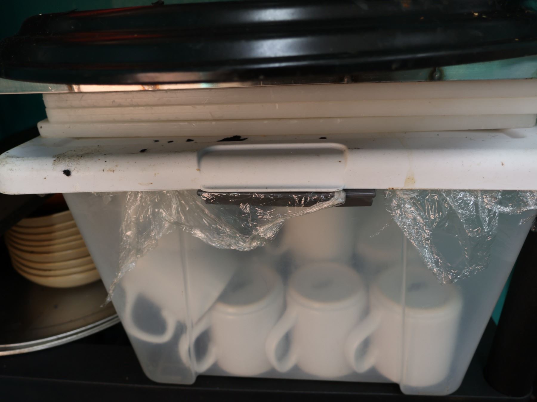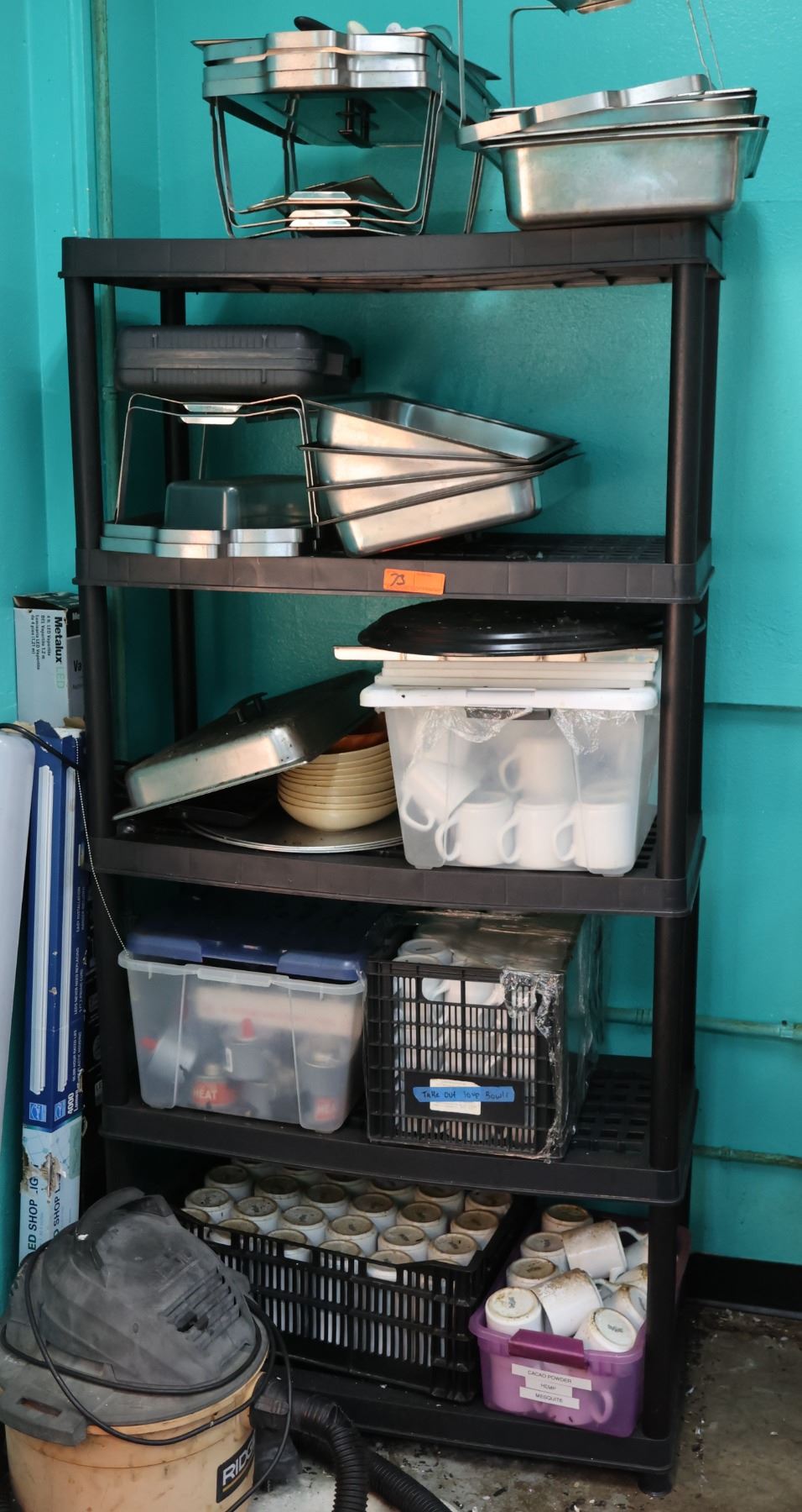 Plastic 4-Tier Shelving Unit & Contents: Multiple Metal Food Storage Containers, Coffee Mugs, etc.