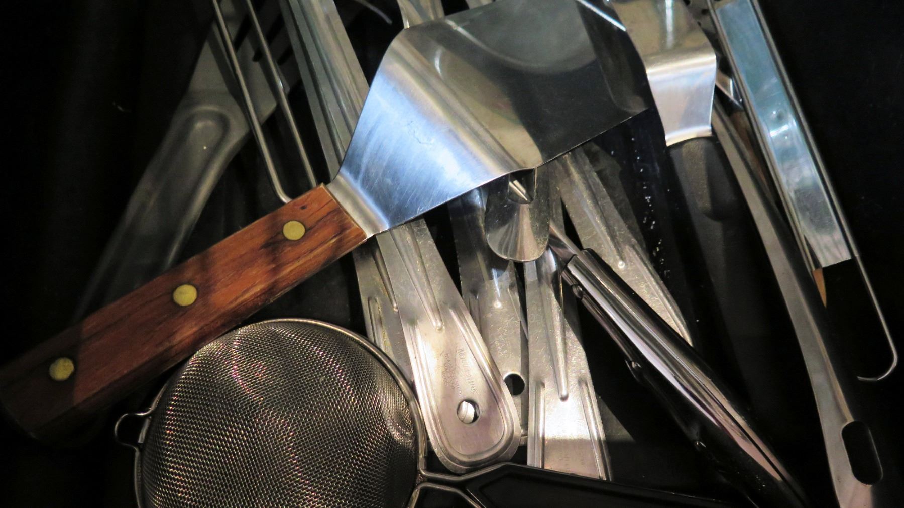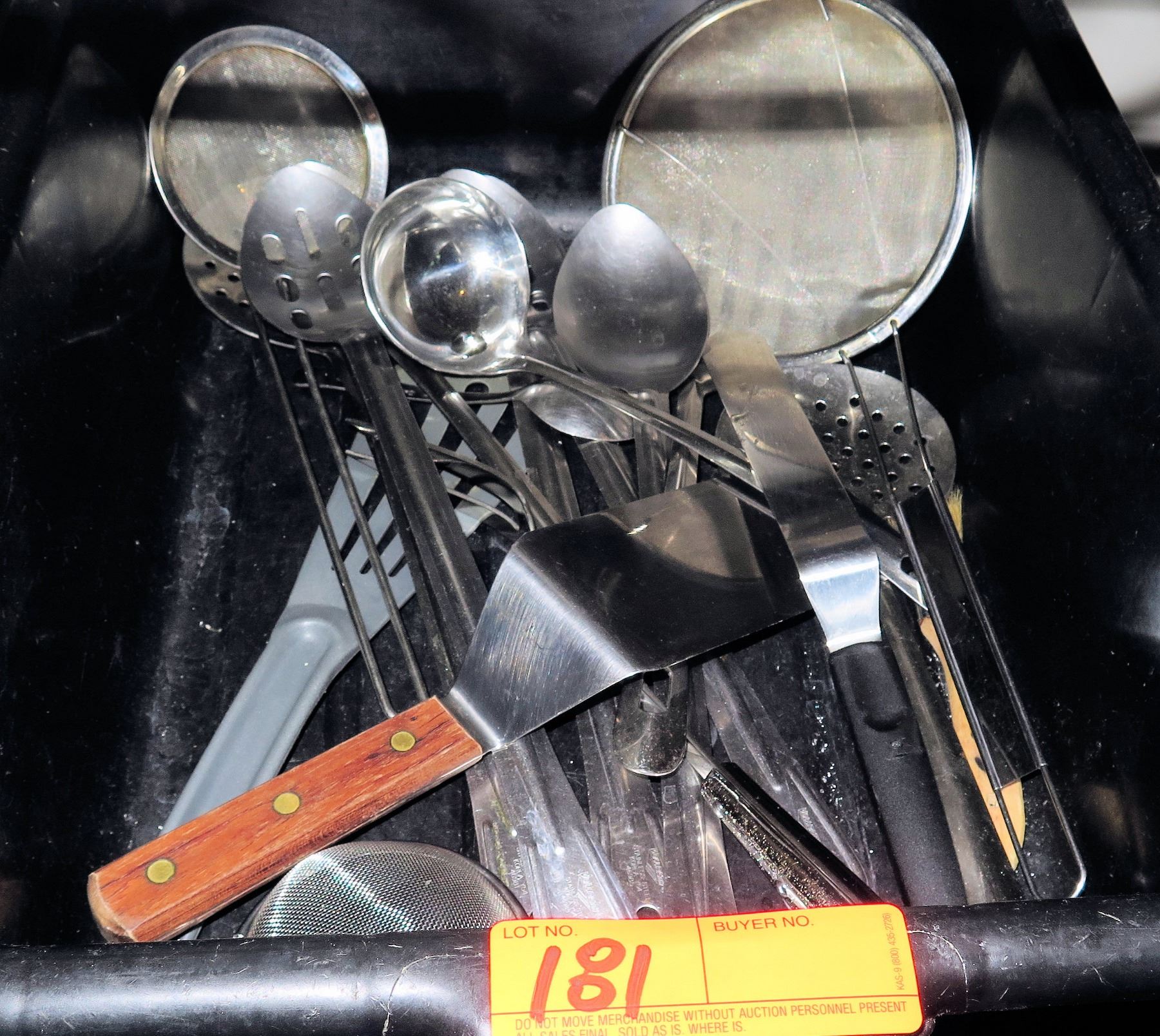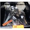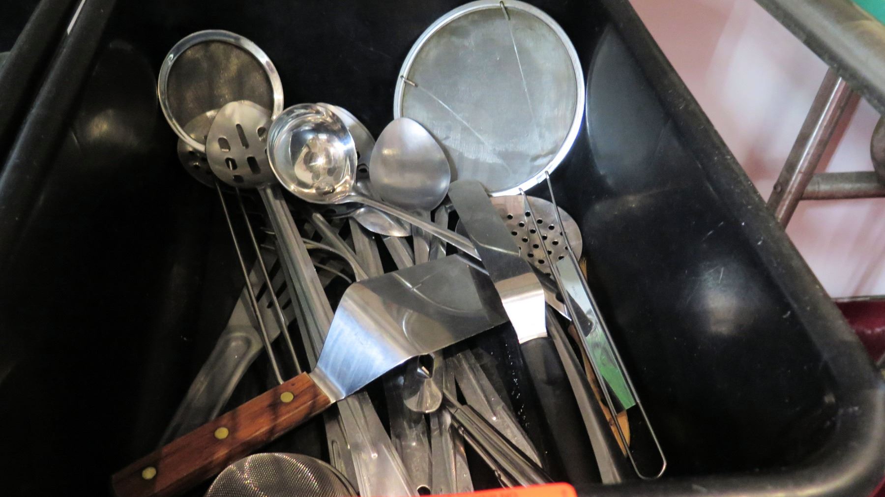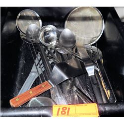 Plastic Bin w/ Multiple Misc Metal & Plastic Utensils - Spatulas, Ladles, etc