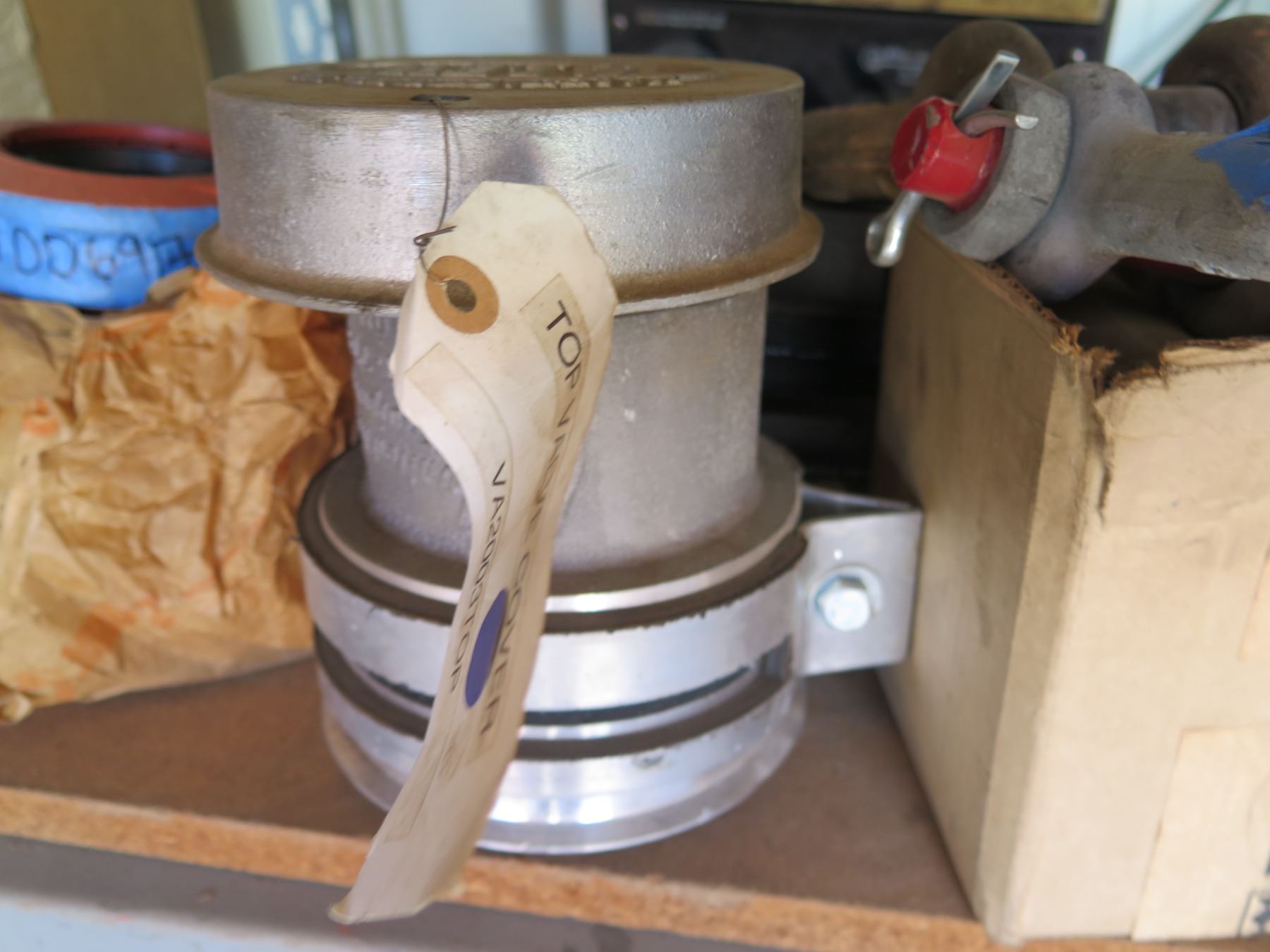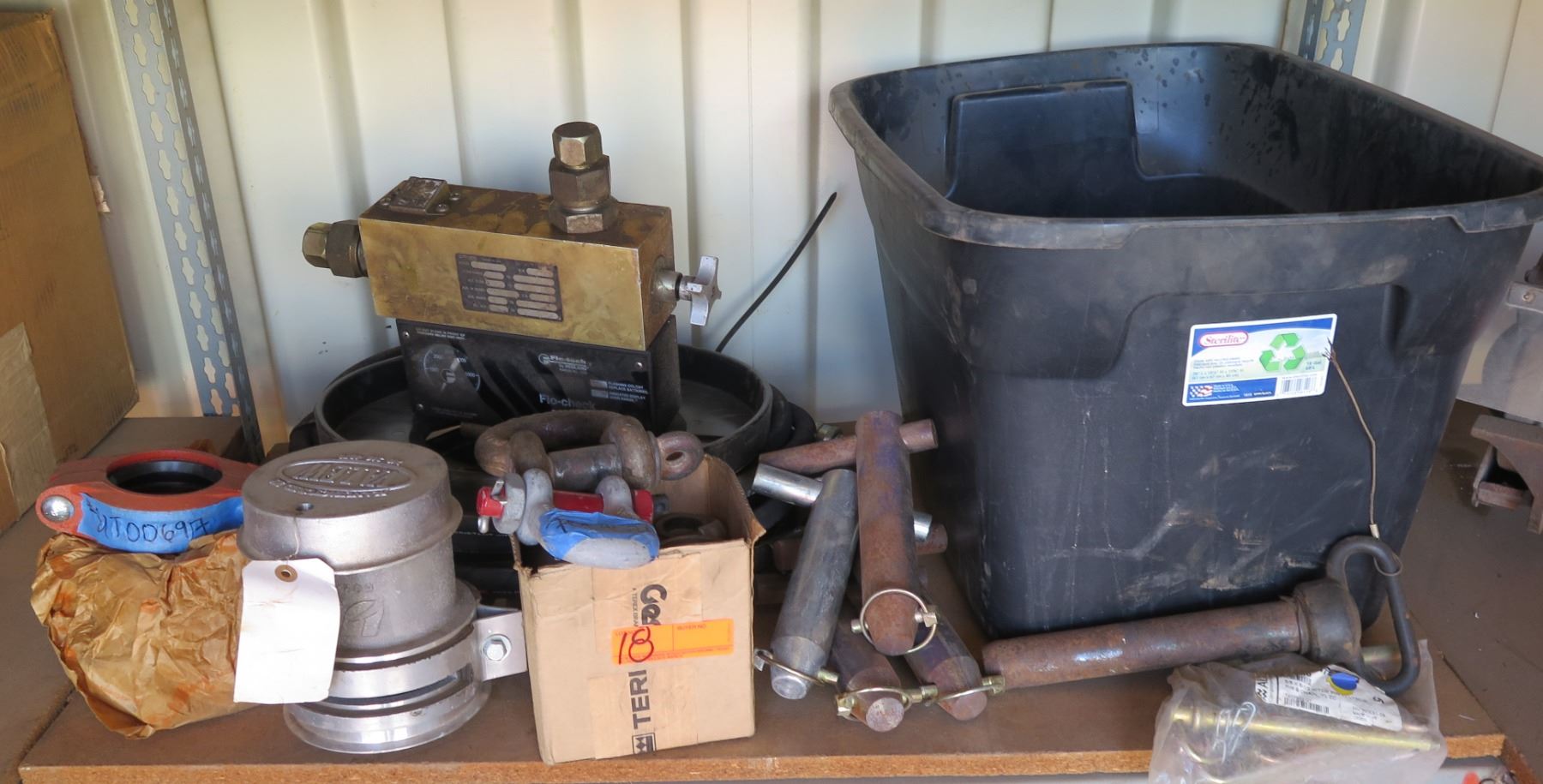 Plastic Bin w/ Shackles, Valve Cover, Parts, etc