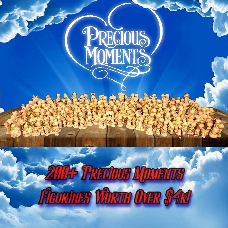 Precious Moments Figurines, over 200 in the collection, used, some signs of aging but in good condition. Some of the music boxes don't work. Each item is valued between $15-$50 a piece.