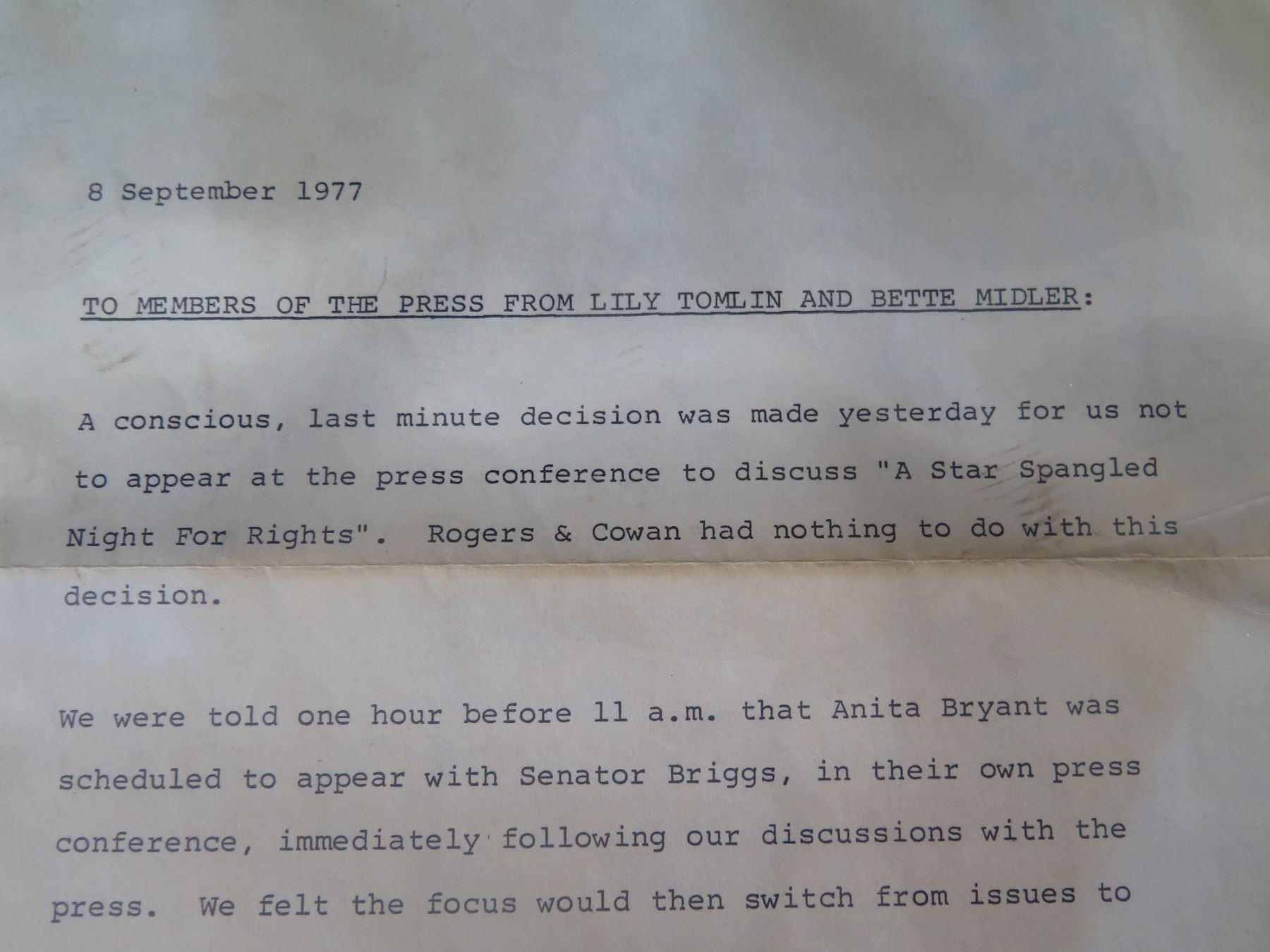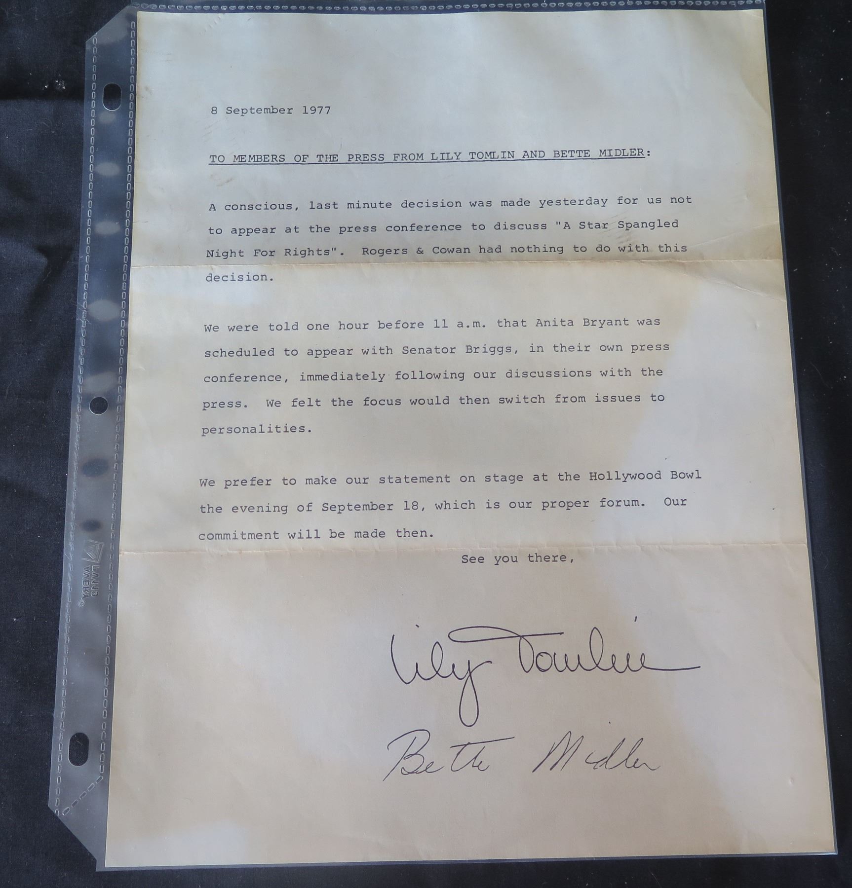 Press Release From Lily Tomlin & Bette Midler Signed 1977