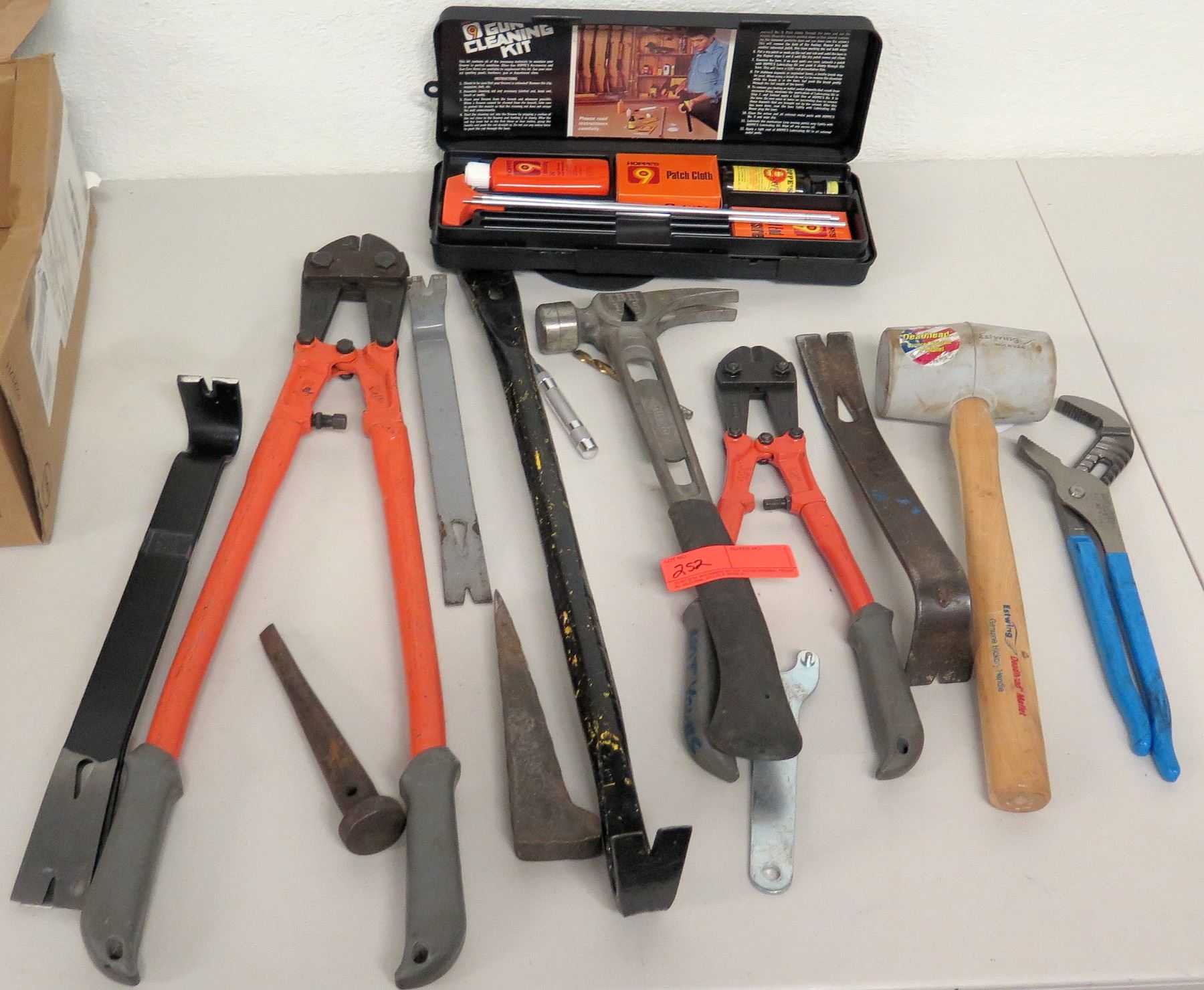 Pry Bars, Bolt Cutters, Hammers, Misc Tools, Gun Cleaning Kit, etc