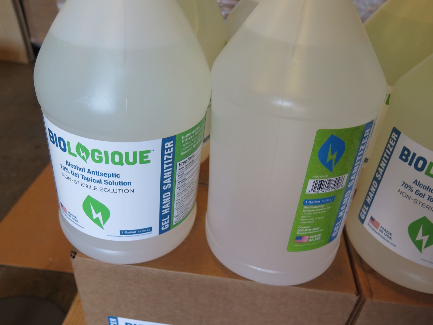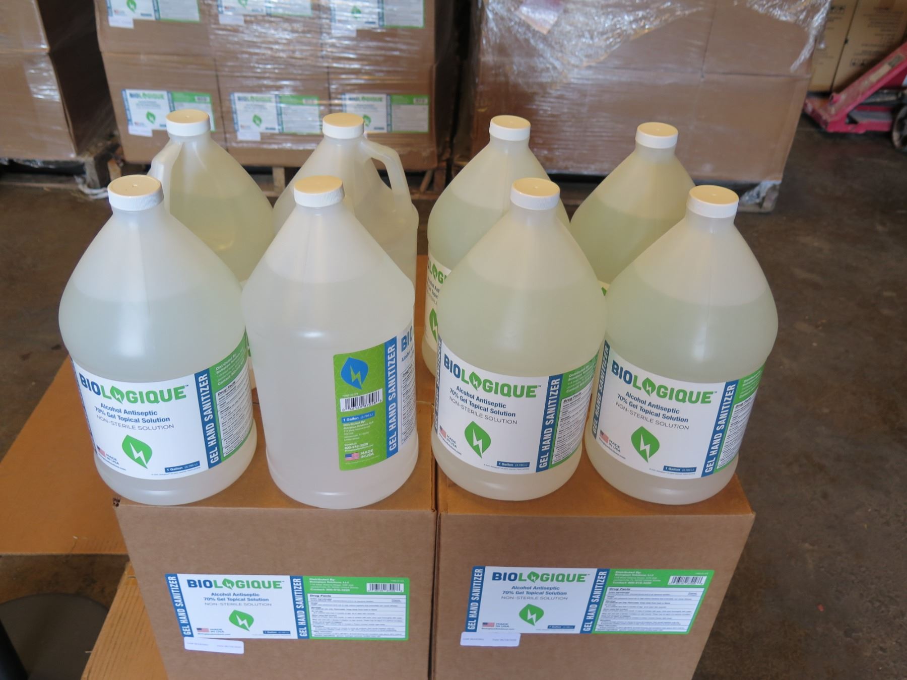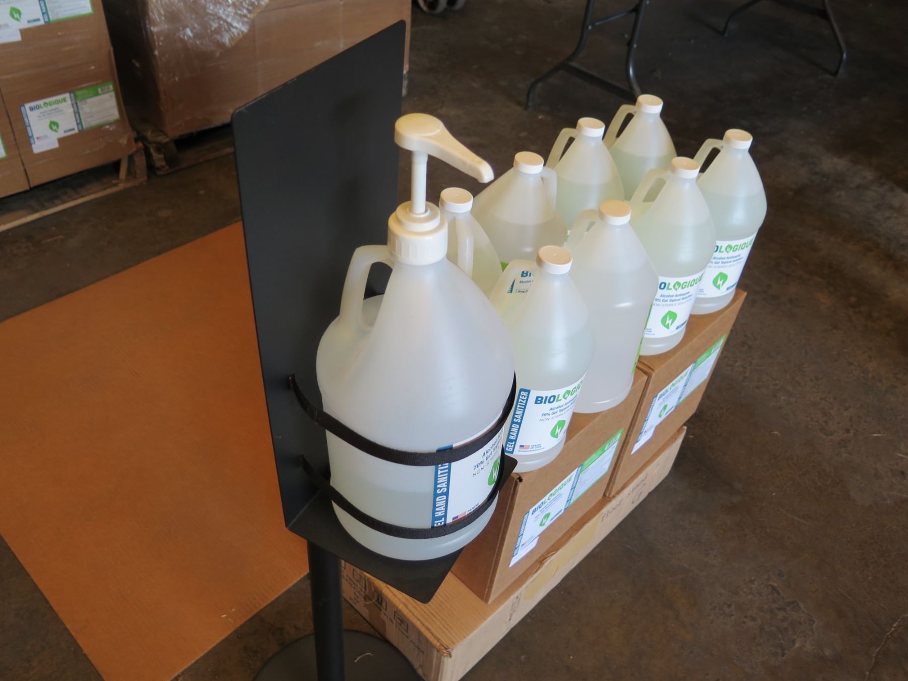 Pump Dispenser Floor Stand & 8 Gal Bottles Biologique Sanitizer 70%Gel