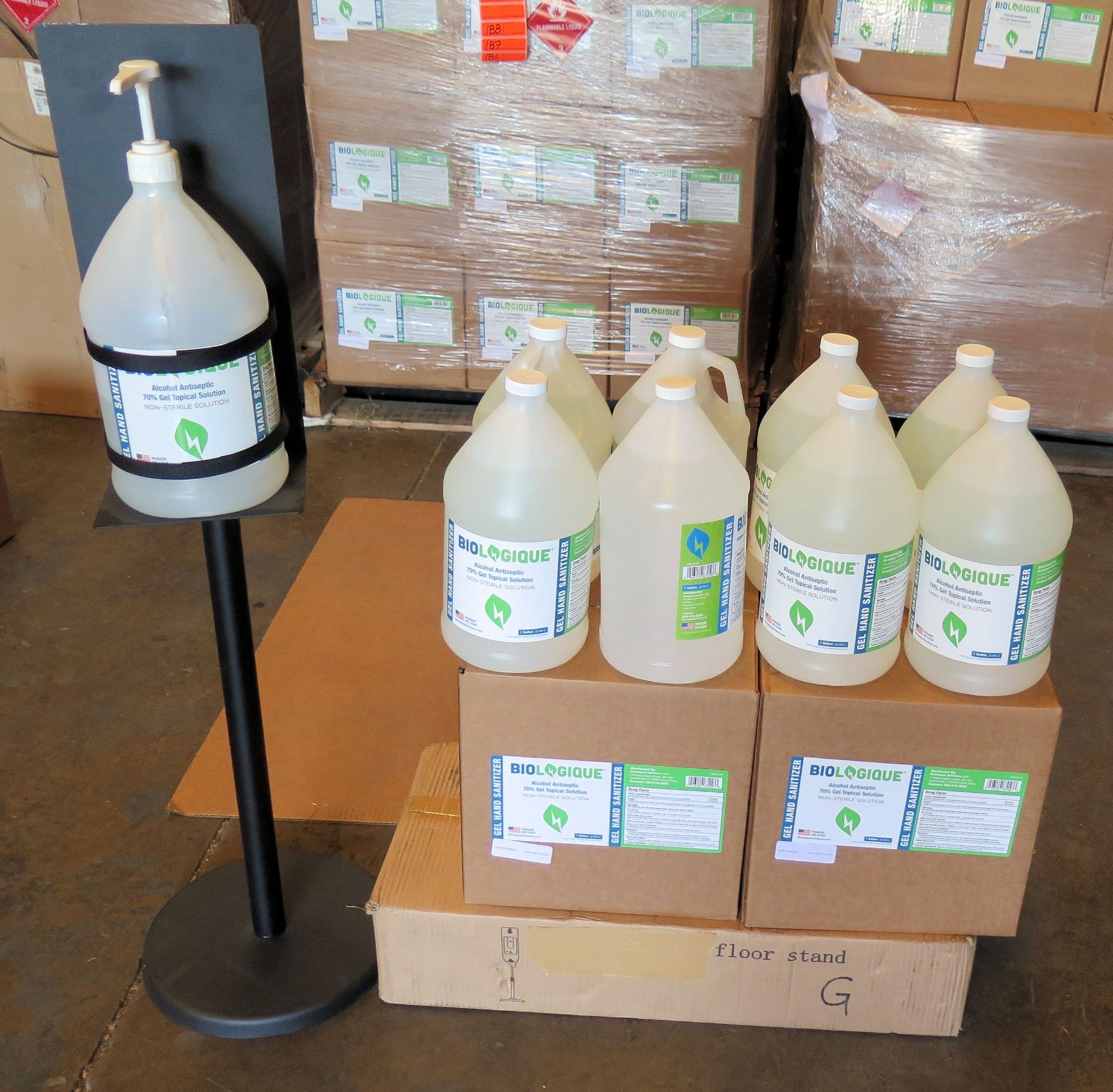 Pump Dispenser Floor Stand & 8 Gal Bottles Biologique Sanitizer 70%Gel