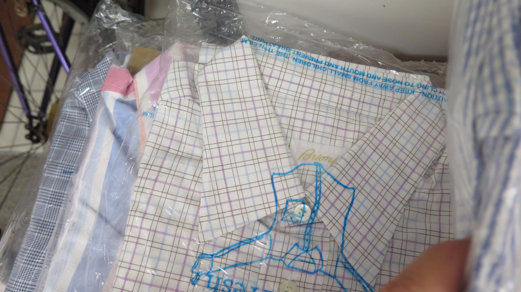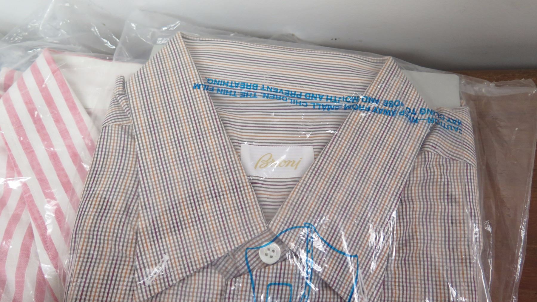 QTY 6 Men's Collared Shirts, Drycleaned, Sz L & XL (Brioni, EQ, Zegna, etc). Each has been drycleaned and in drycleaner's plastic bag. These are predominantly sizes L or XL. There may occassionaly be an XXL. Some are foreign brands (purchased in Italy, France, etc) with no size labels. Please bid accordingly with this in mind.