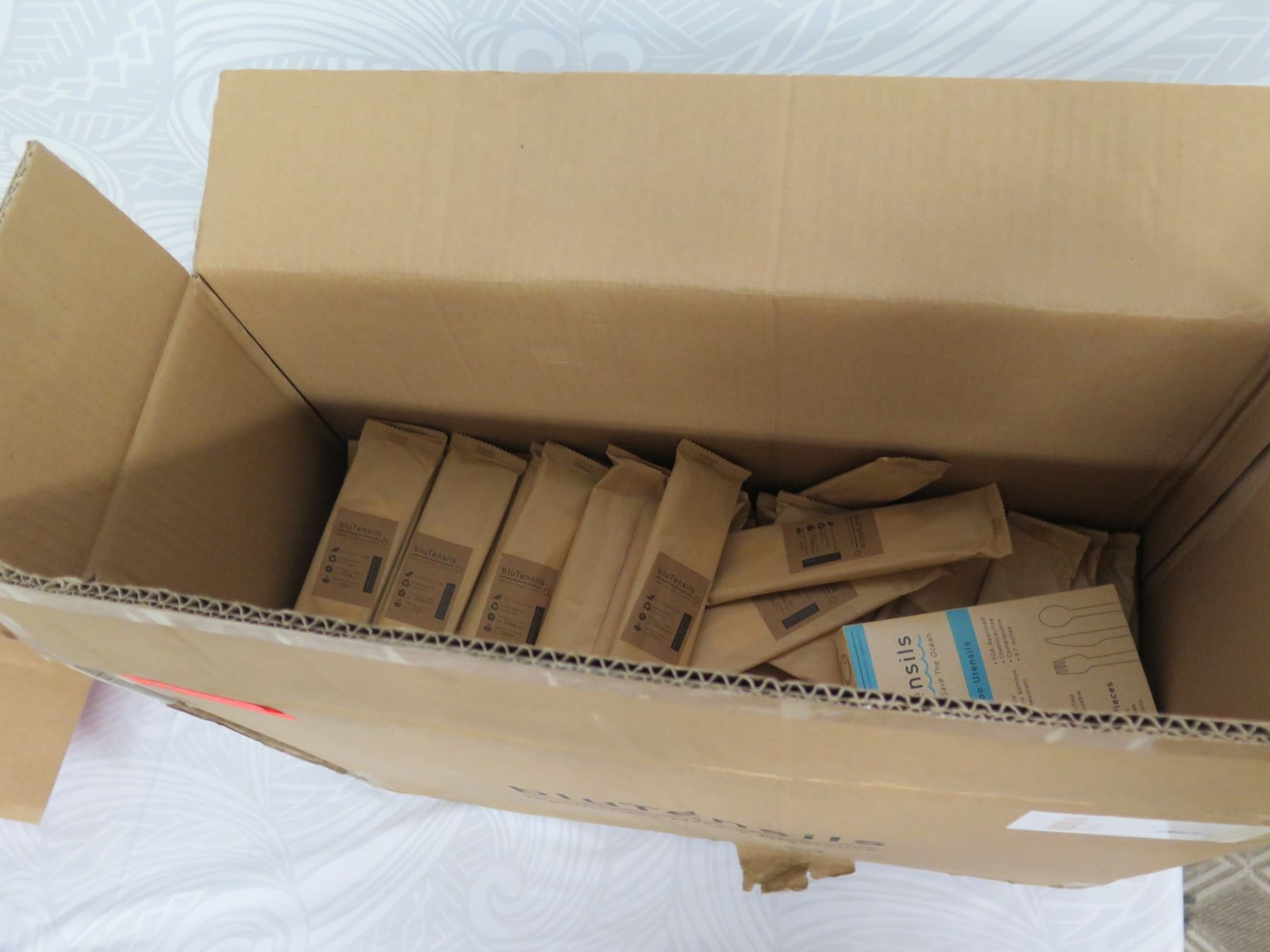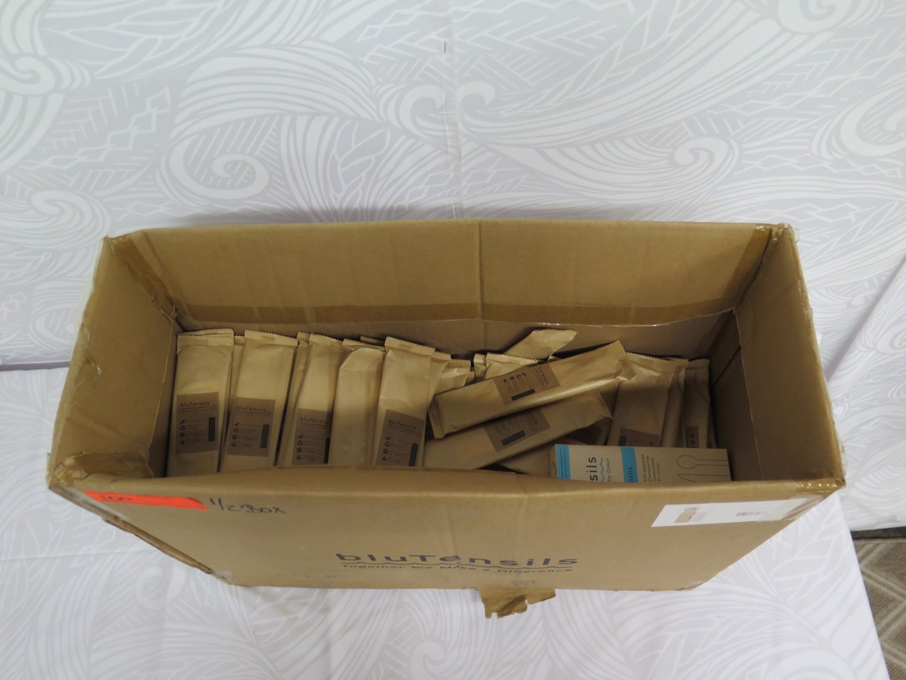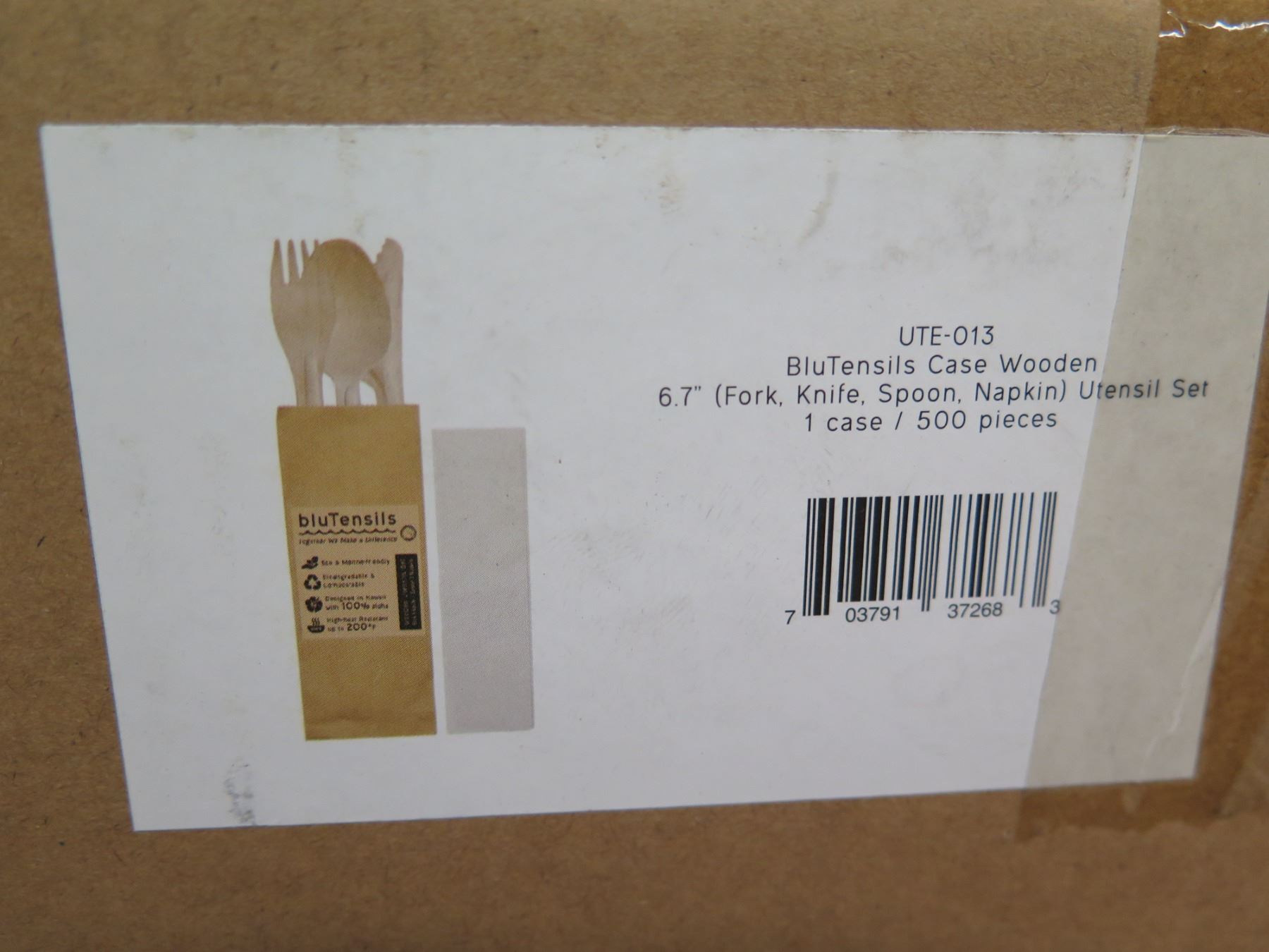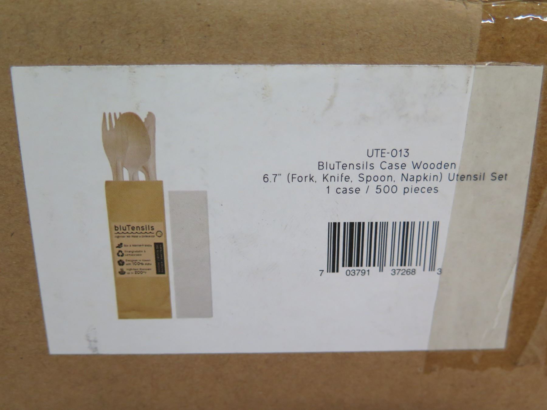 Qty 1/2 Box BluTensils Wooden Utensils - Fork, Knife, Spoon, Napkin Sets