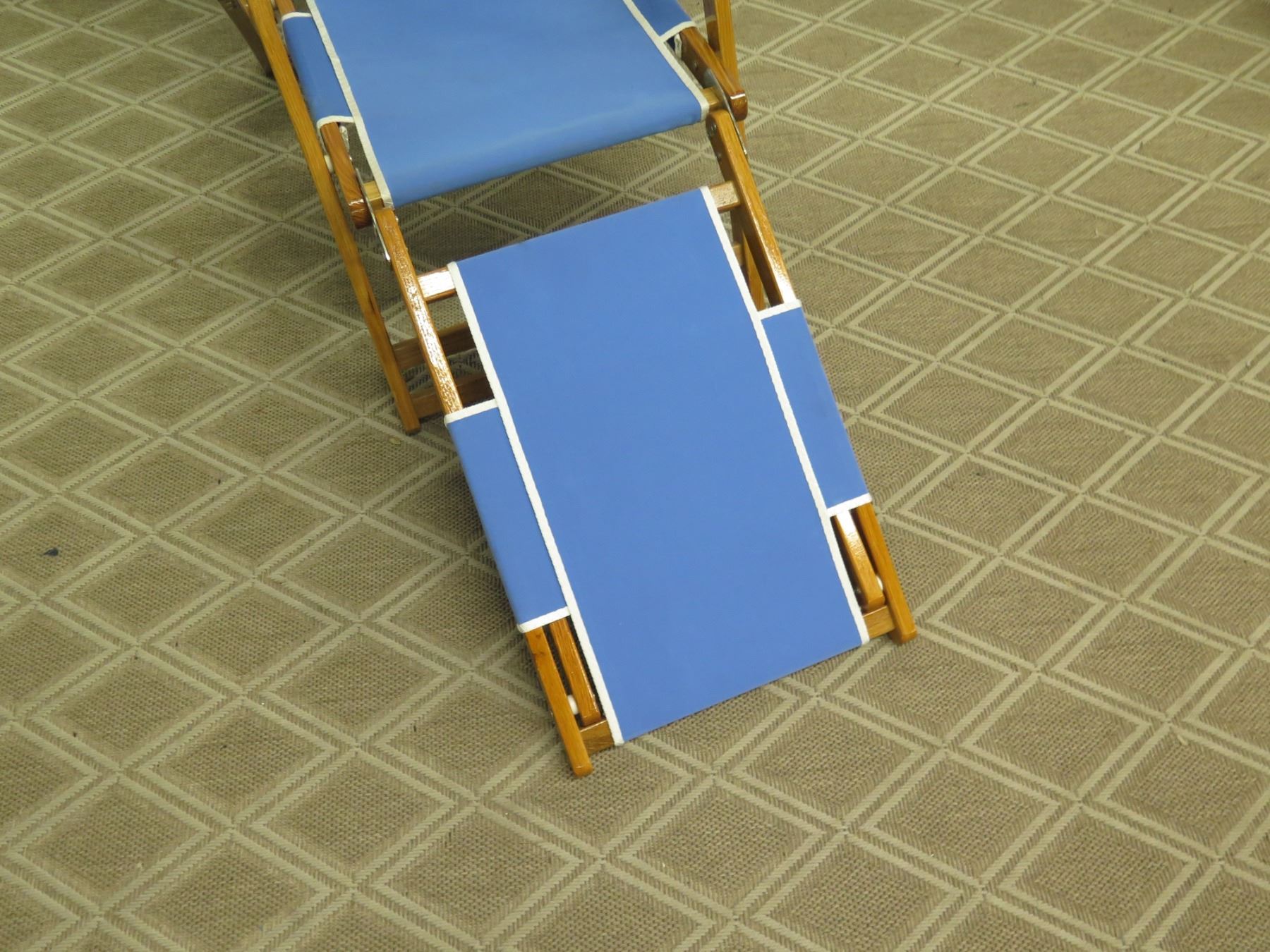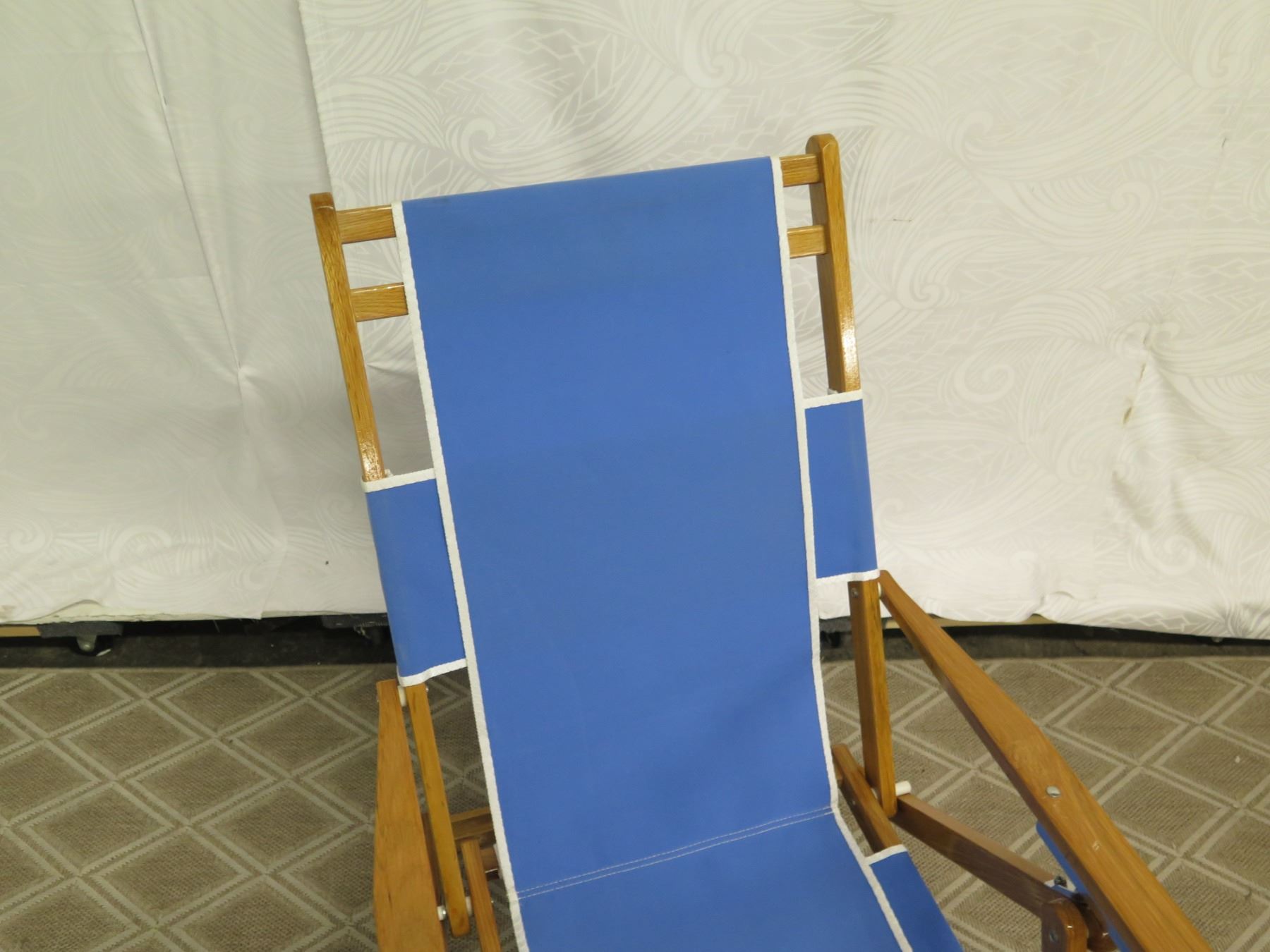 Qty 1 Wood Chaise Lounge Chairs w/ Blue Canvas (Retail $228) https://www.frankfordumbrellas.com/collections/lounger