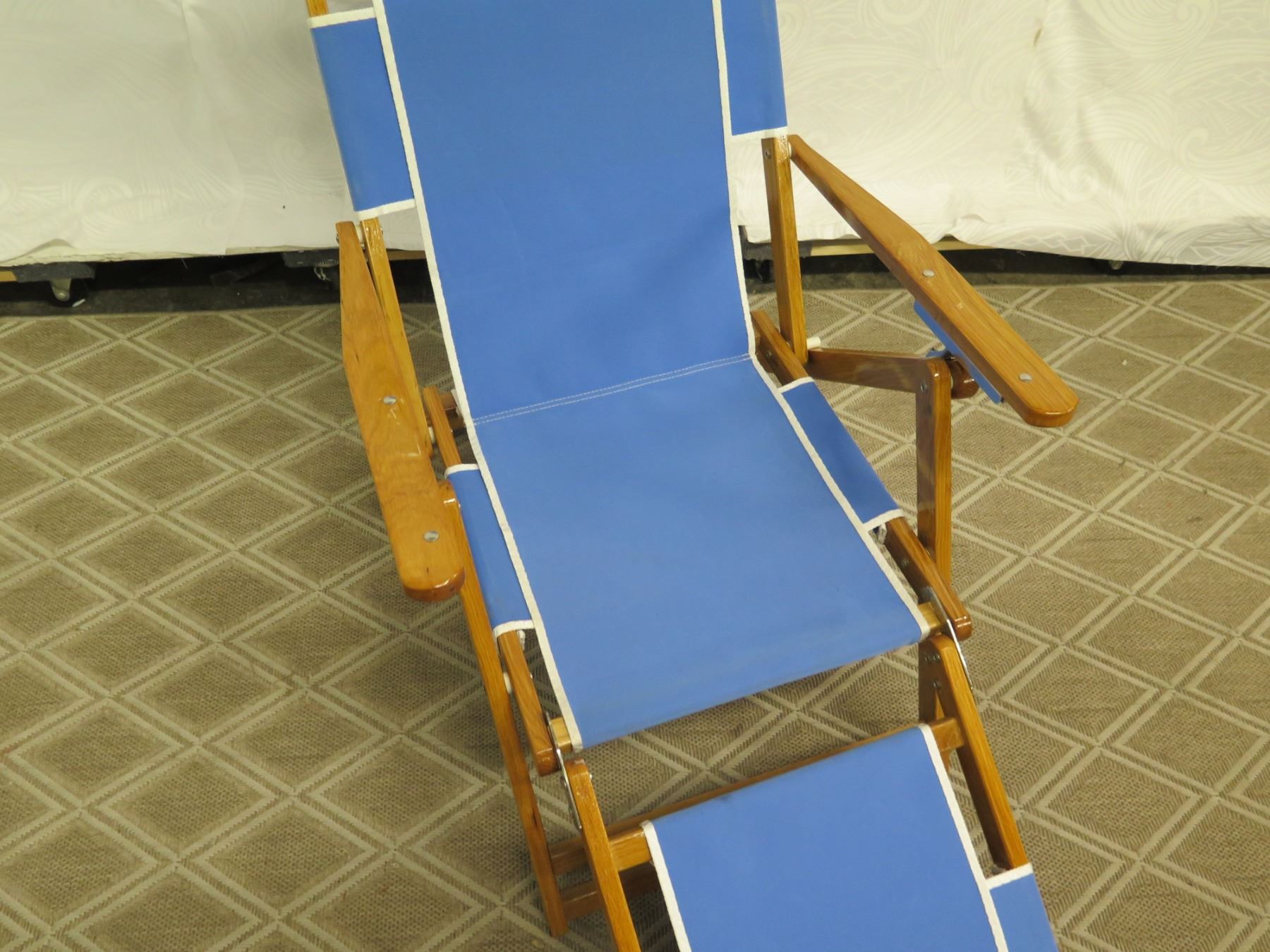 Qty 1 Wood Chaise Lounge Chairs w/ Blue Canvas (Retail $228) https://www.frankfordumbrellas.com/collections/lounger
