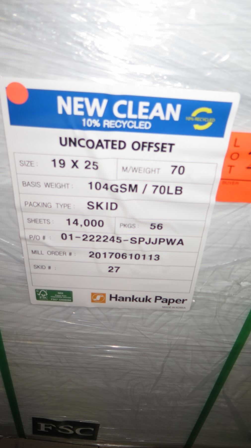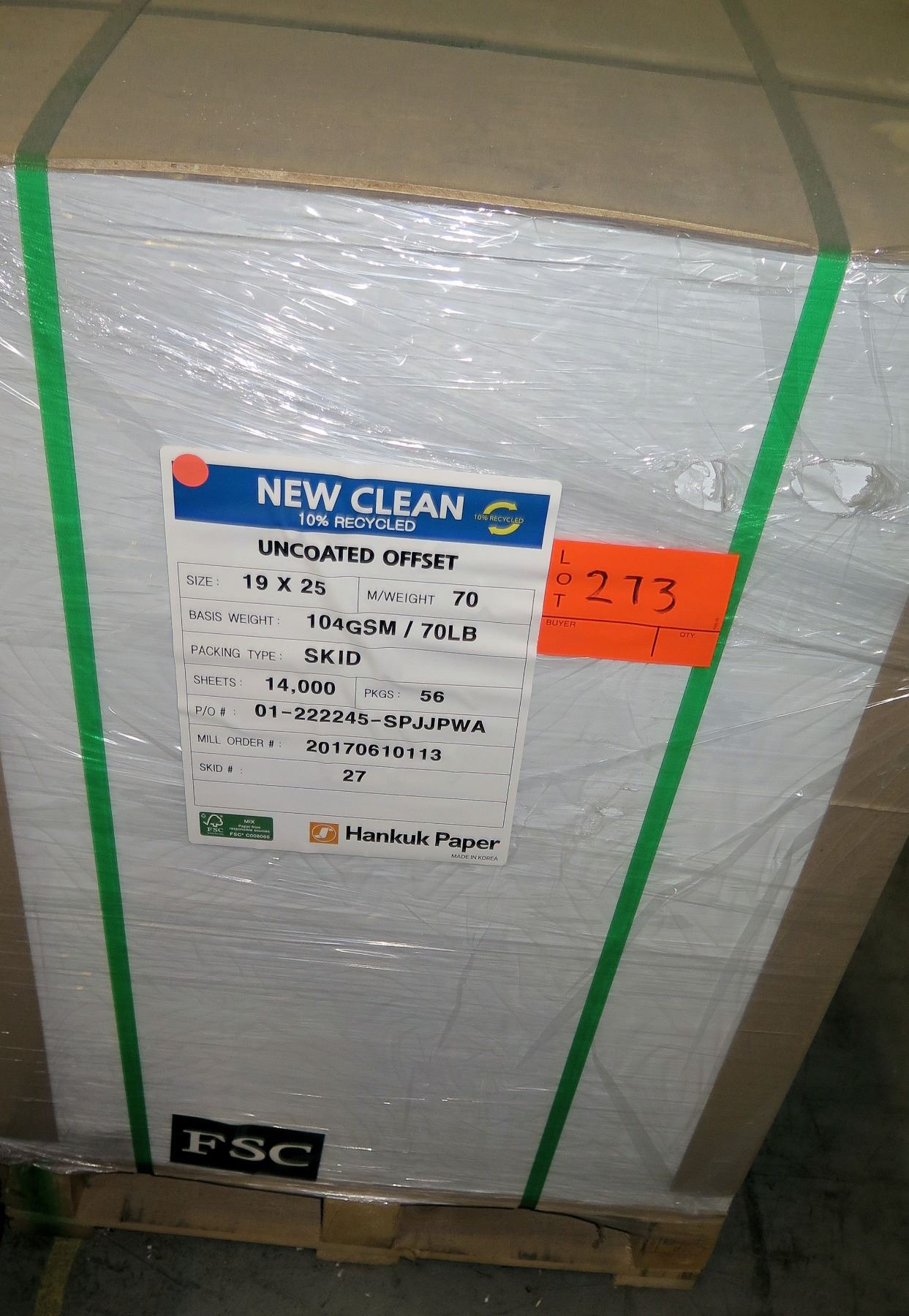 Qty 1 Pallet Hankuk New Clean Uncoated Offset 19 x 25 Paper 14,000 Sheets
