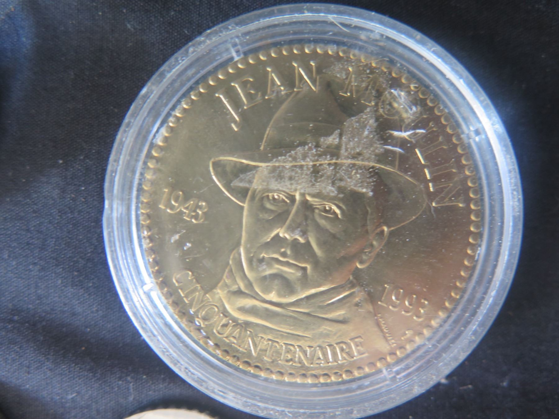 Qty 10 Medals & Coins: Jacques Cousteau, Jean Moulin, Francs, Pin, etc