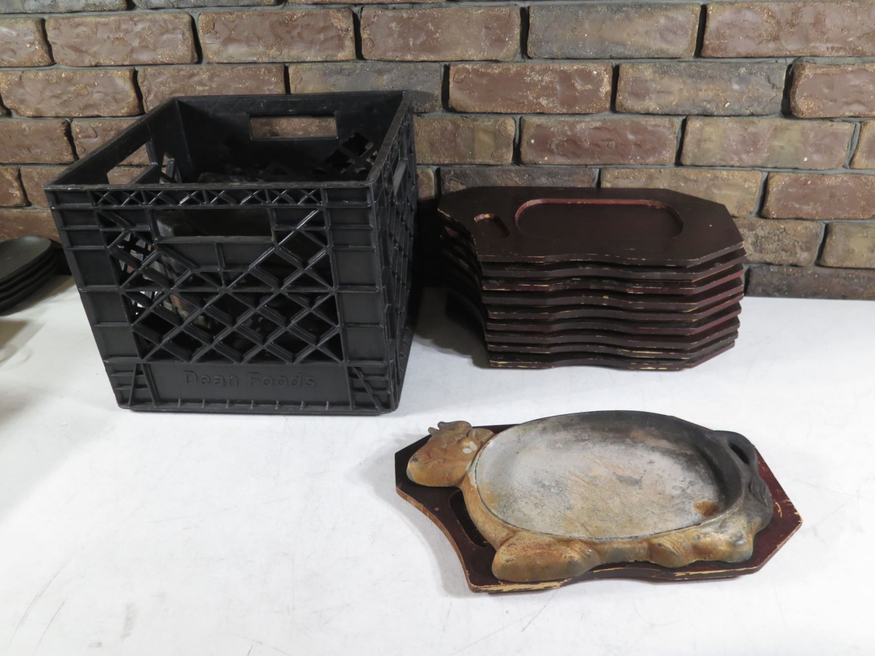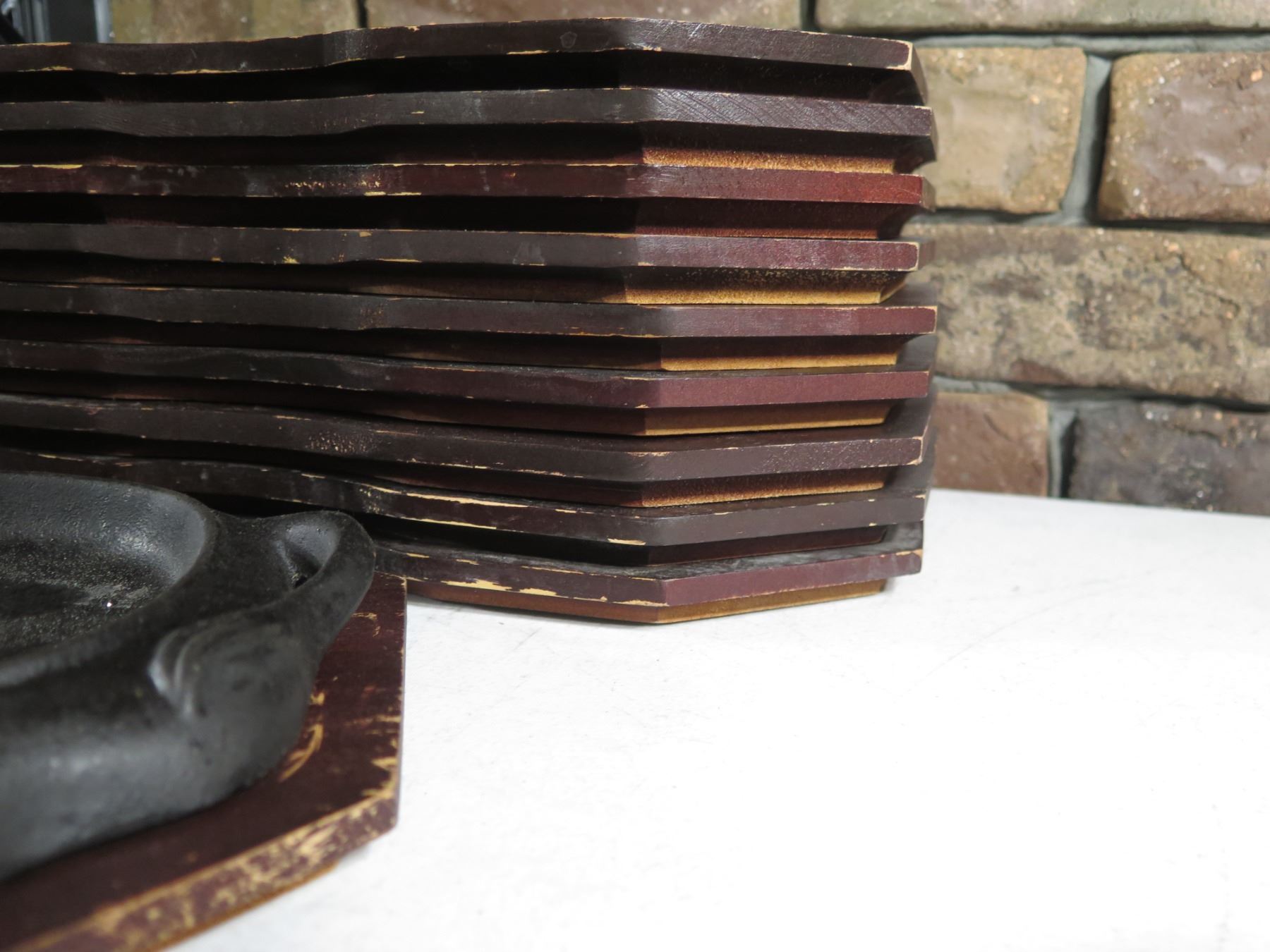 Qty 10 Metal Steak Plates w/ Wooden Bases & Maker's Marks