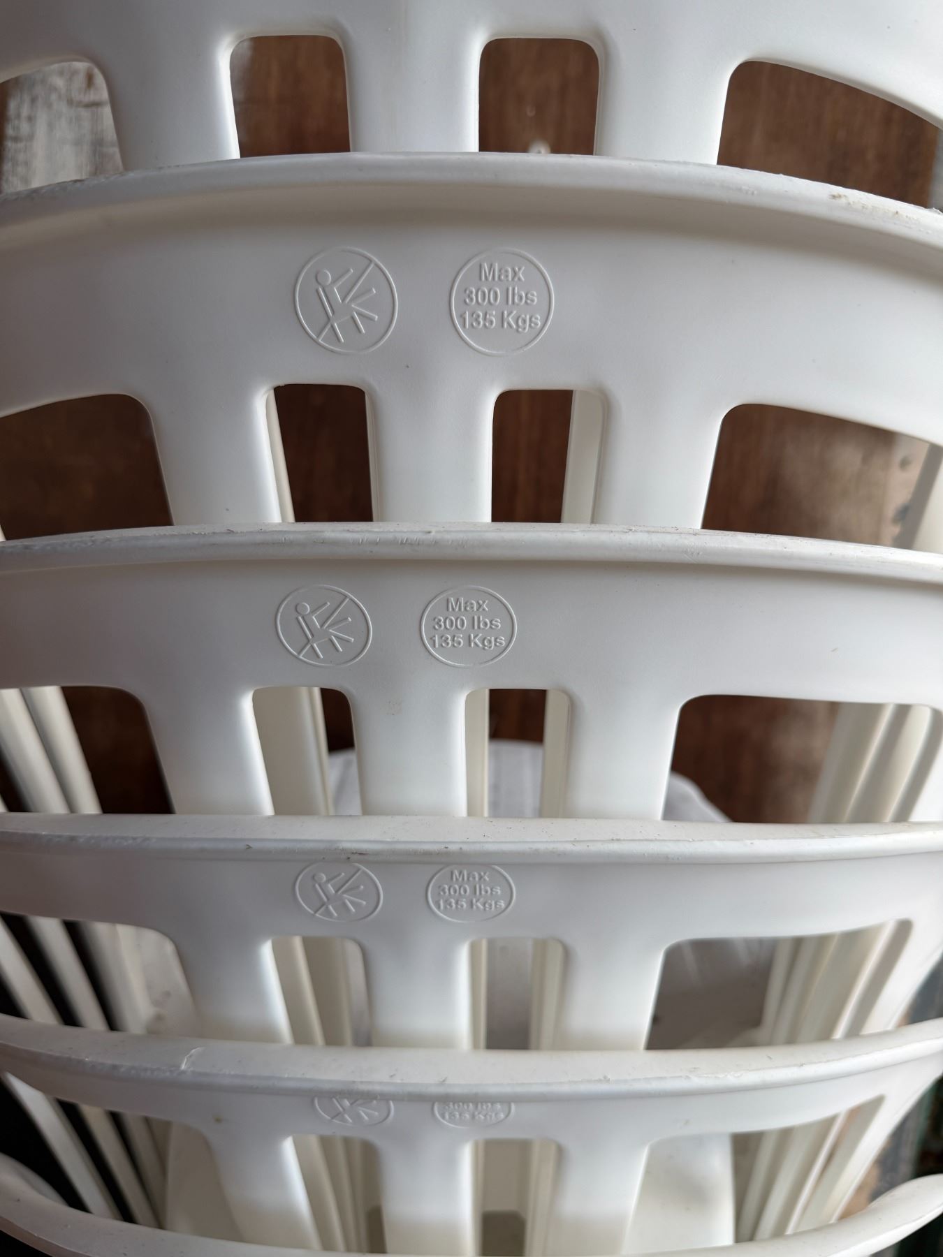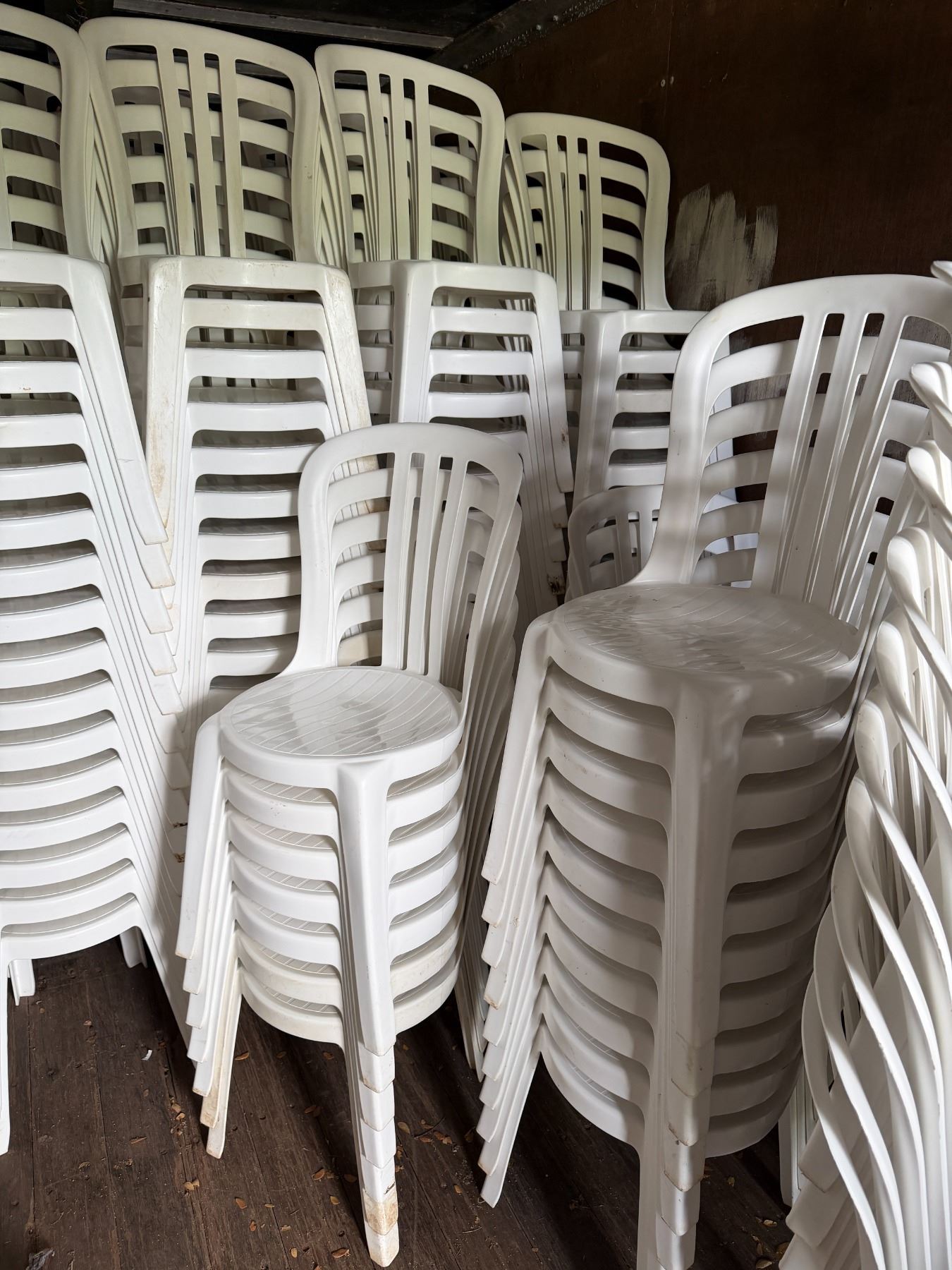 Qty 100 Grosfillex White Miami Bistro Stacking Side Chairs (retail $41/ea) 15  x 15  x 34 H