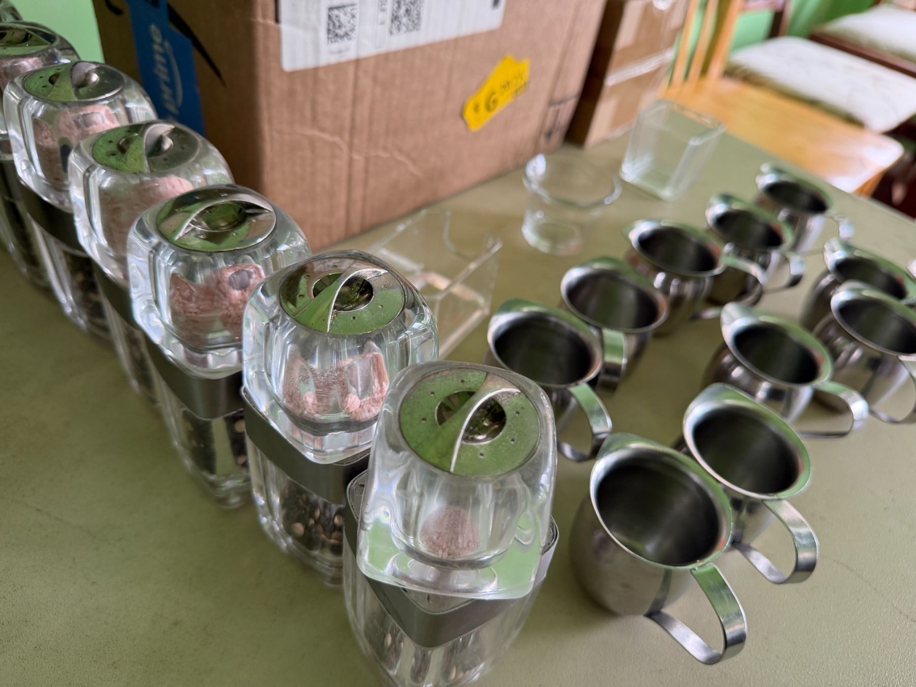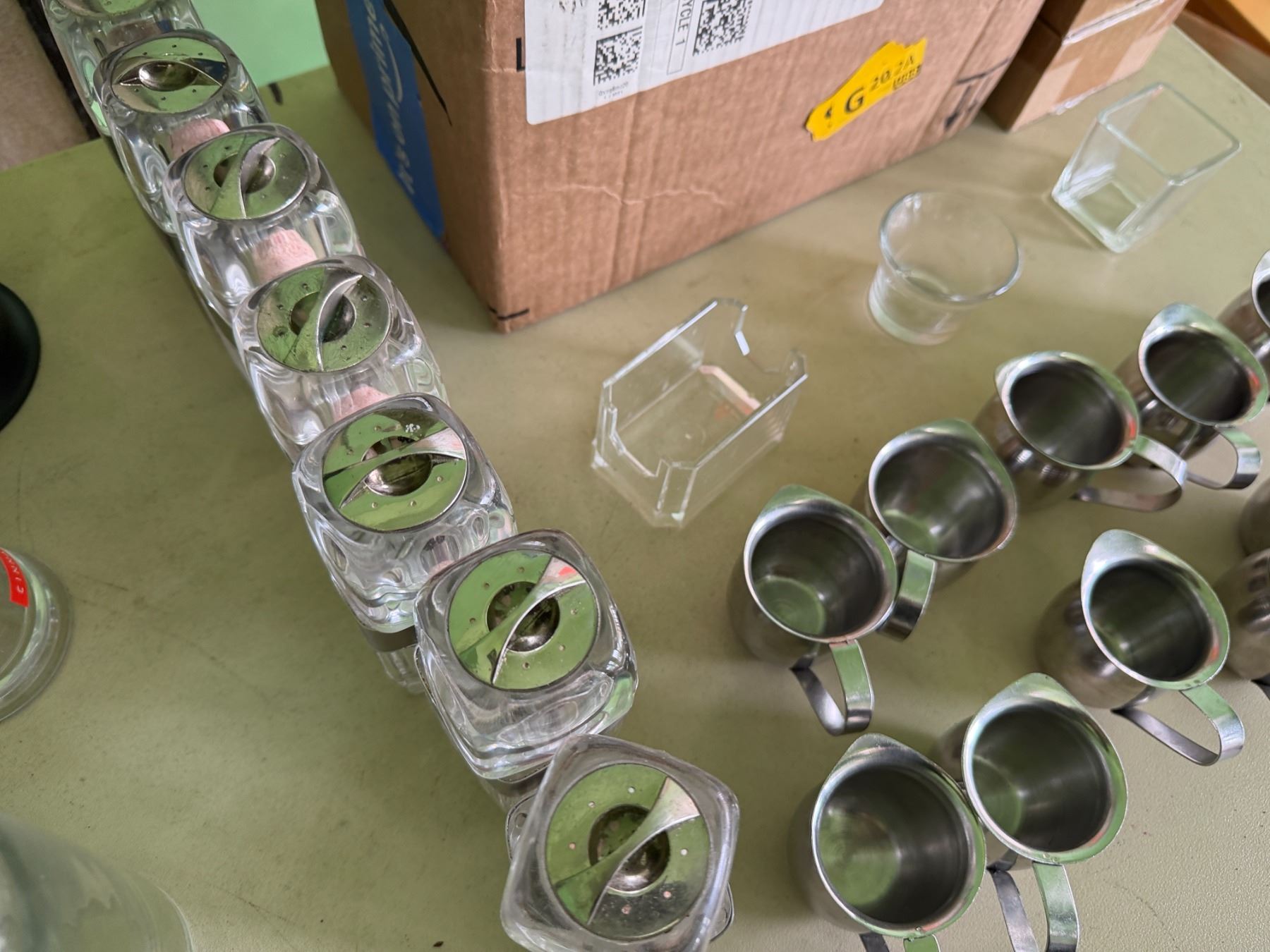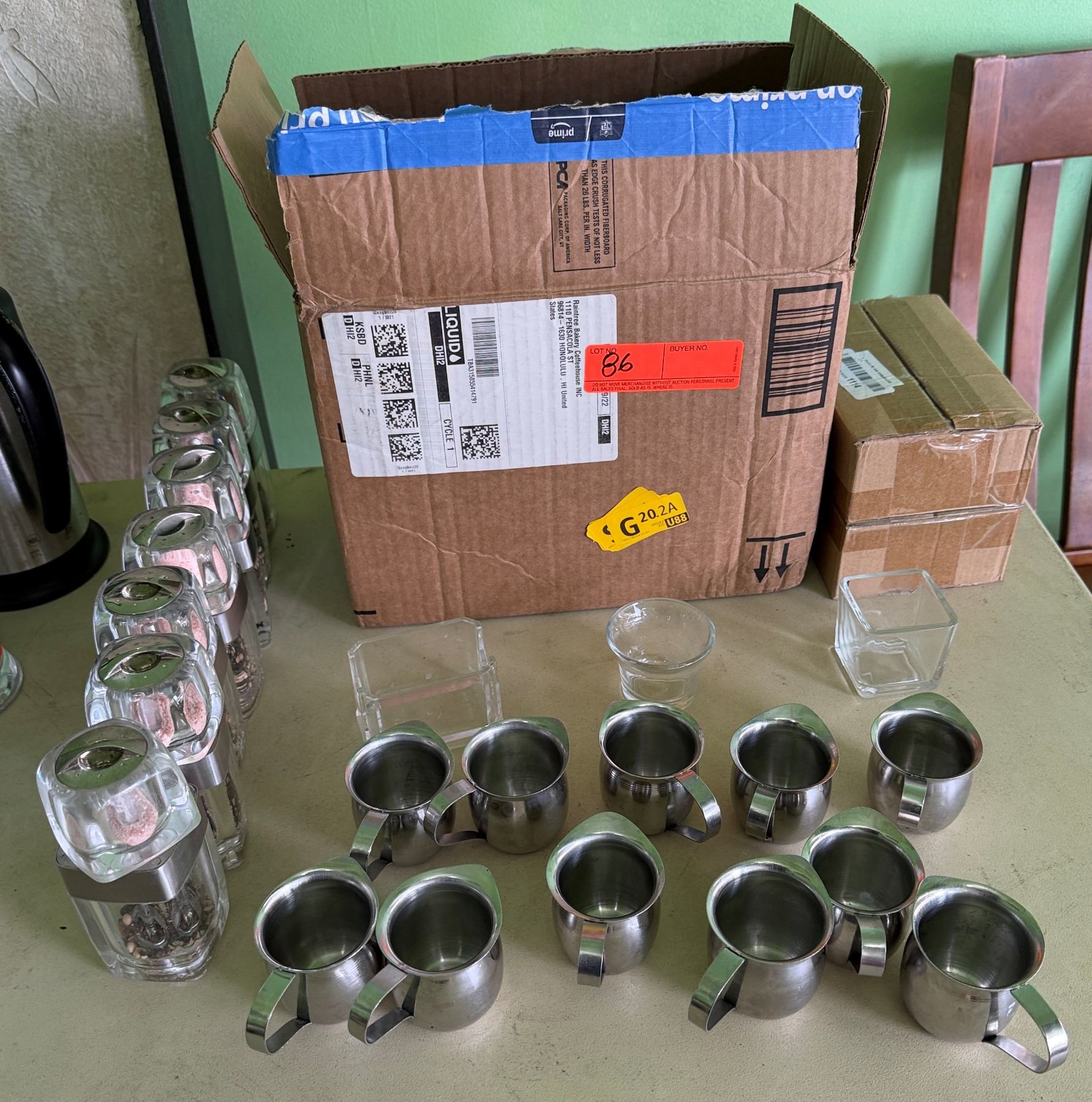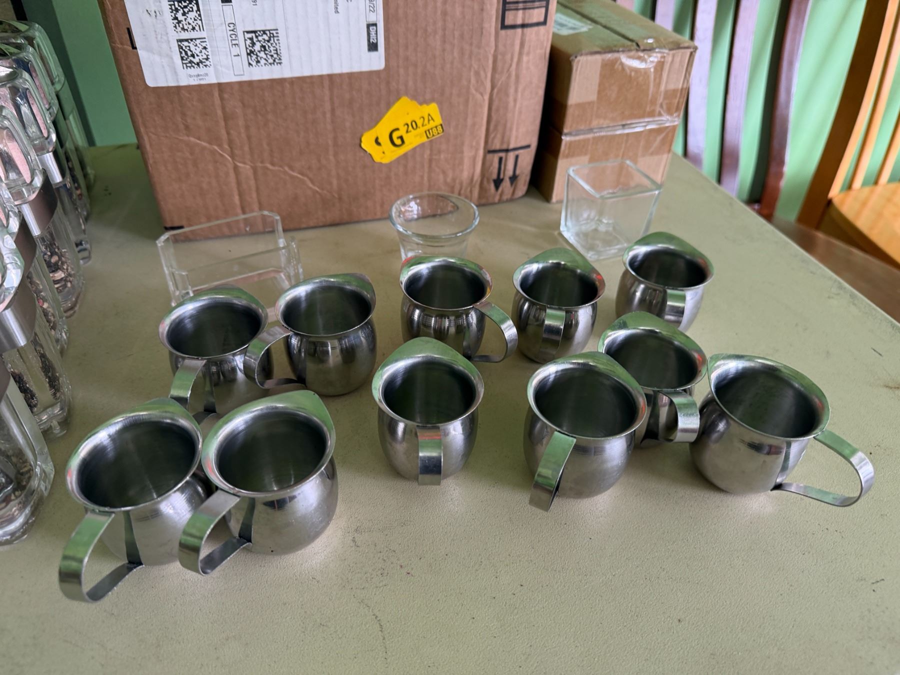 Qty 11 Metal Cream Pitchers, 7 Salt & Pepper Grinders, Glass Condiment Containers, etc Misc Sizes