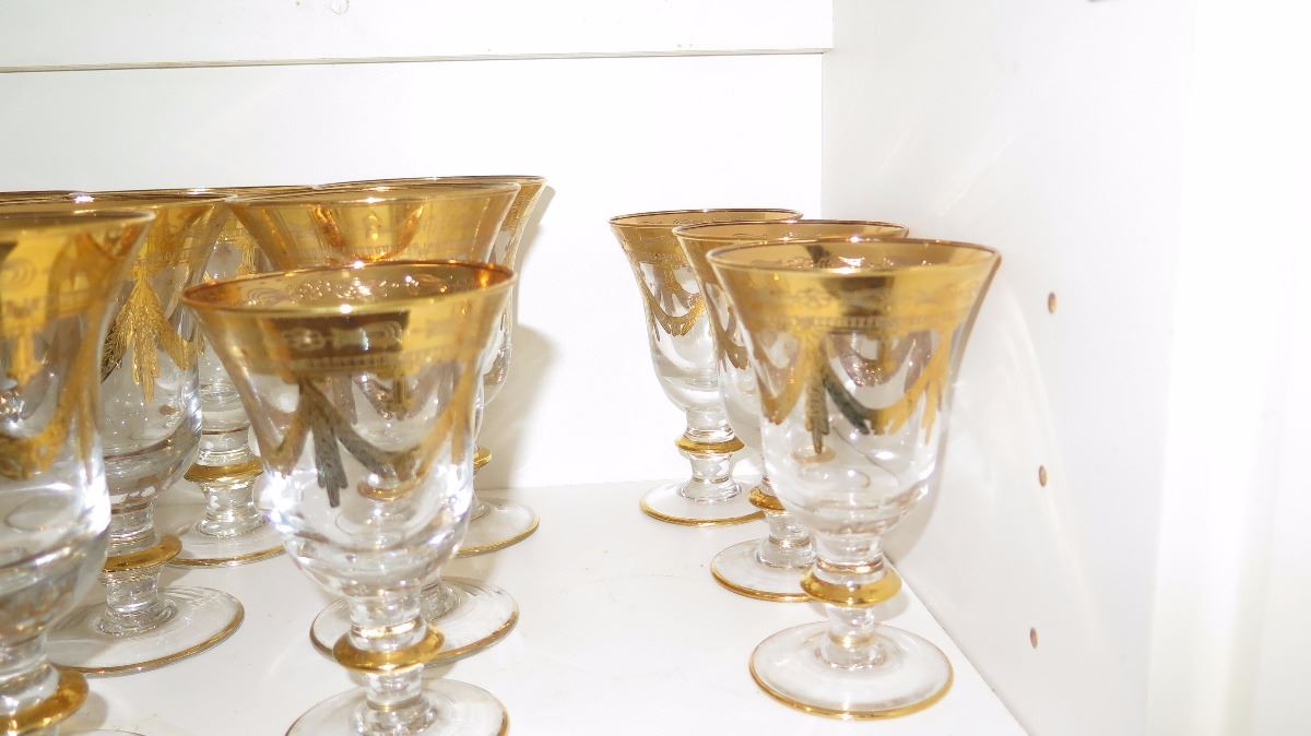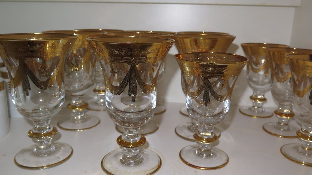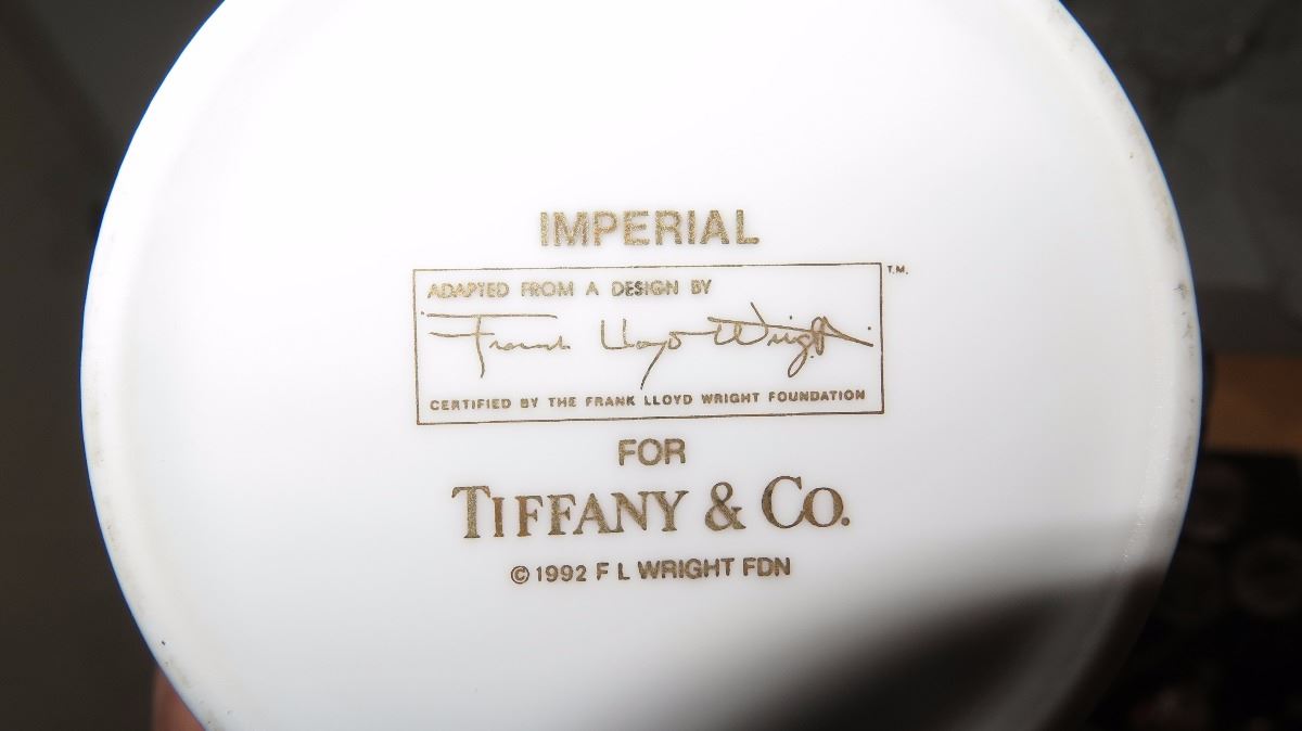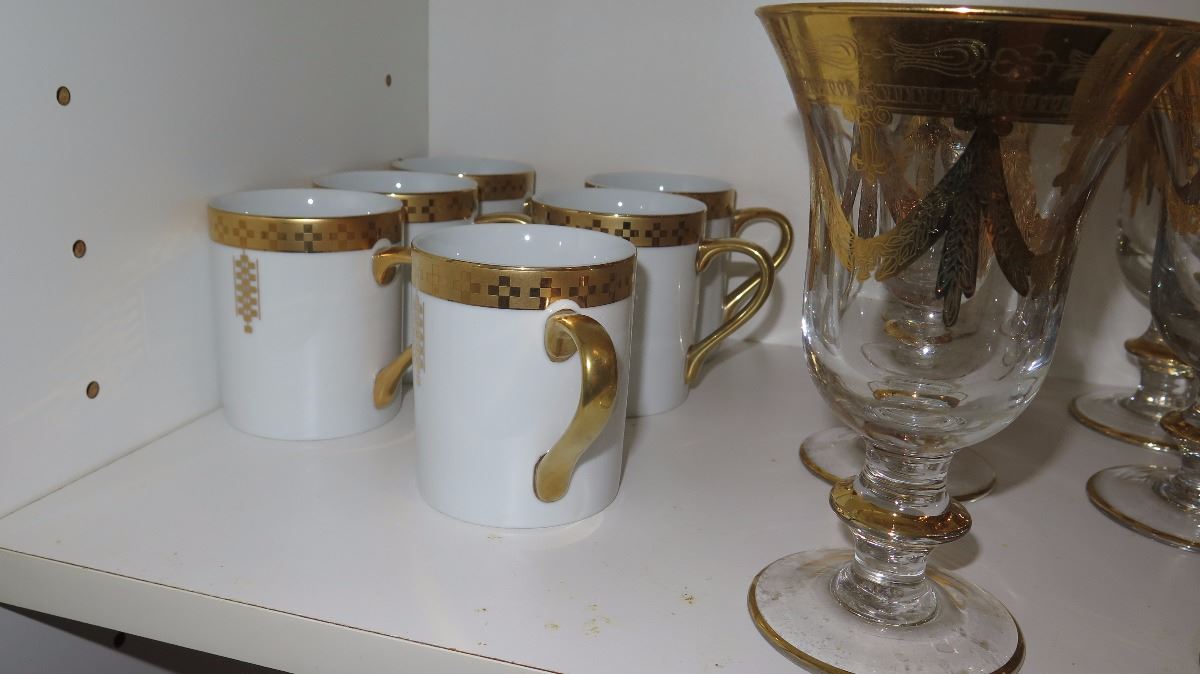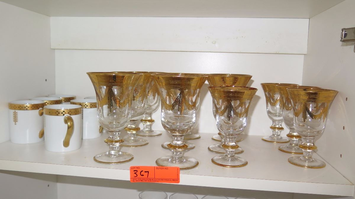 Qty 12 Clear Crystal Stemware w/Swag Gilt Overlay & Tiffany & Co. (Frank Lloyd Wright) Mugs