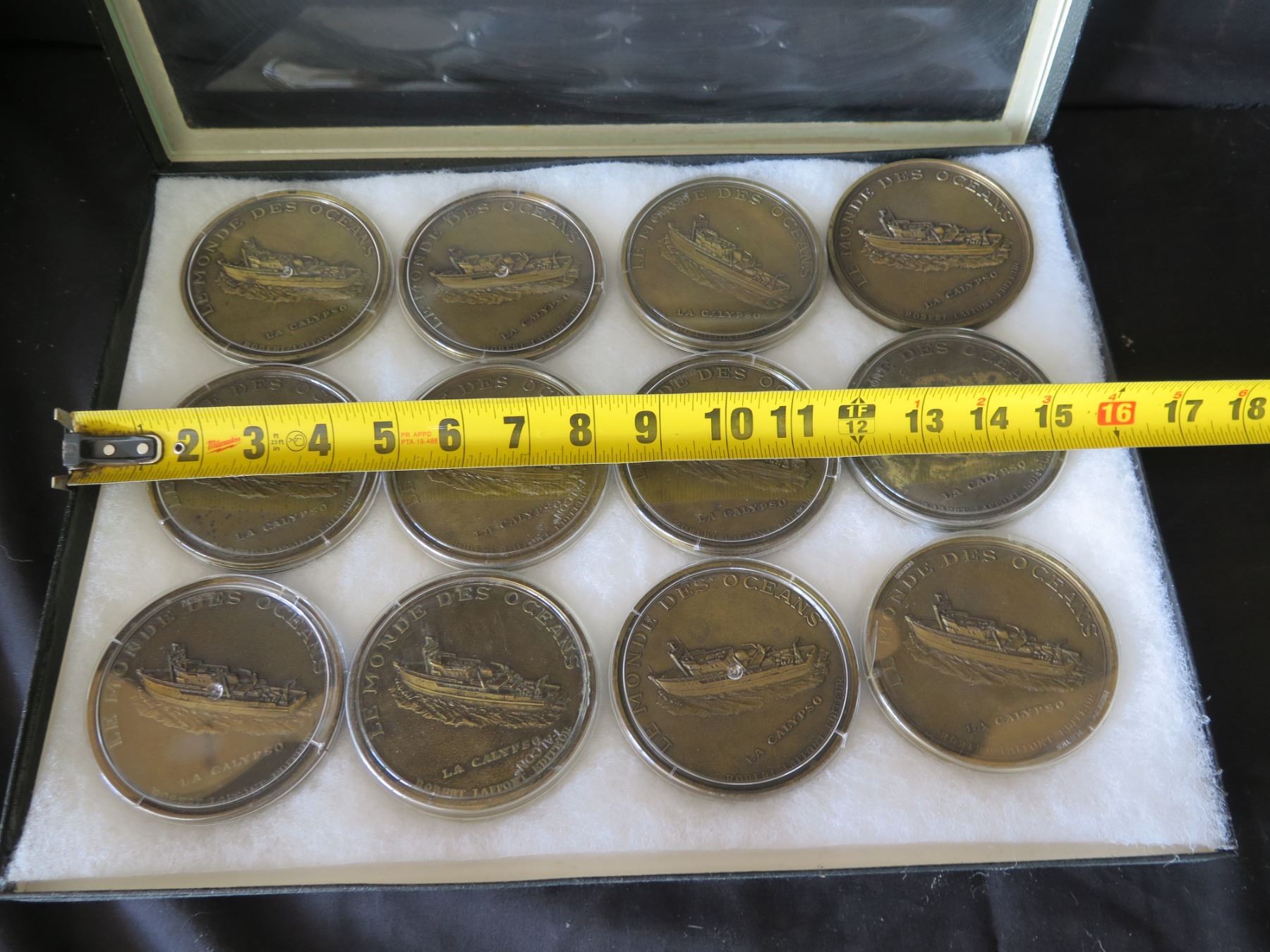 Qty 12 Large Coins Comandant Jacques Yves Cousteau La Calypso in Display Case 16"L