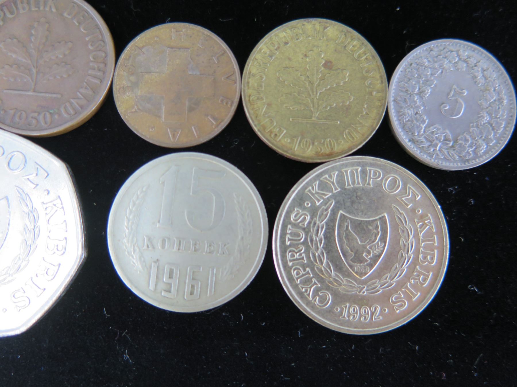 Qty 13 Loose Coins: French Francs, German Pfenning, Russian CCCP, Cypress Kyiipoe, etc