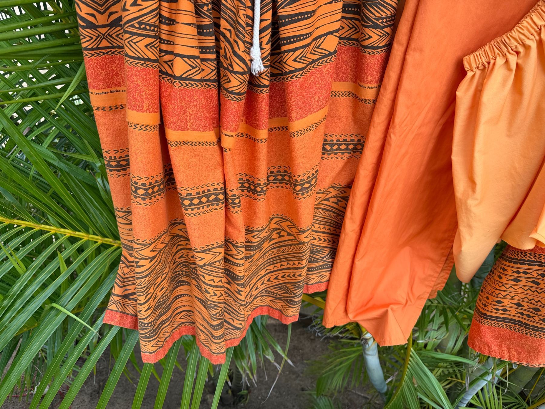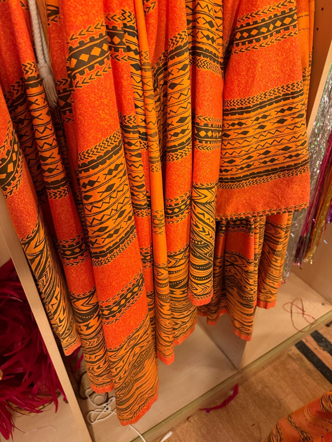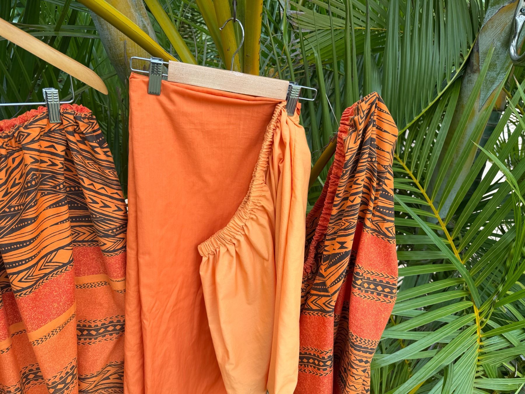 Qty 13 Orange Patterned Costume Pieces: Skirts, Slips & Tops