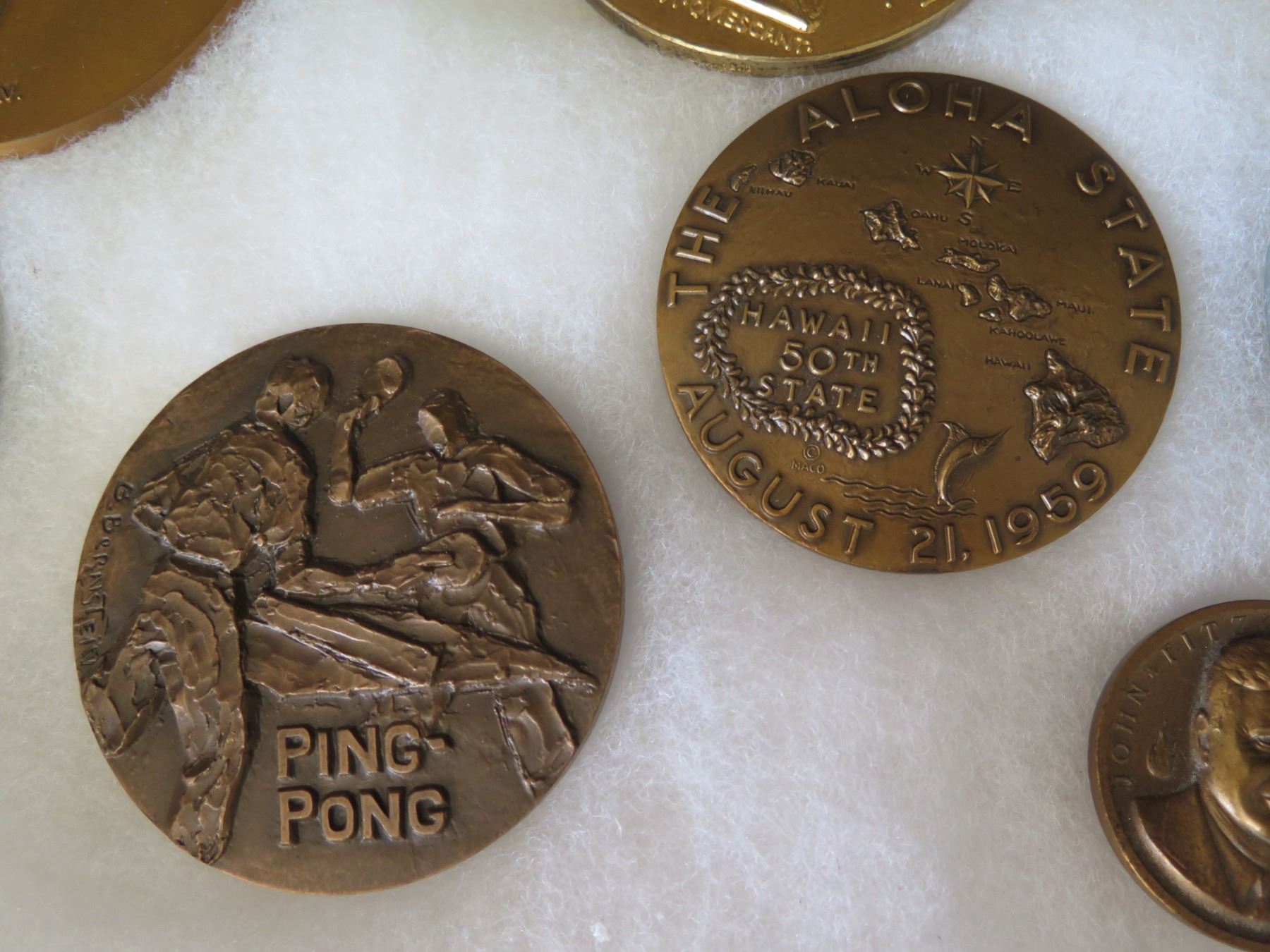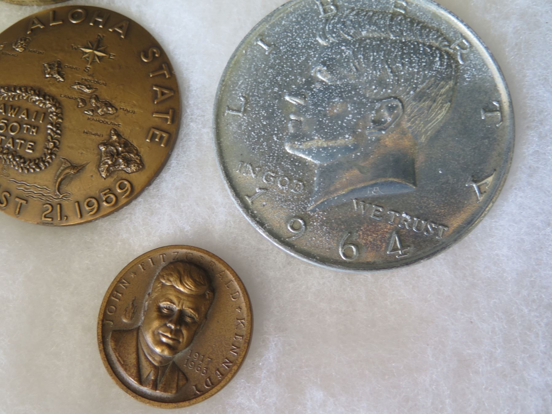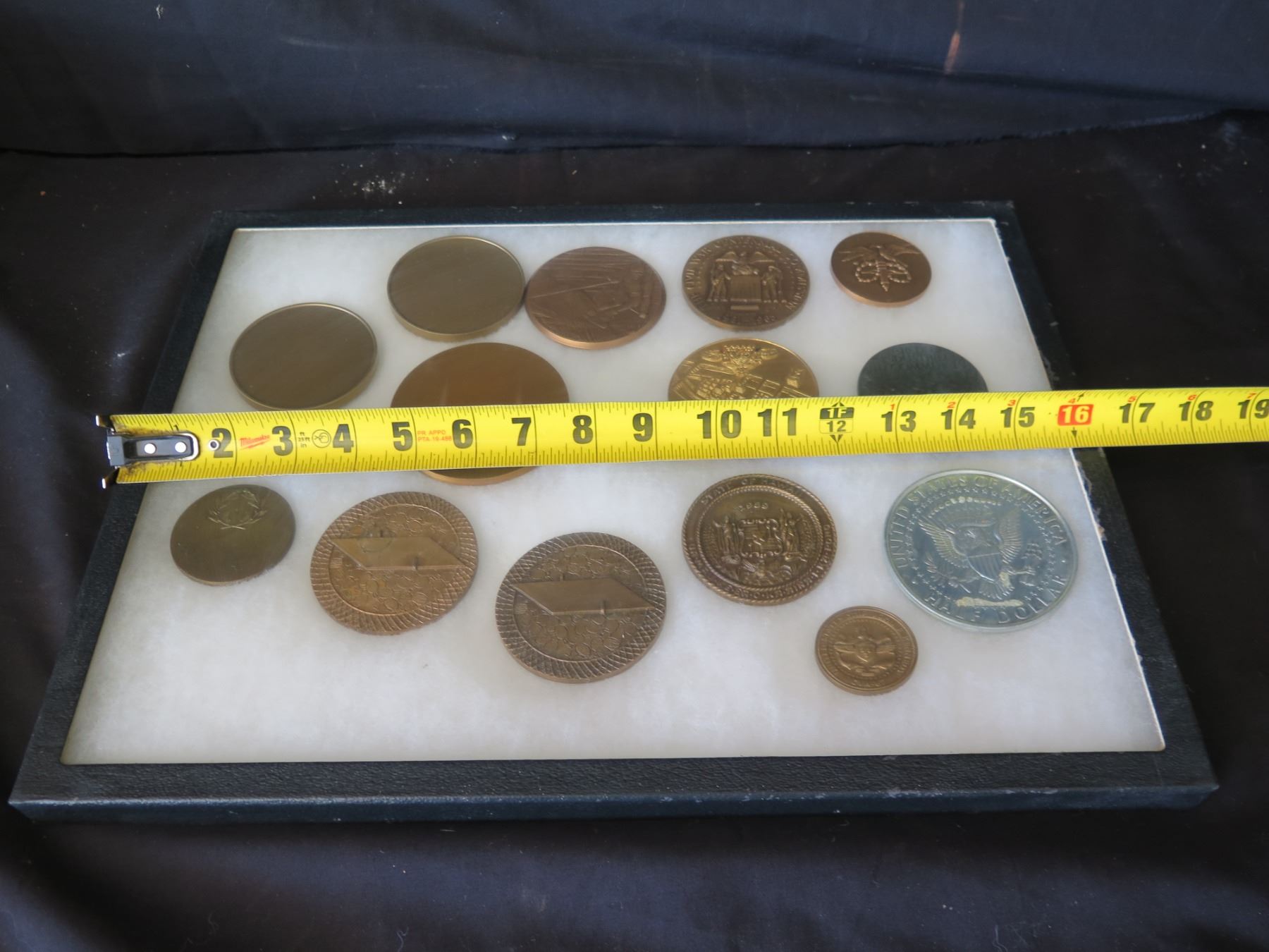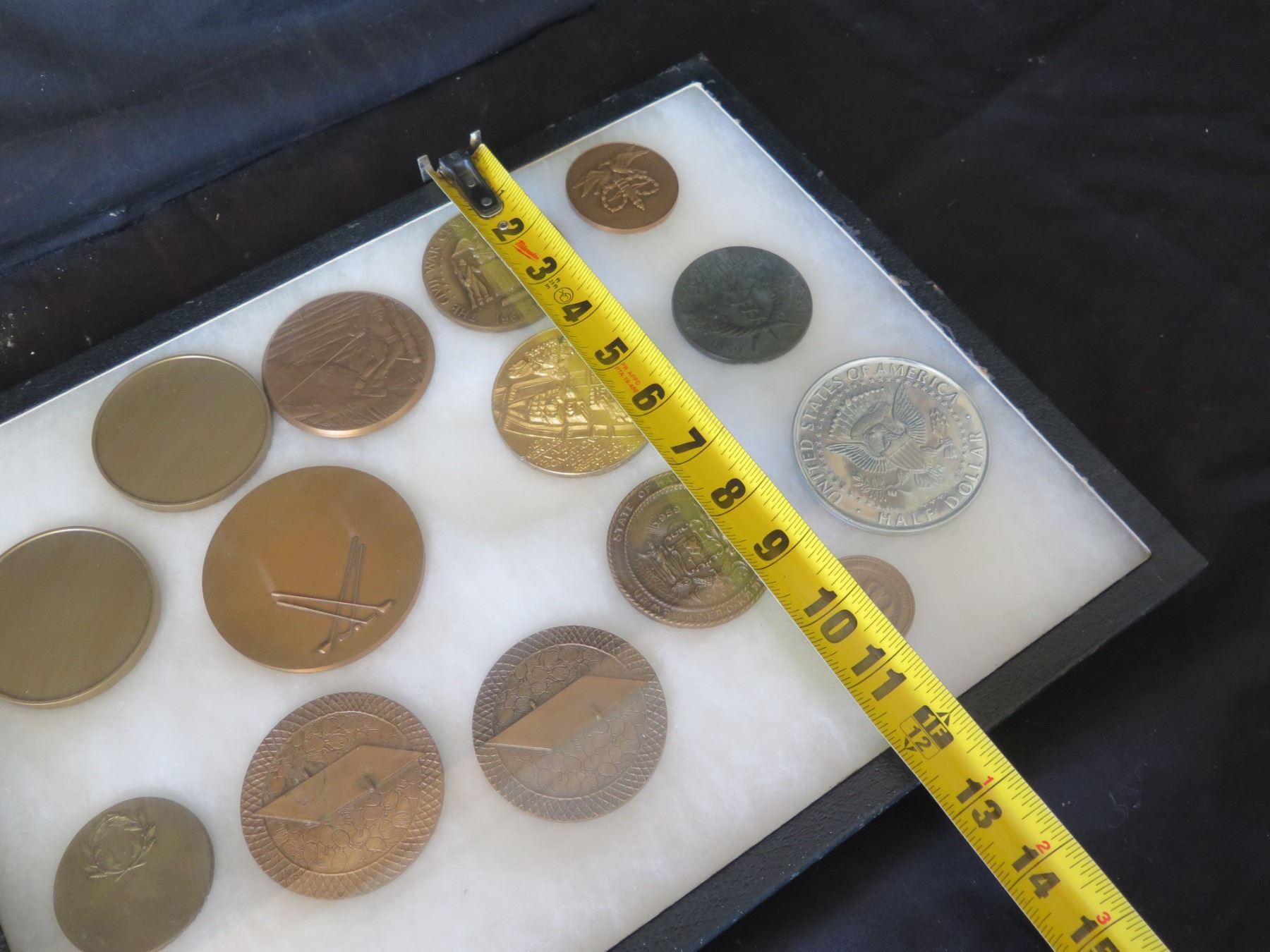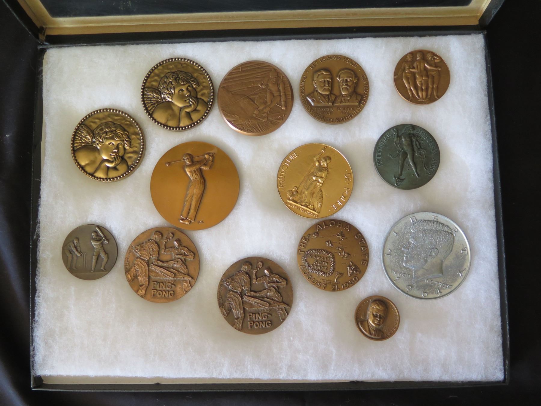 Qty 14 Medallions & Coins: Athletes, Cupid, Aloha State, Kennedy 1964, etc in Display Case 16"L