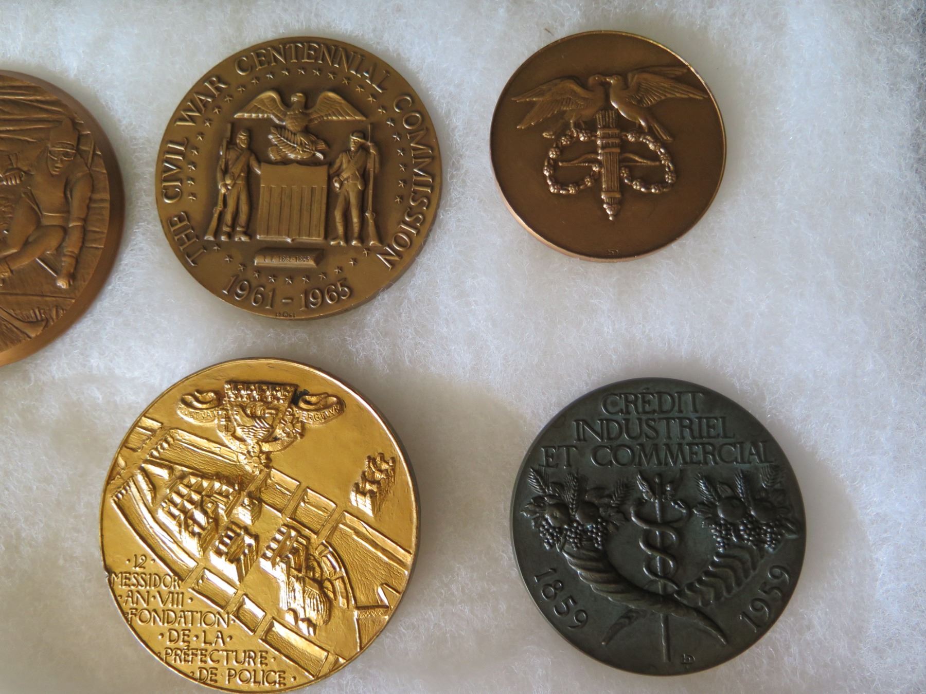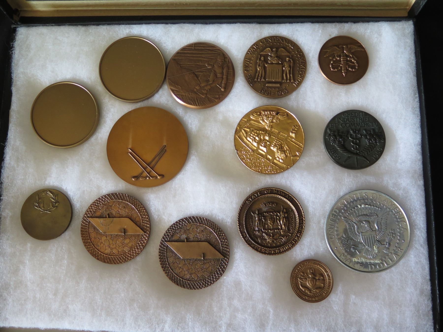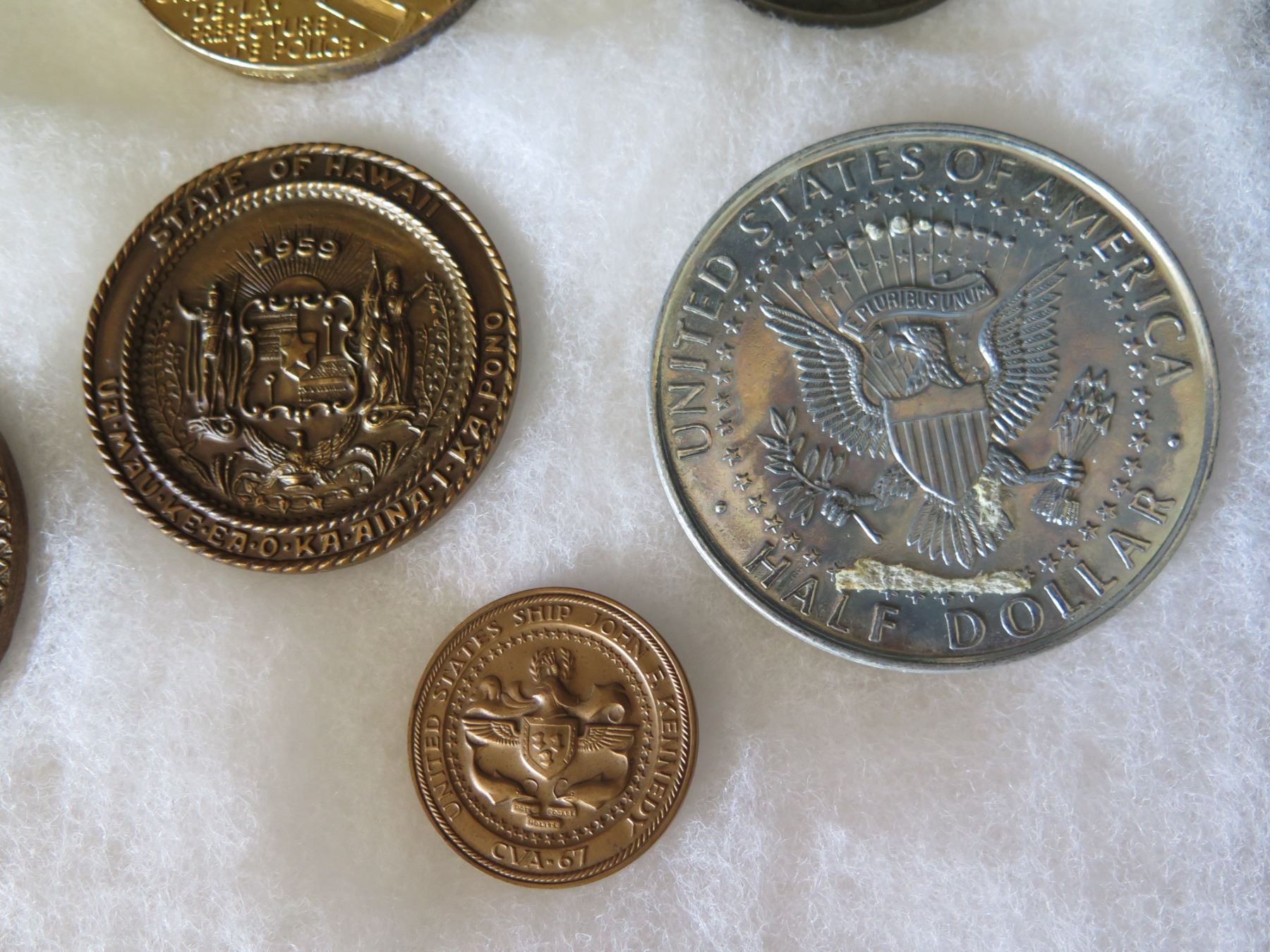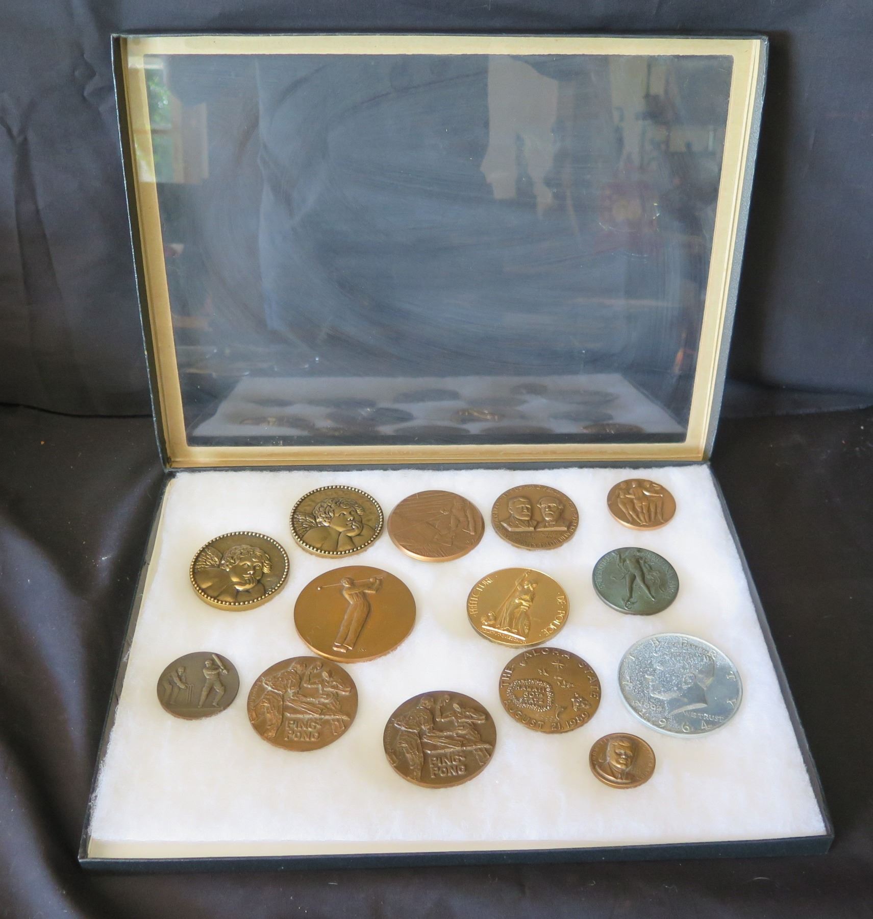Qty 14 Medallions & Coins: Athletes, Cupid, Aloha State, Kennedy 1964, etc in Display Case 16"L