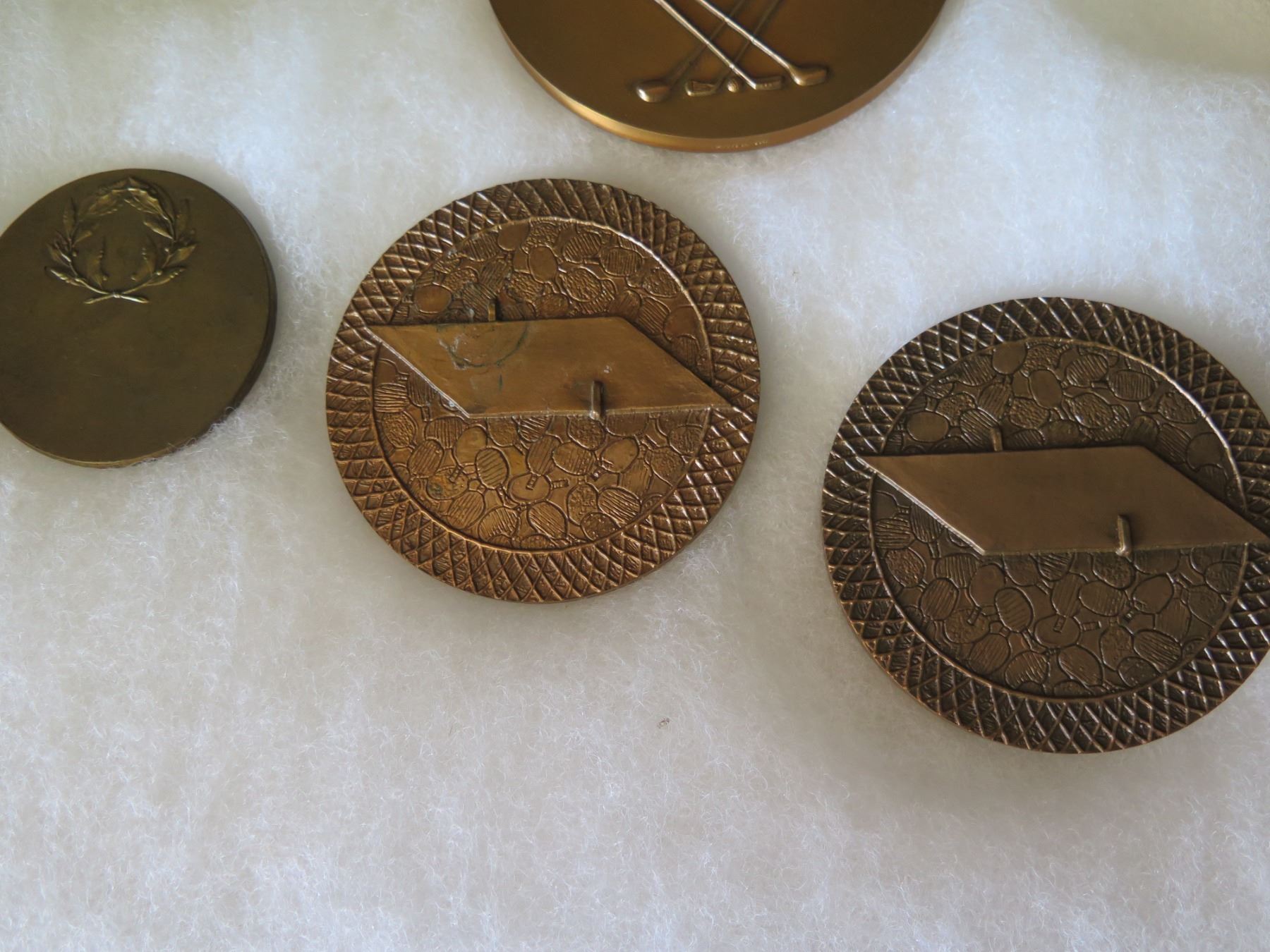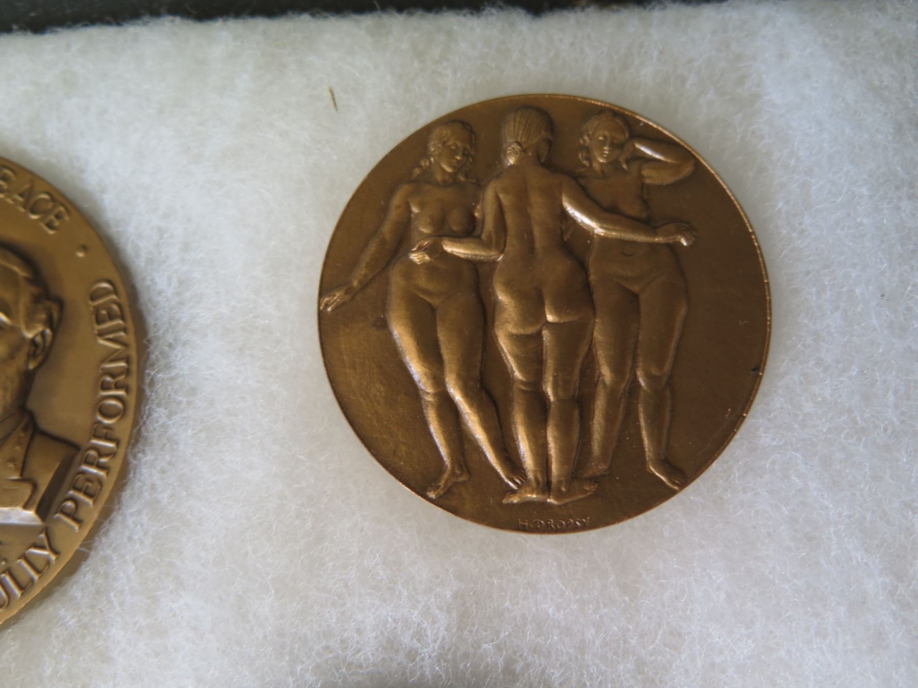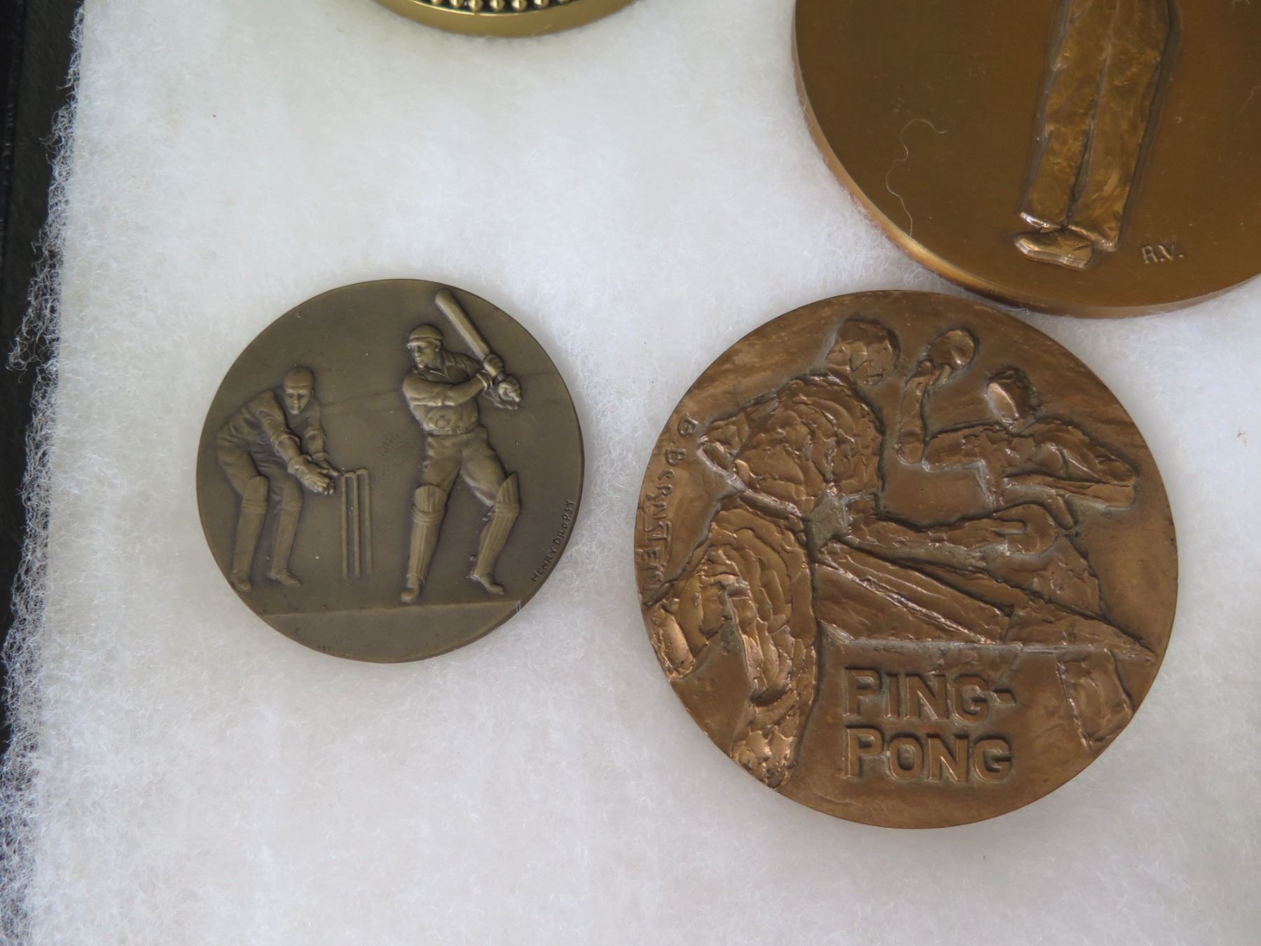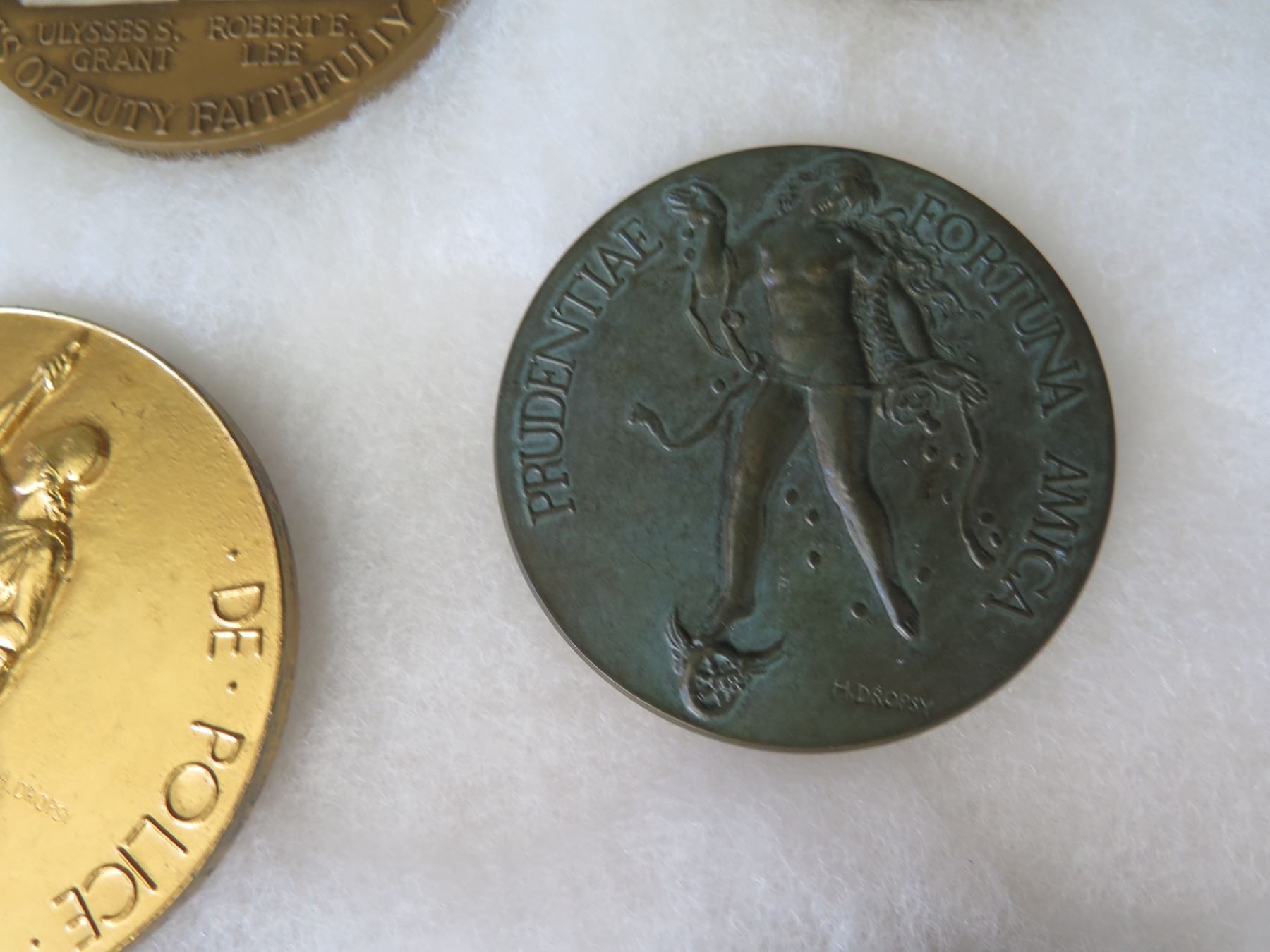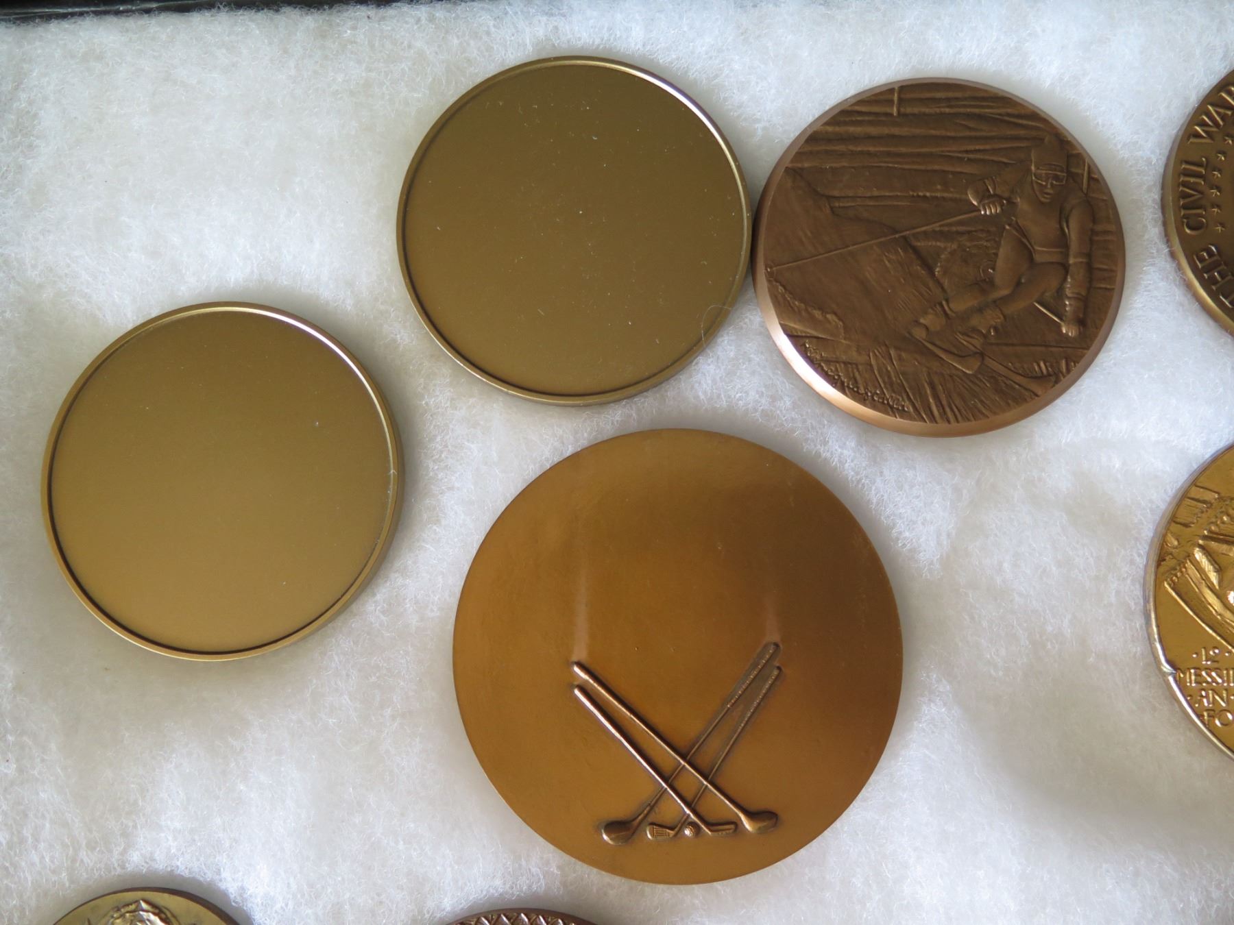 Qty 14 Medallions & Coins: Athletes, Cupid, Aloha State, Kennedy 1964, etc in Display Case 16"L