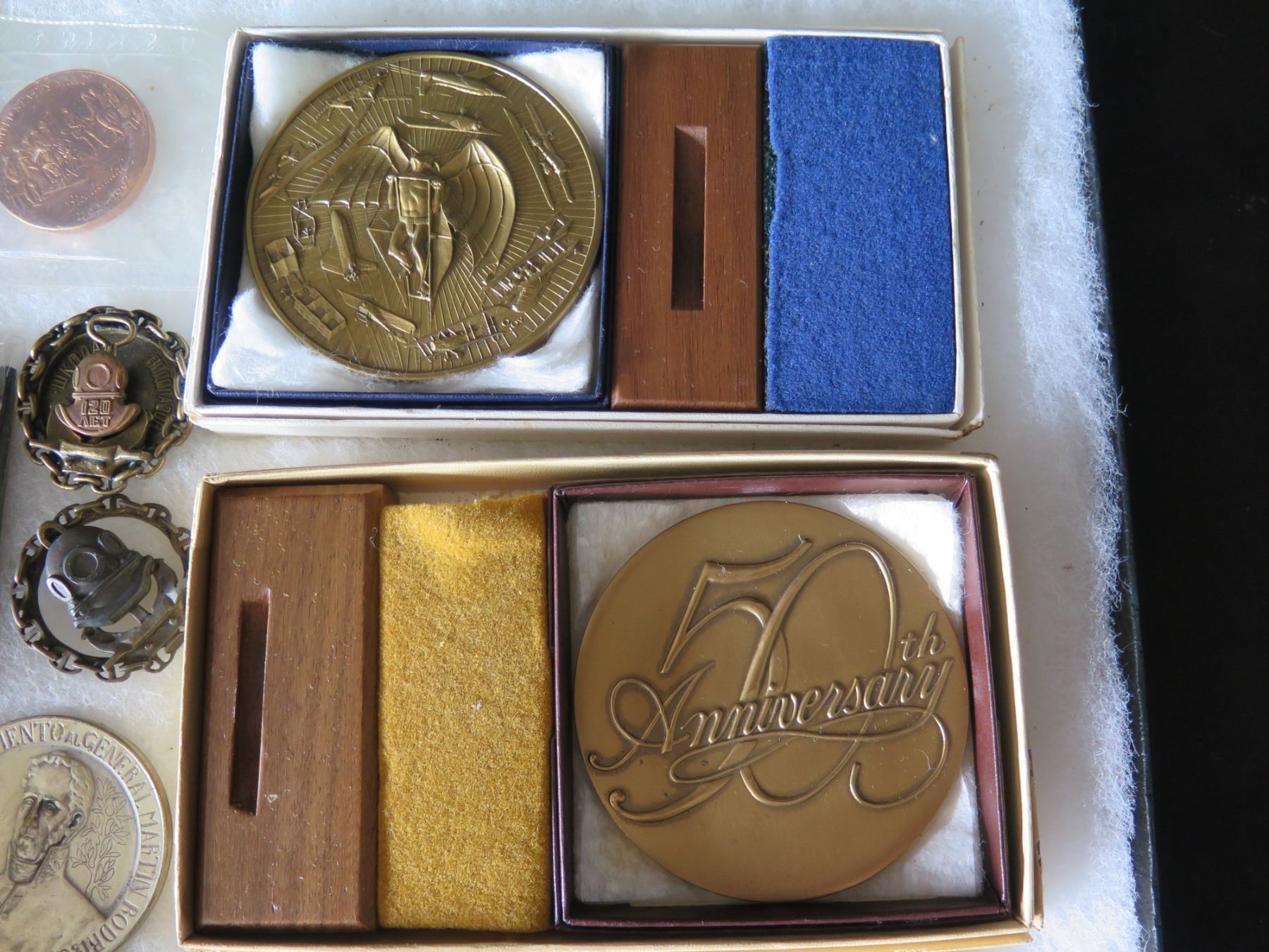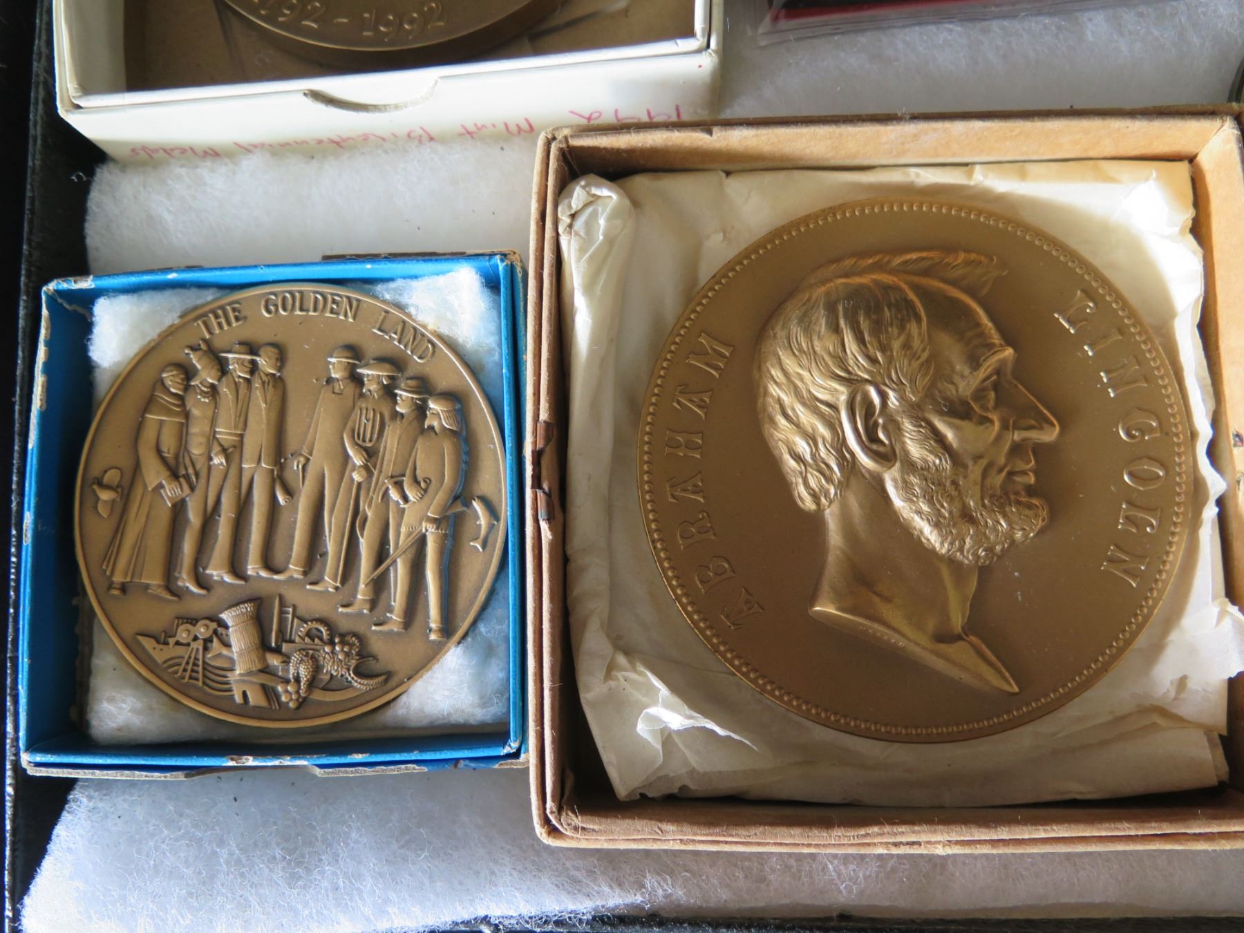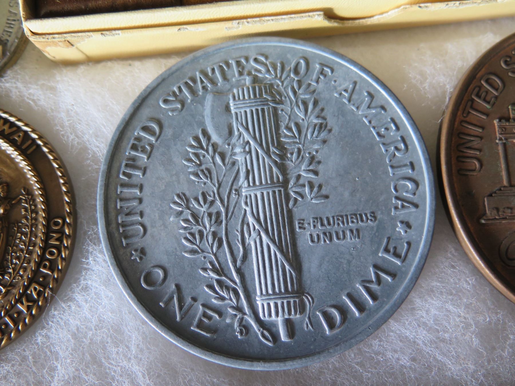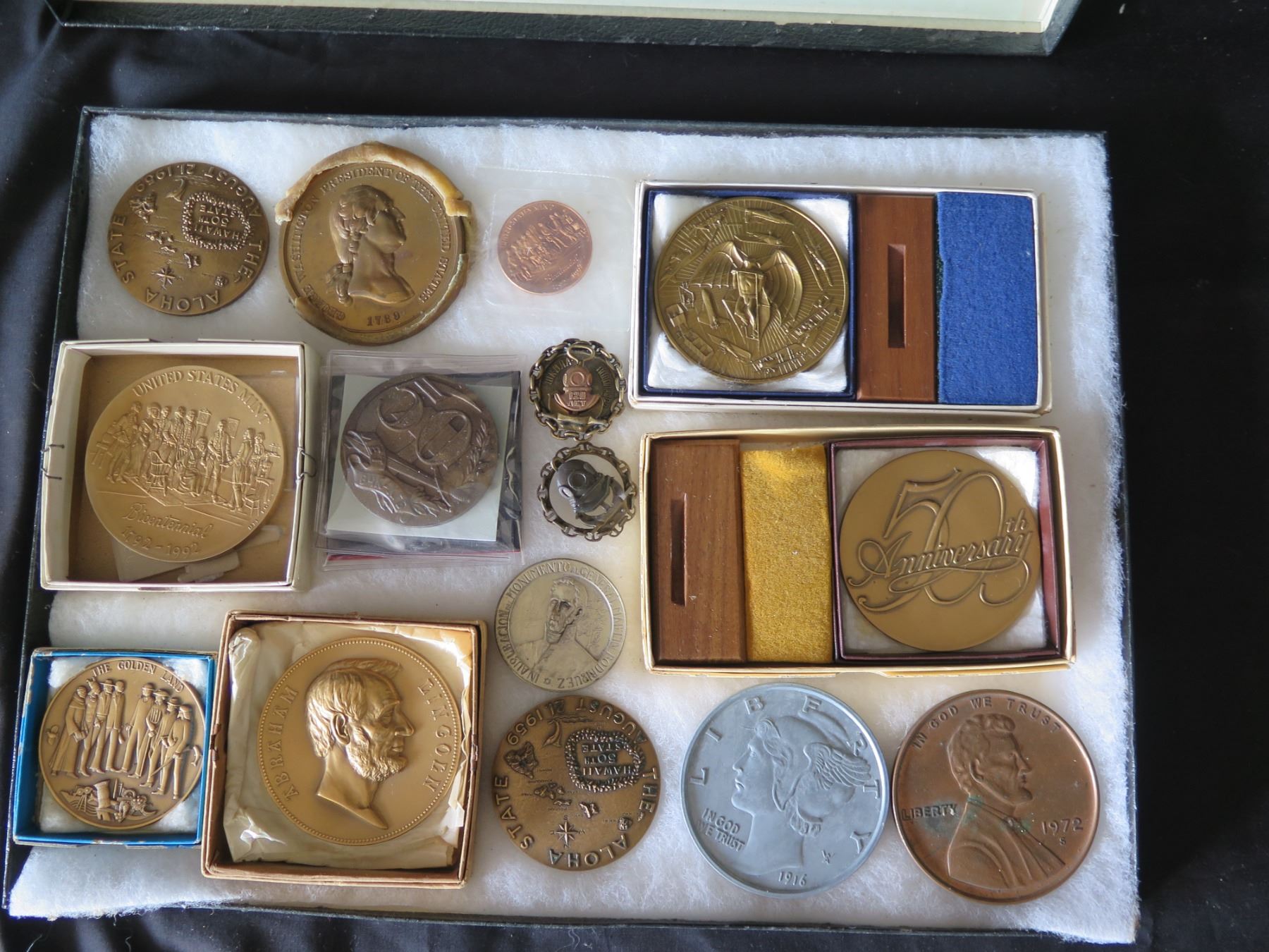 Qty 15 Medals & Coins: Bicentennial, Golden Land, 120 AET, Aloha State, etc in Display Case 16"L