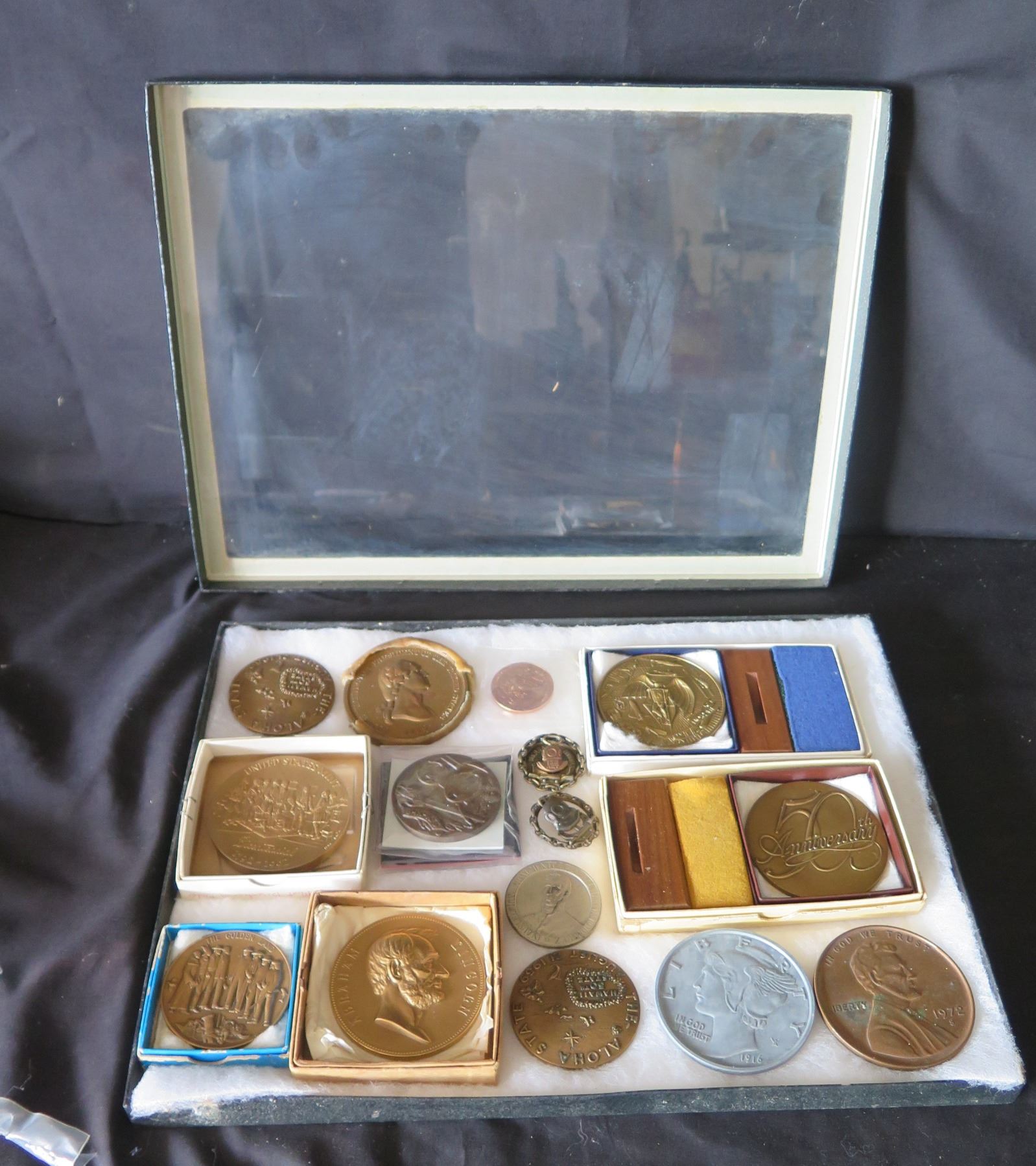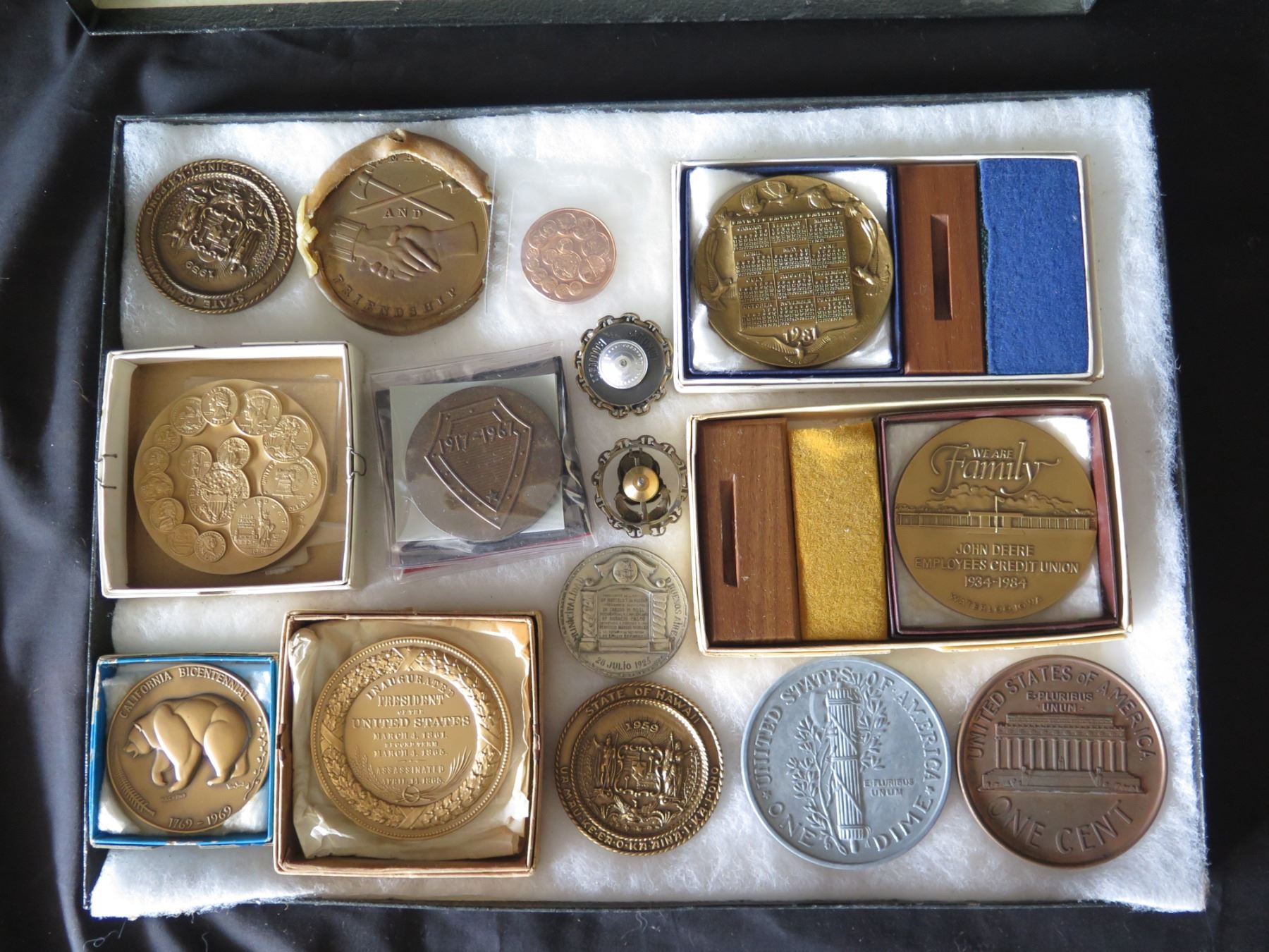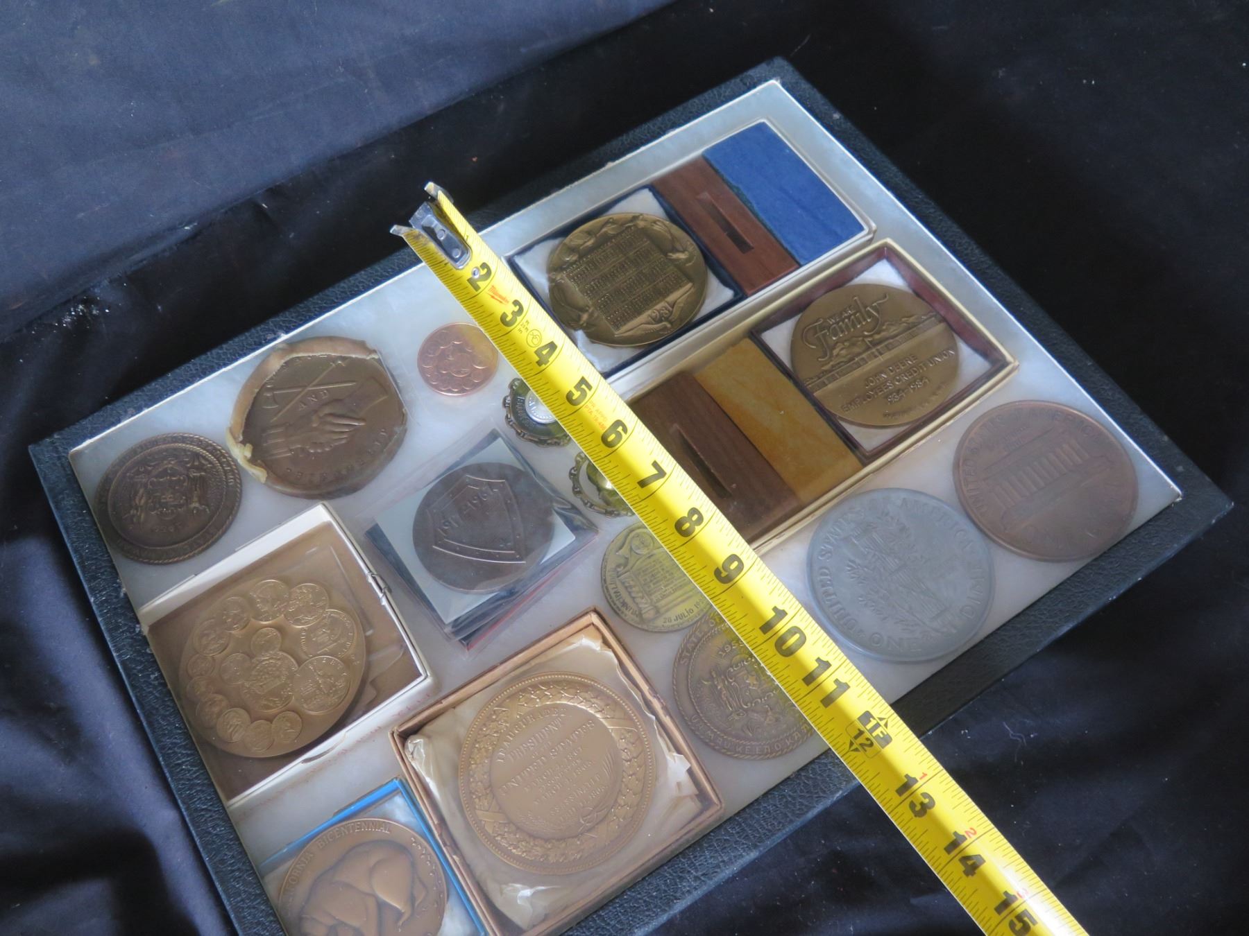 Qty 15 Medals & Coins: Bicentennial, Golden Land, 120 AET, Aloha State, etc in Display Case 16"L